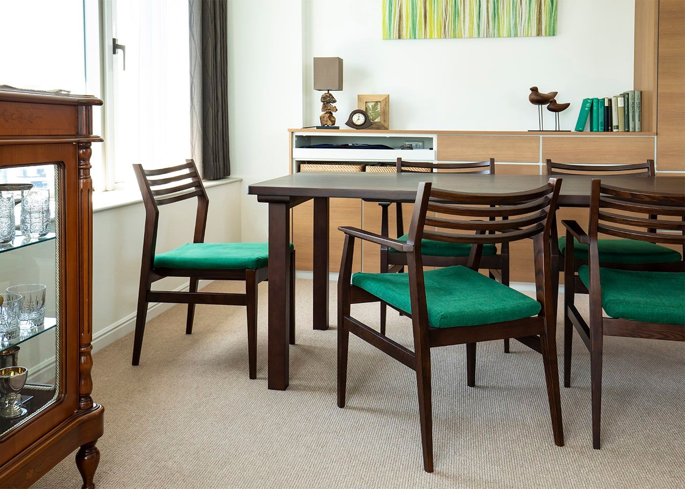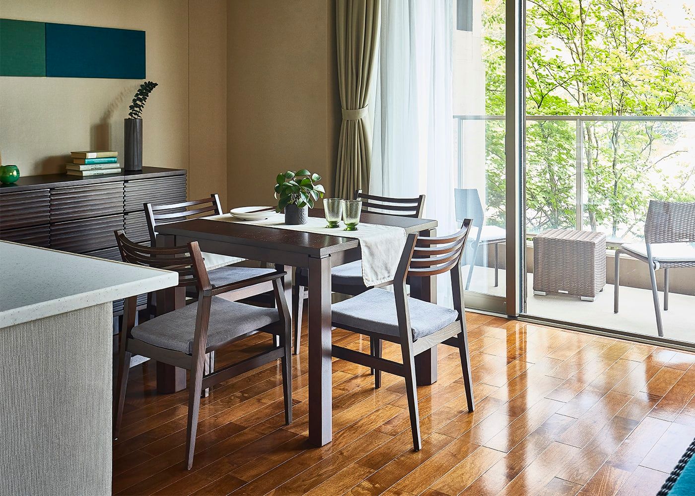 森のような澄んだ空気感や温もりを高層マンションの部屋に表現した実例。表情豊かな木目や木の風合い、滑らかな木の手触りを持った無垢材家具にグリーンのチェアカバーが映えます。