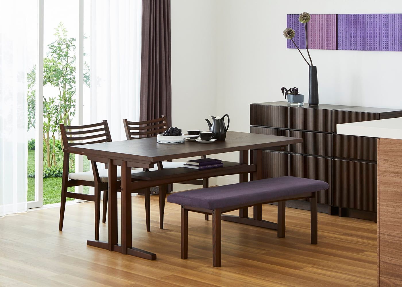 ダークブラウンの家具で統一したダイニング空間に、スタイリッシュなウッド・ダイニングアームチェアが調和します。また、パープルでコーディネートすれば大人っぽい洗練されたダイニングで食事を楽しむことも可能です。(写真は