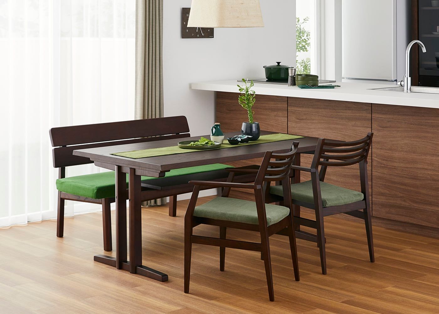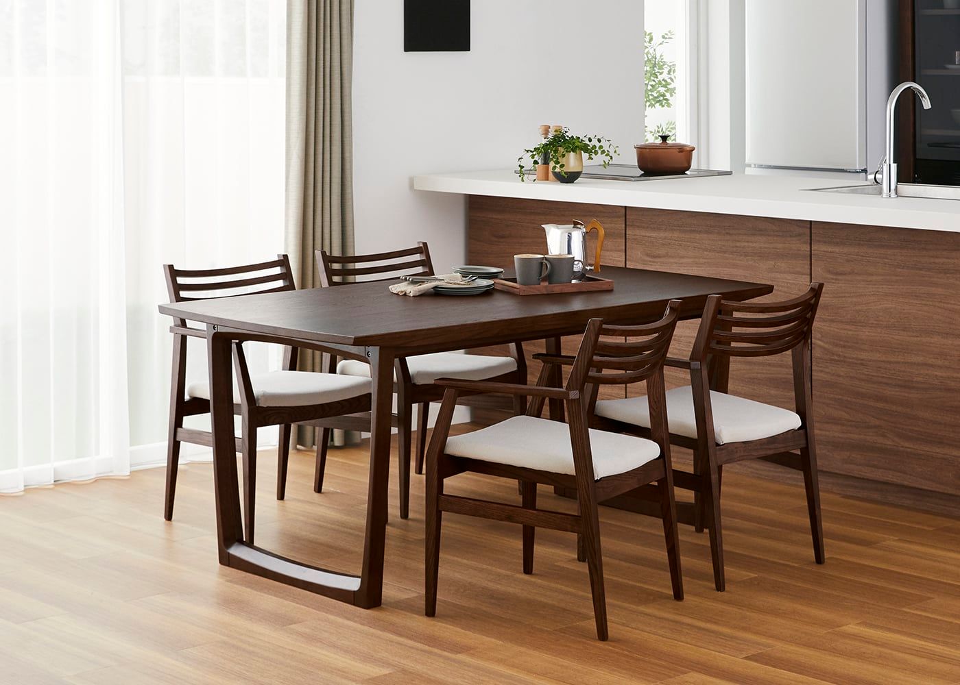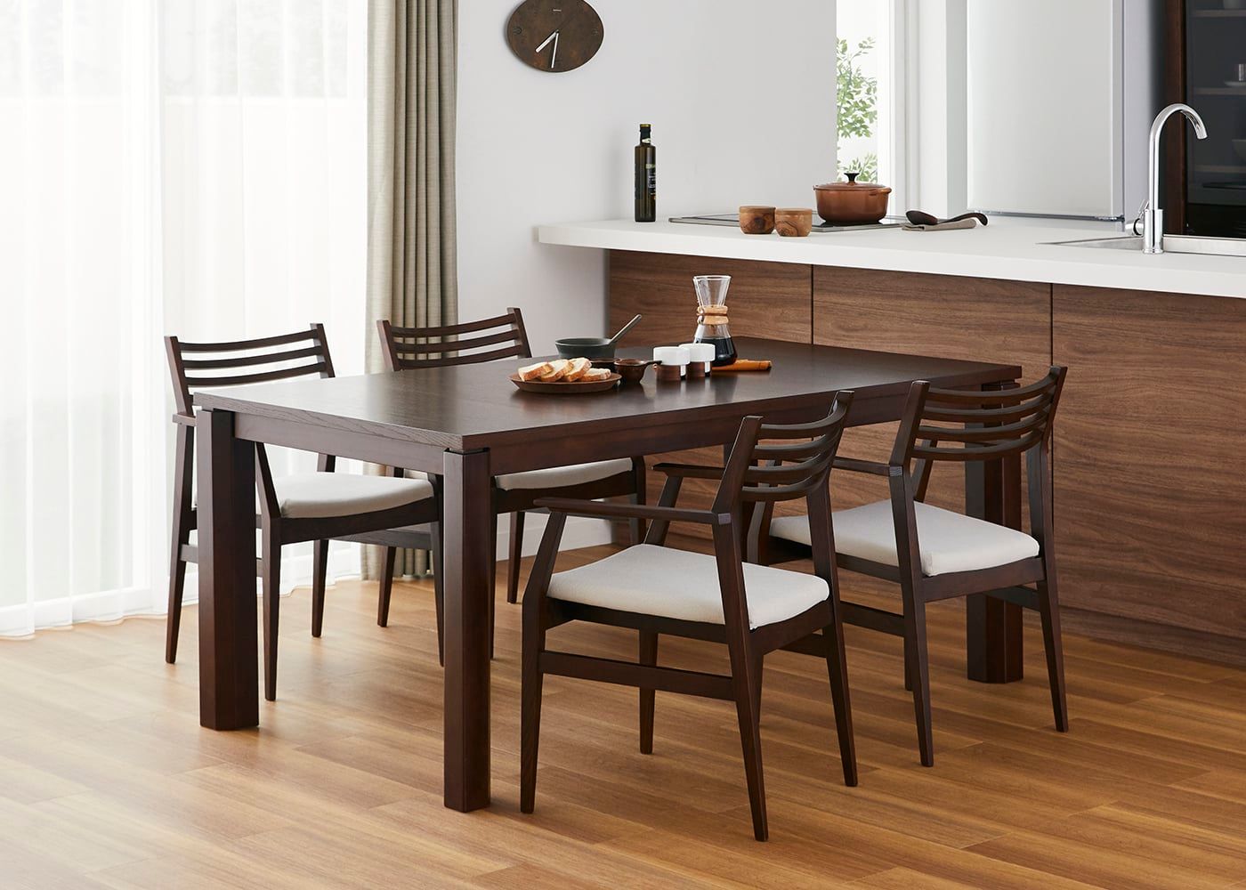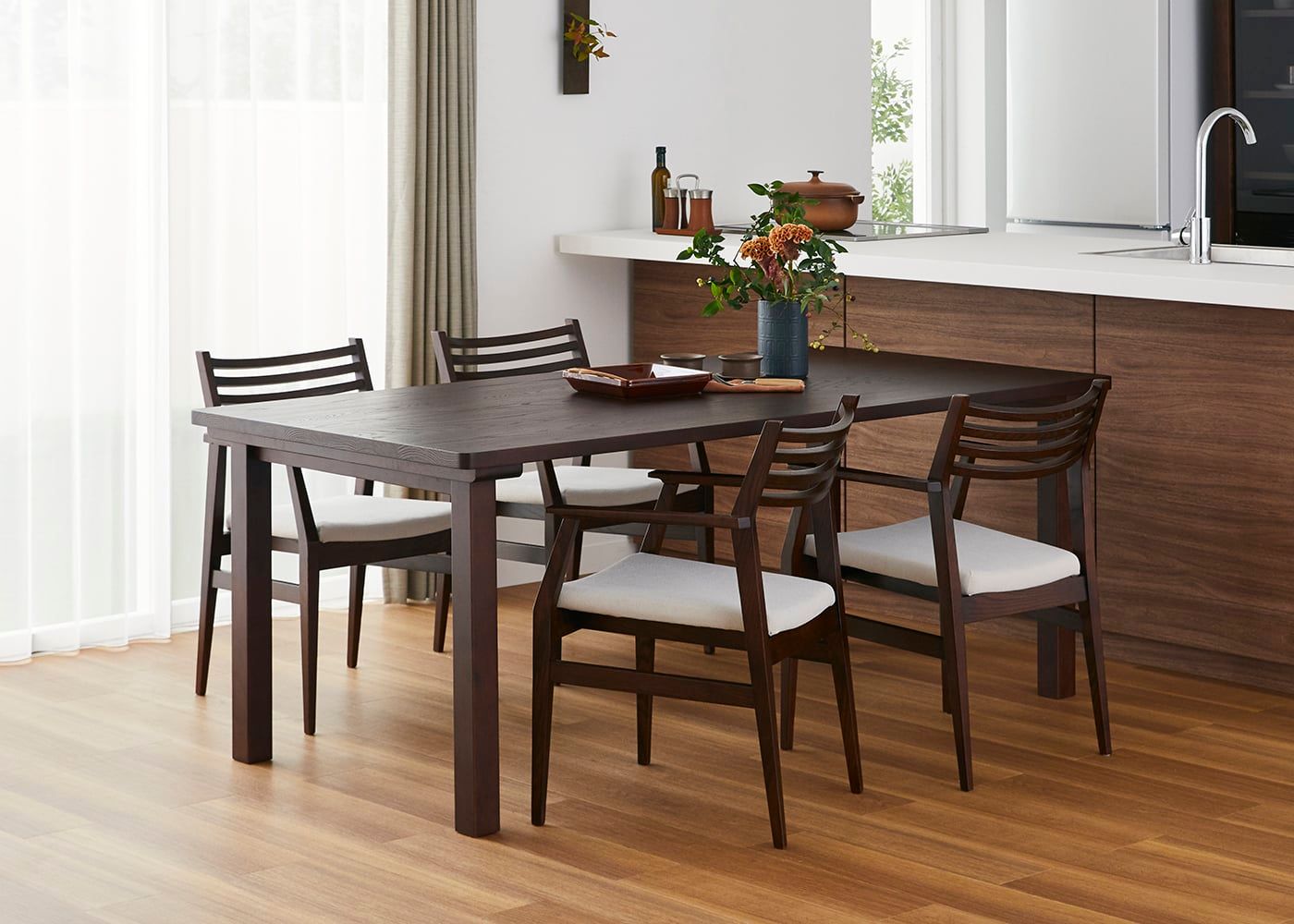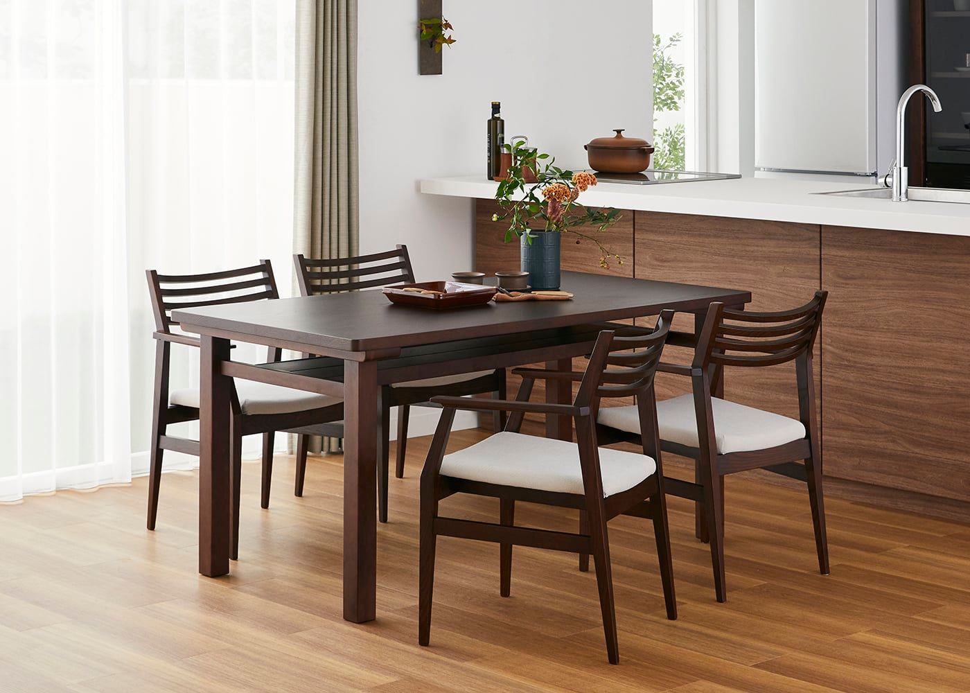セットとしてダークブラウンの世界観を味わえます。ダイニング周辺を彩るチェアカバーも加えれば、好みの雰囲気でコーディネートできるでしょう。(写真のチェアカバーは