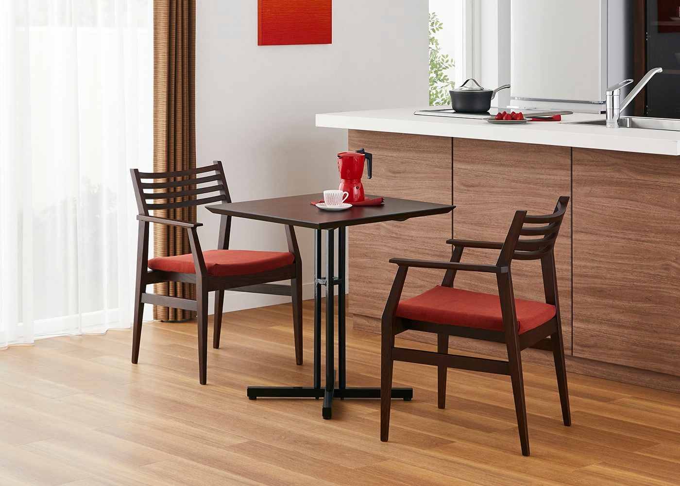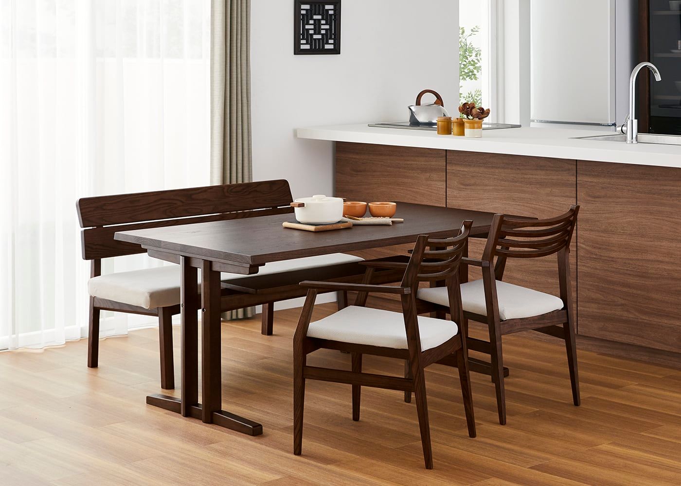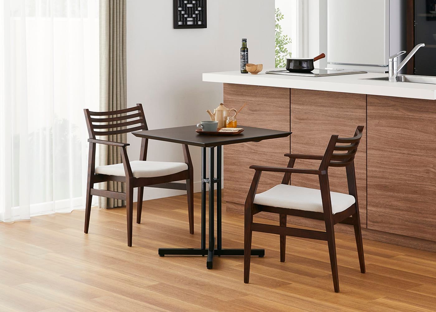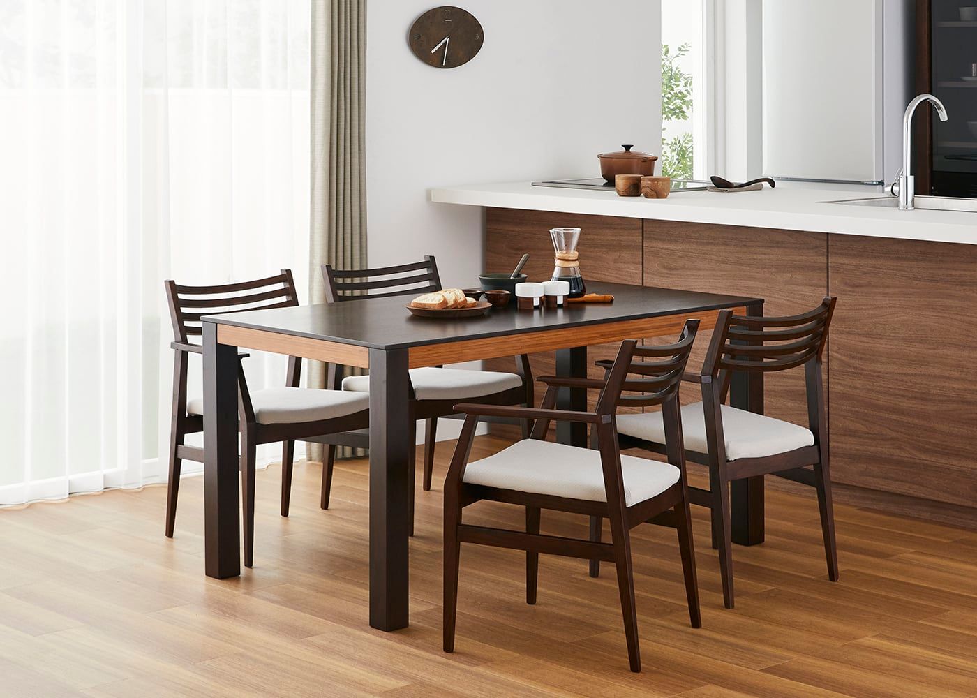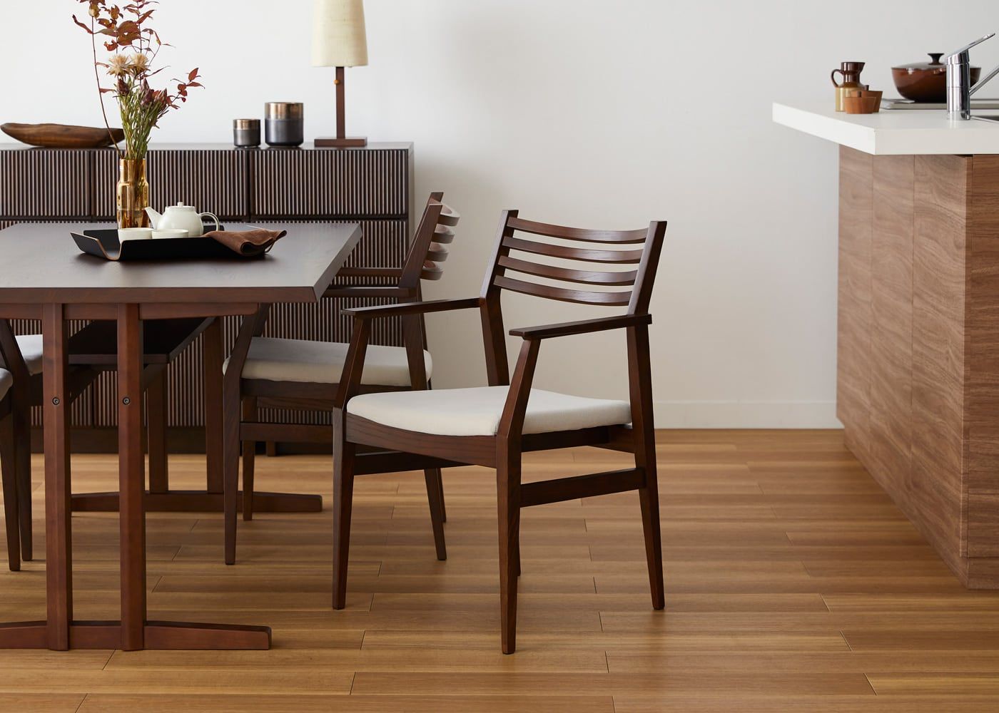 ウッド・ダイニングアームチェアを中心に、ダークブラウンの家具で統一したコーディネート例。都会的なリゾートを楽しめるシックな雰囲気にまとまります。同色のキッチン収納などと合わせて、大人っぽいダイニング空間で過ごしてみましょう。
