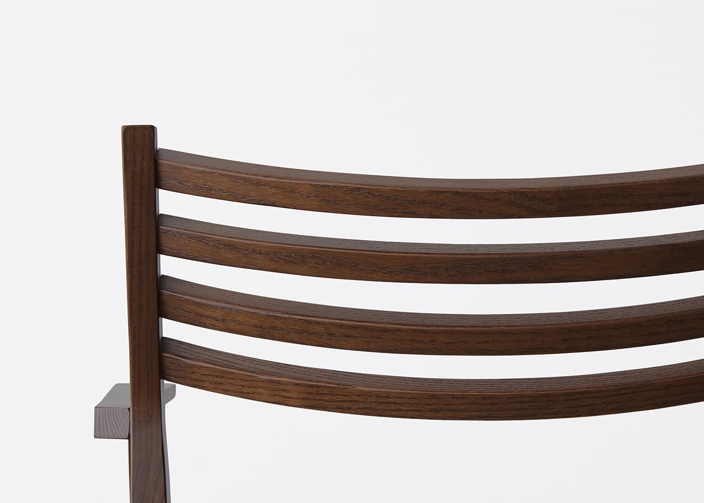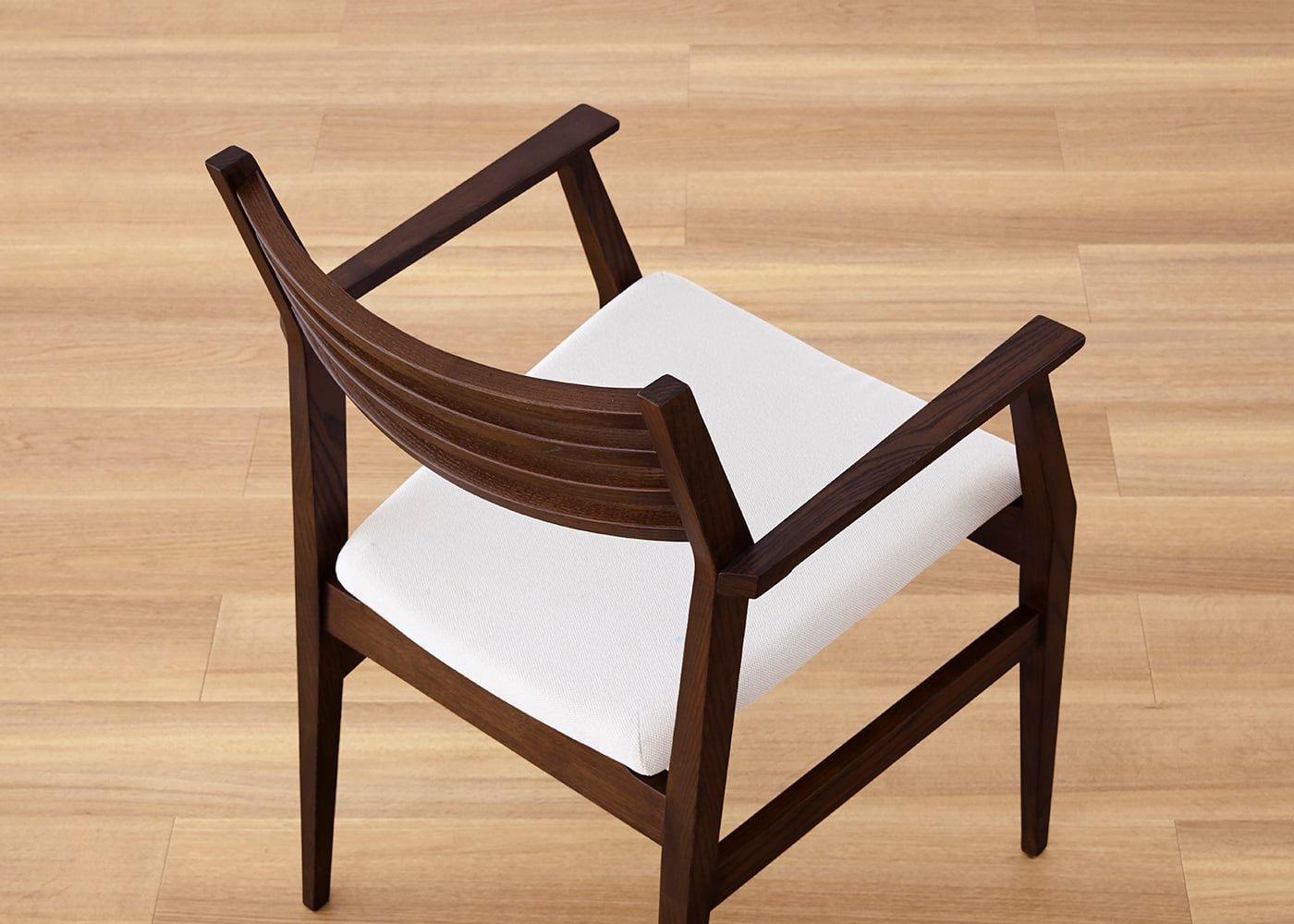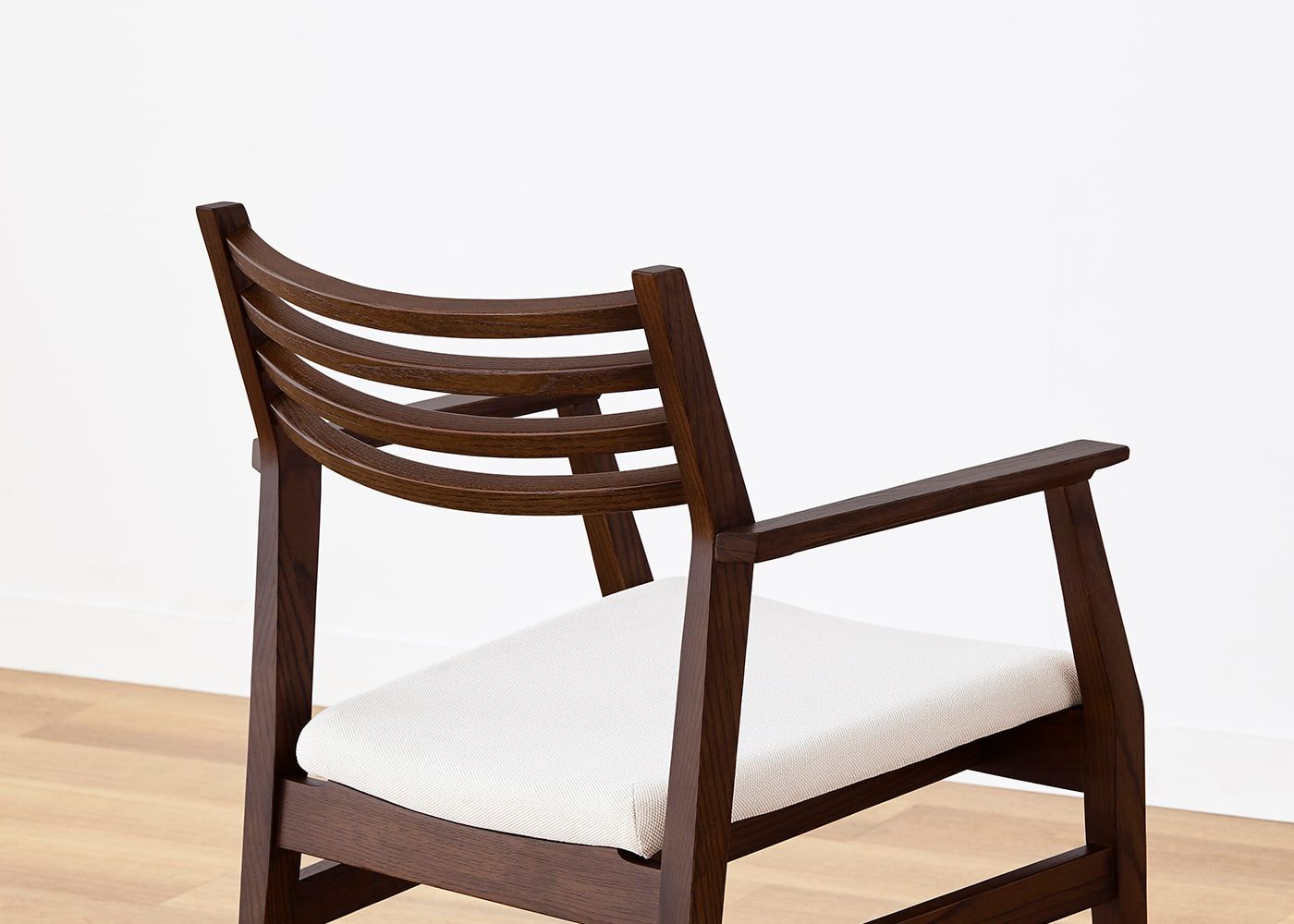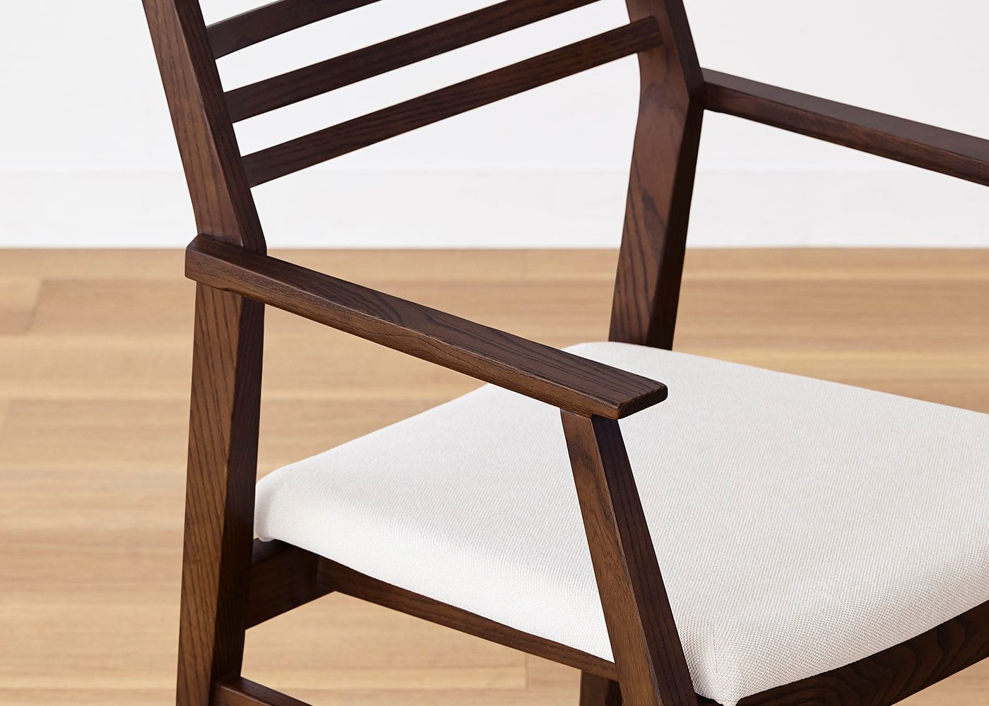 先端に行くにつれてアーム幅を広く、そして厚みを薄くしたアームデザイン。出入りしやすく開放的に見せるセットバックしたアームです。手の置きやすさとシャープな印象という相反する要素を両立したディテールに。