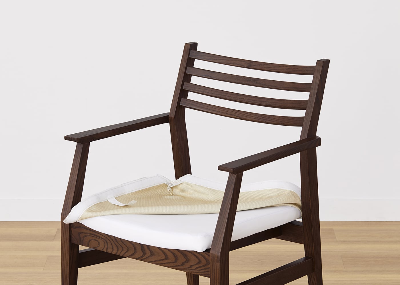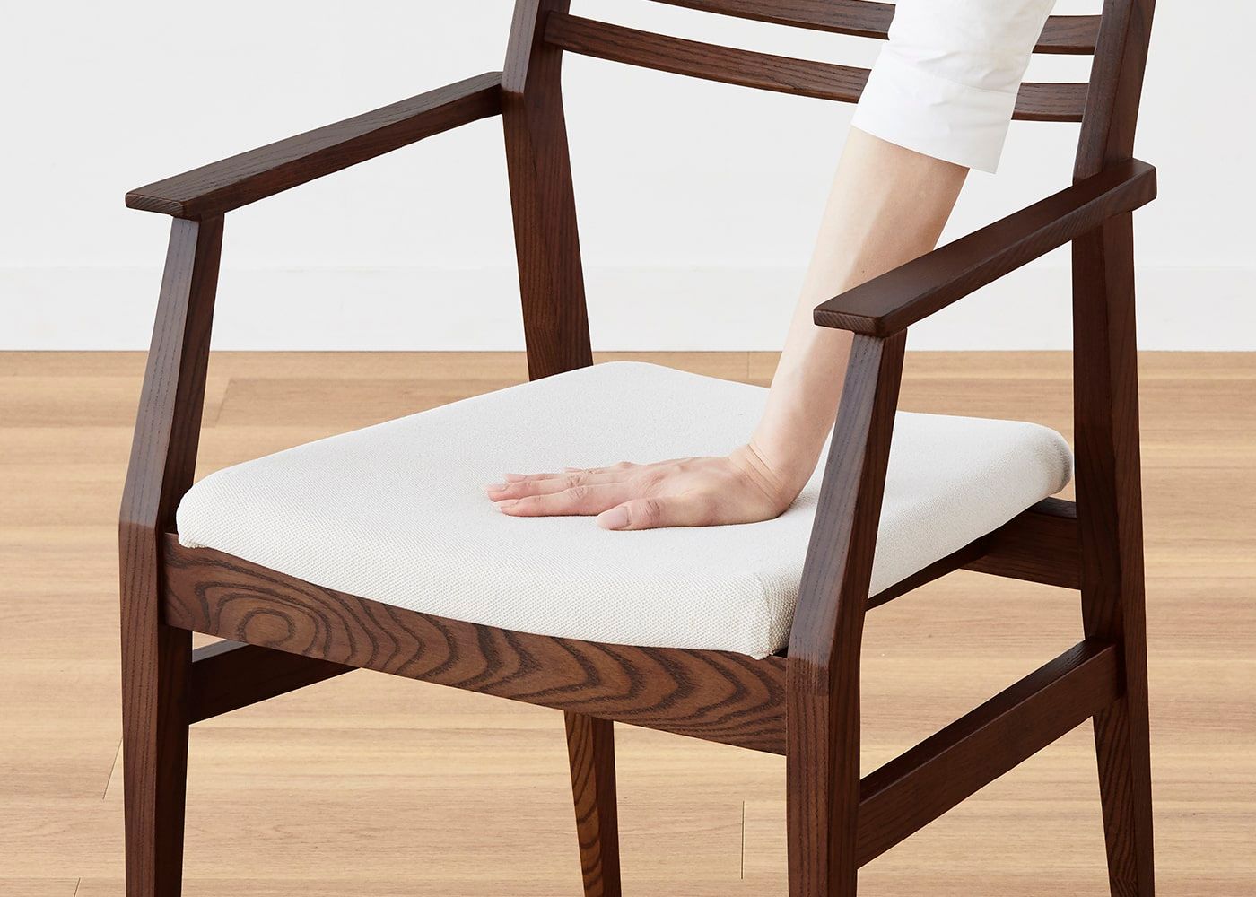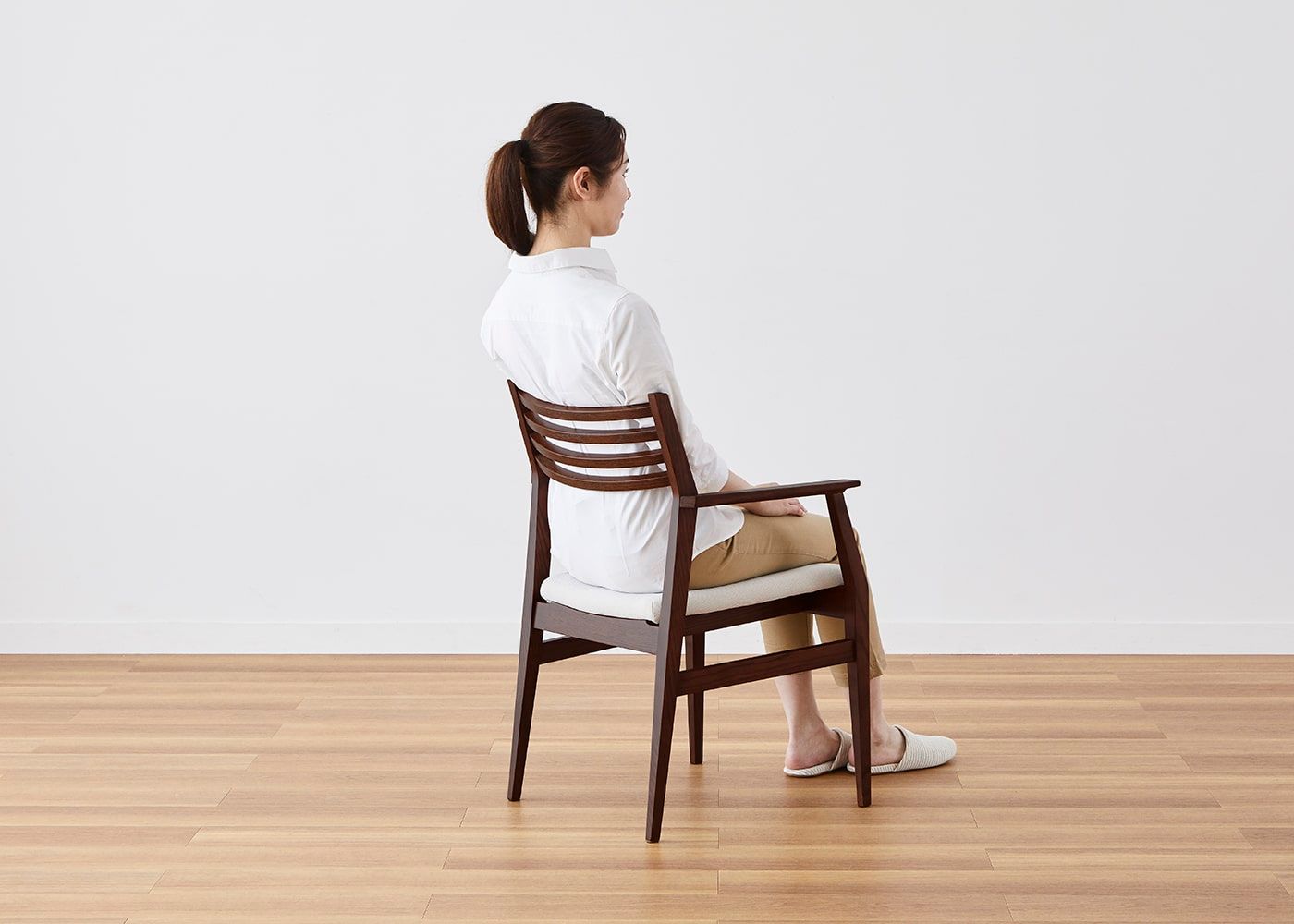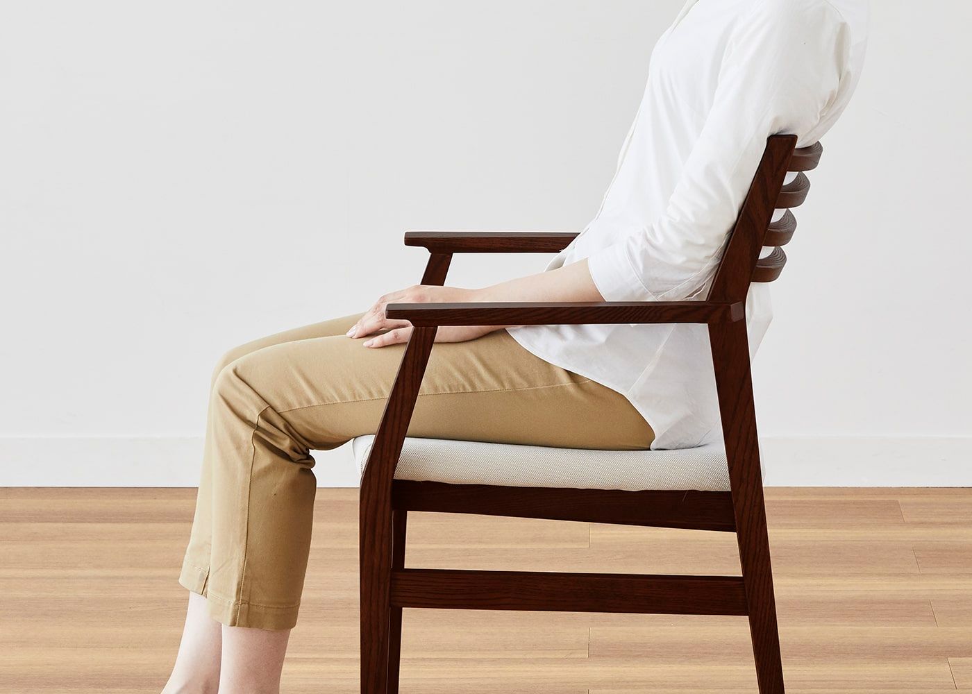アームに腕を休めてゆったりくつろげるのがアームチェアの魅力。アームの先端が少し出ていることで引っ掛かりが生まれ、腕を置いた時の手の収まりや立ち座りの際に便利です。さらにアームの長さを少し短くすることで、横からの立ち座りがし易くなっているのも特長。(モデルは身長172cmの男性)