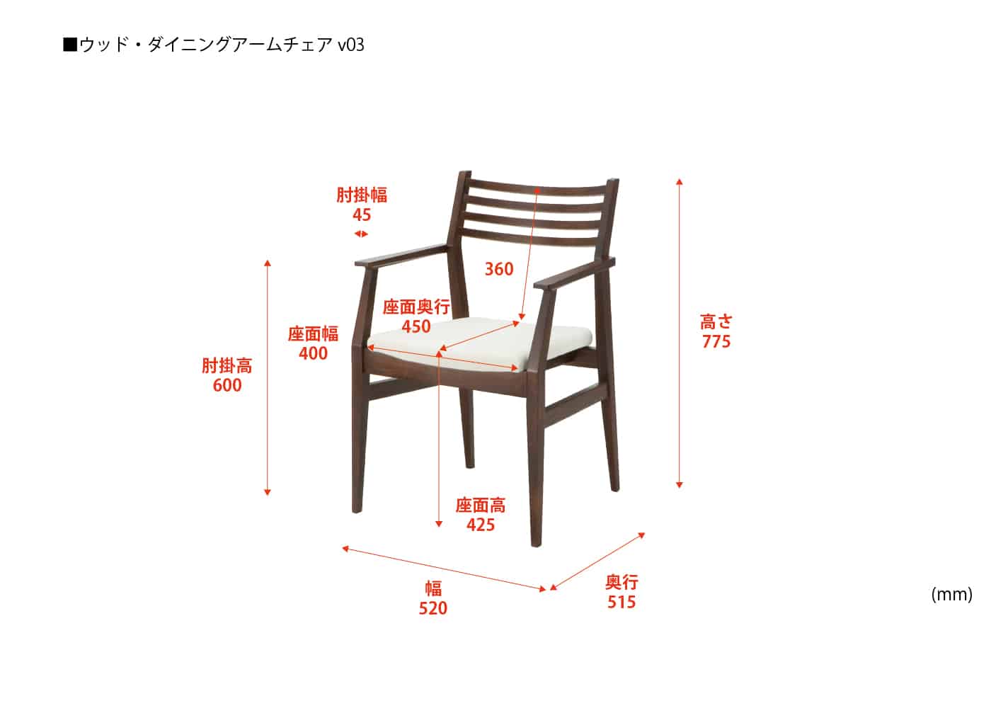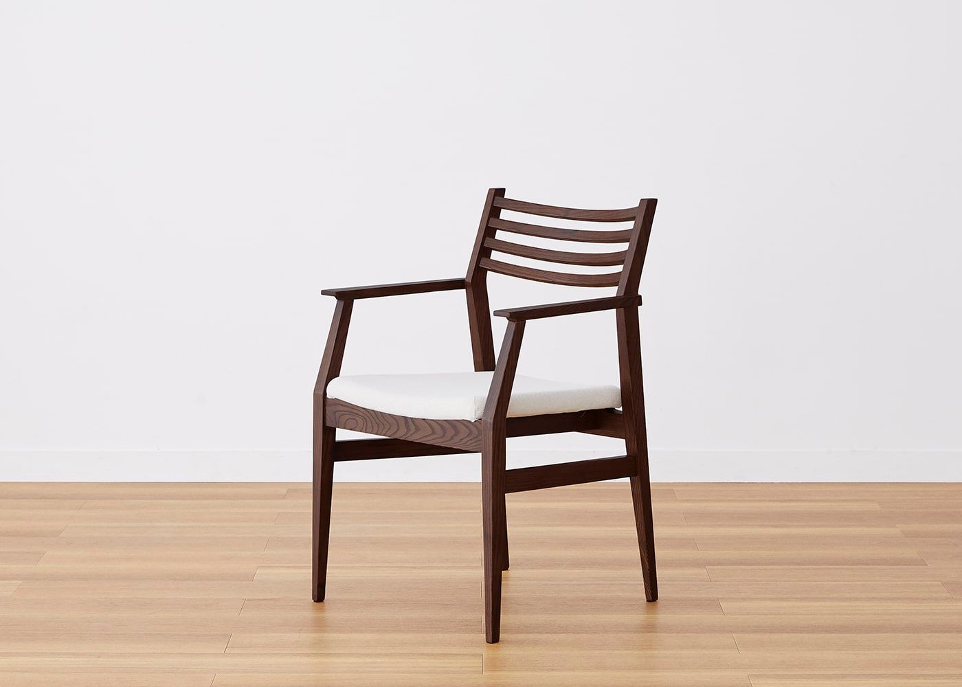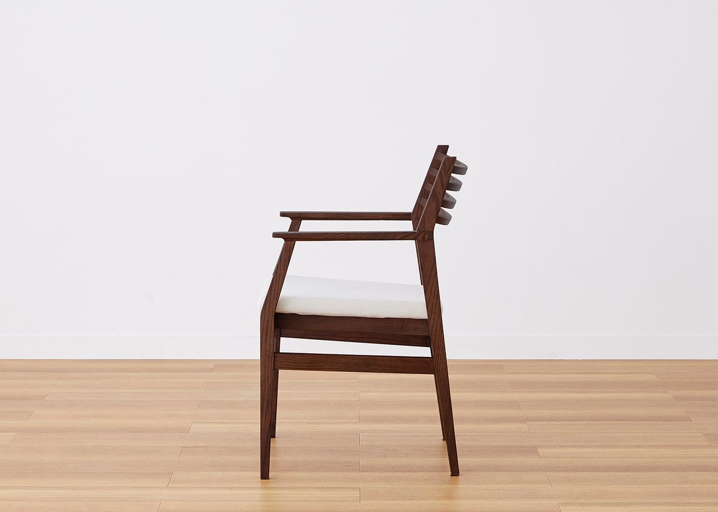 ルーバーデザインの背もたれと、洗練されたフォルムが特長のウッド・ダイニングアームチェアv03。線の細さと抜けを感じるスタイリッシュな佇まいが、見る人の心を魅了します。