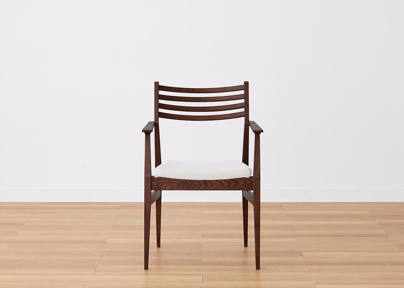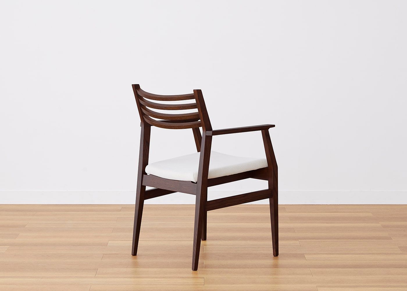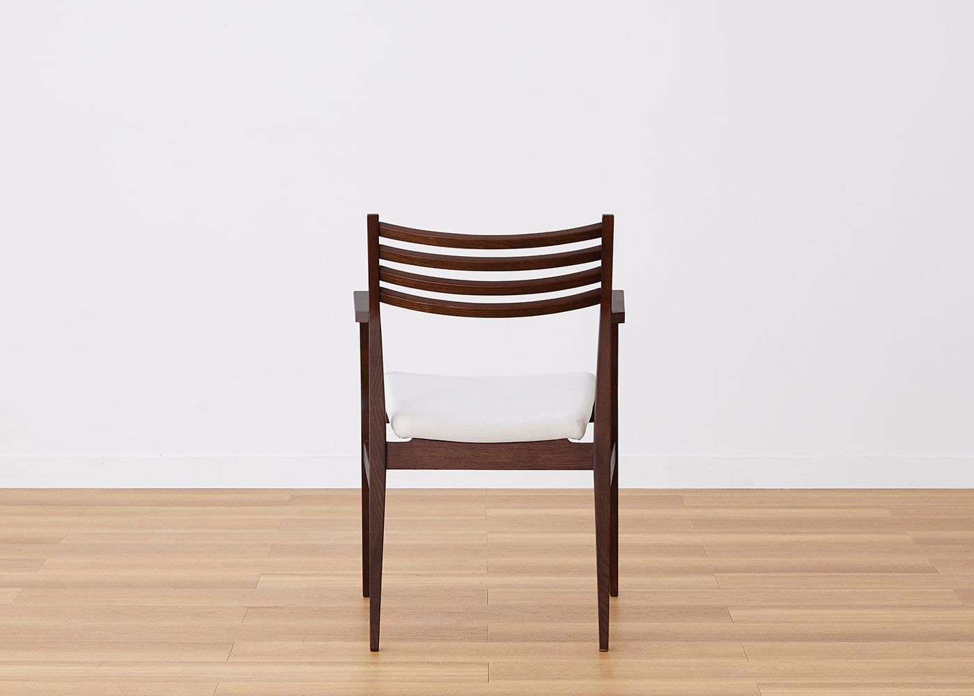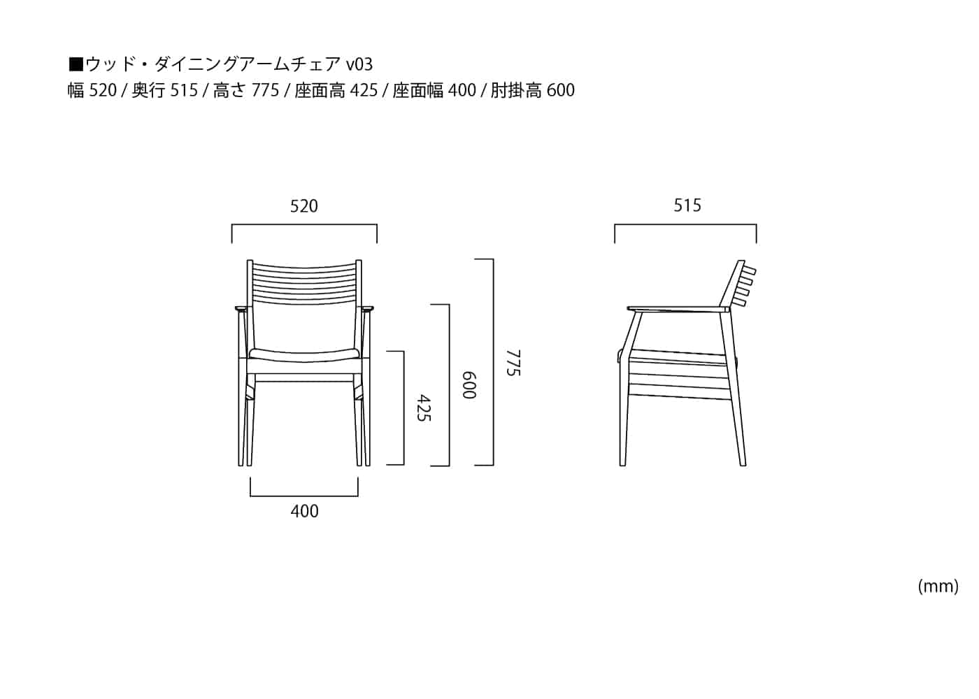 ルーバーデザインの背もたれと、洗練されたフォルムが特長のウッド・ダイニングアームチェアv03。線の細さと抜けを感じるスタイリッシュな佇まいが、見る人の心を魅了します。