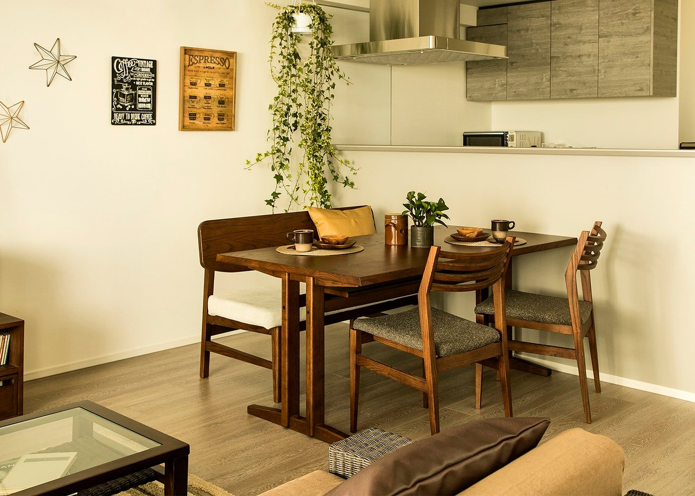 二人暮らしのおしゃれな新築マンションの実例。ダークブラウンのインテリアでトータルコーディネートしたカフェ風の空間が魅力です。無垢材チェアにもブラウンのカバーをプラスして、シンプルでセンスのある食卓を作り上げました。