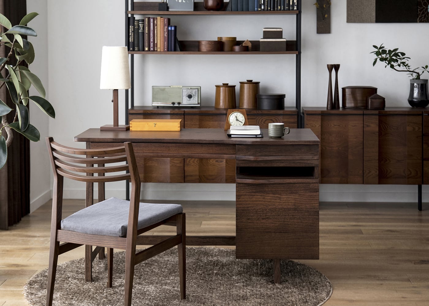 ウッド・ダイニングチェアv03は食卓用のチェアとしてはもちろん、書斎用のチェアとしても使えます。同じ無垢材同士で揃えて、統一感のある書斎を作ってみましょう。(写真は