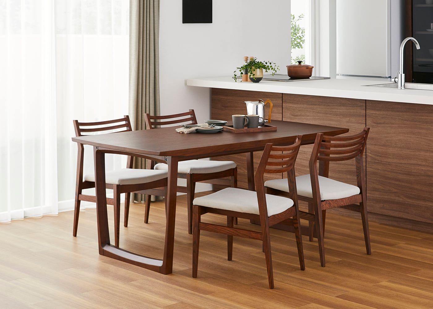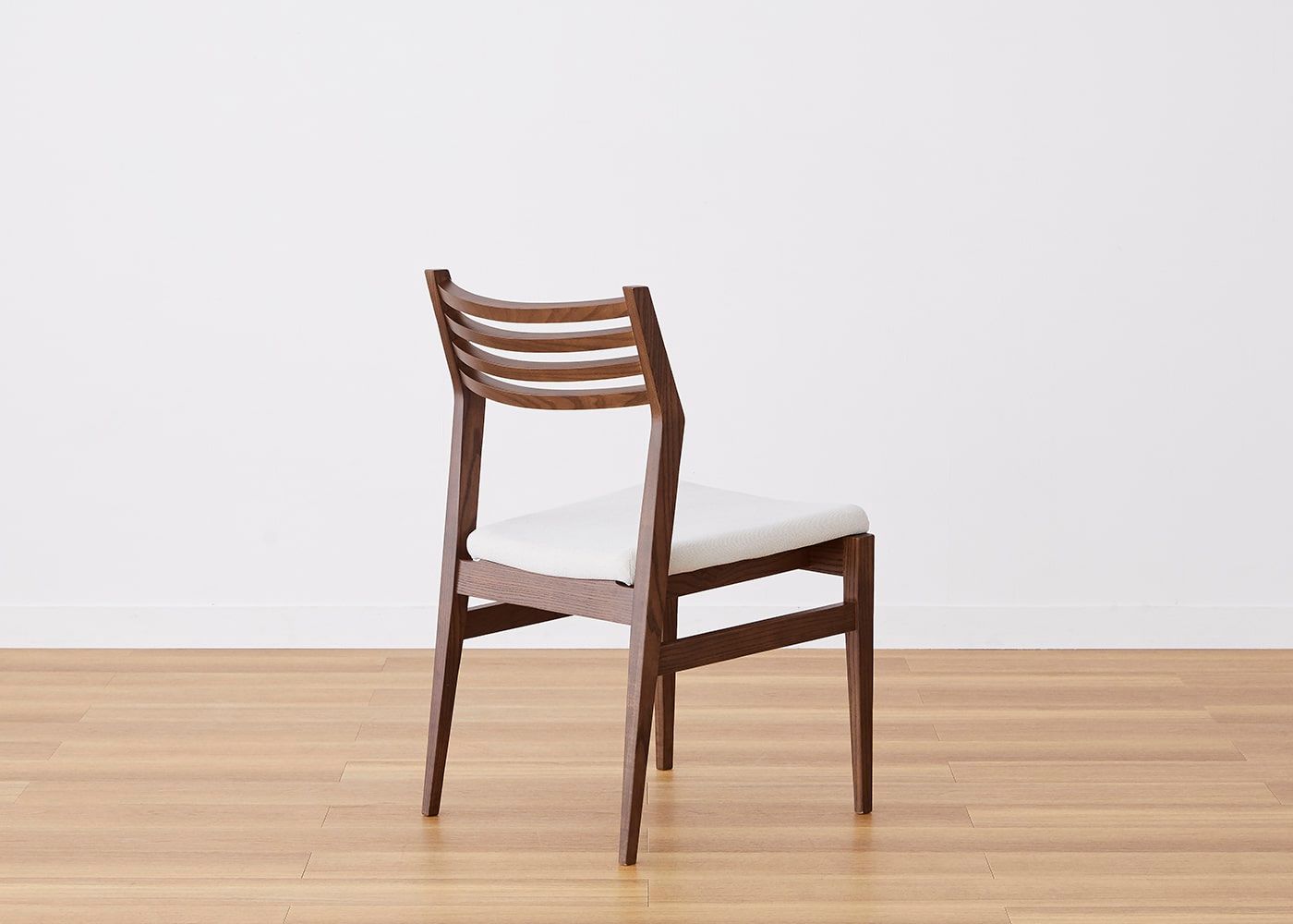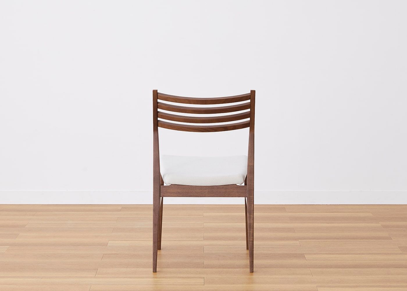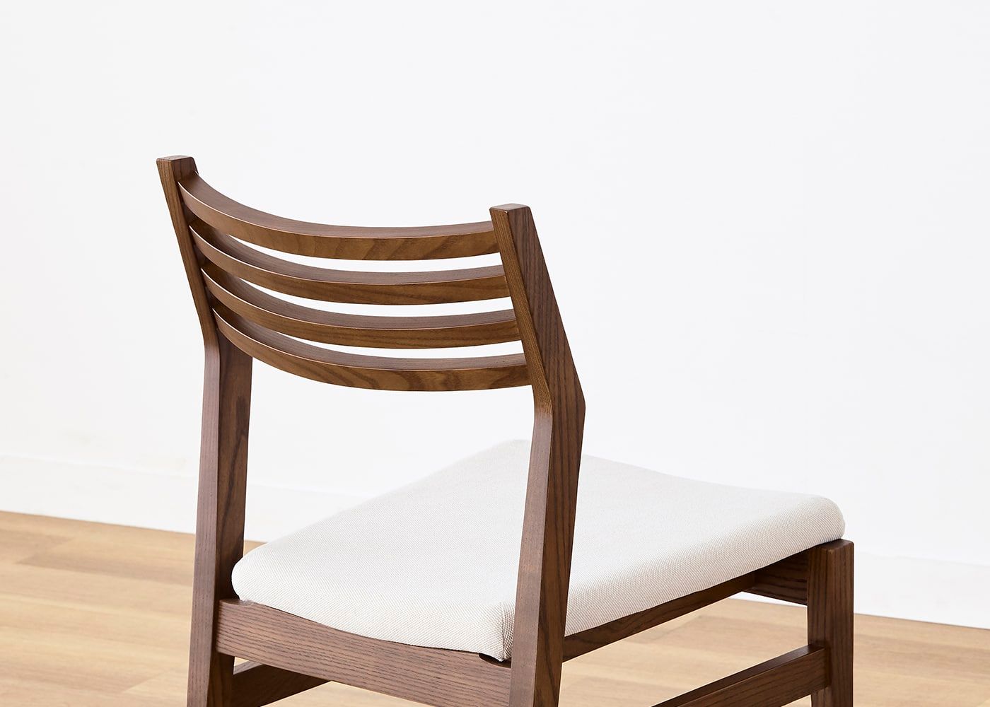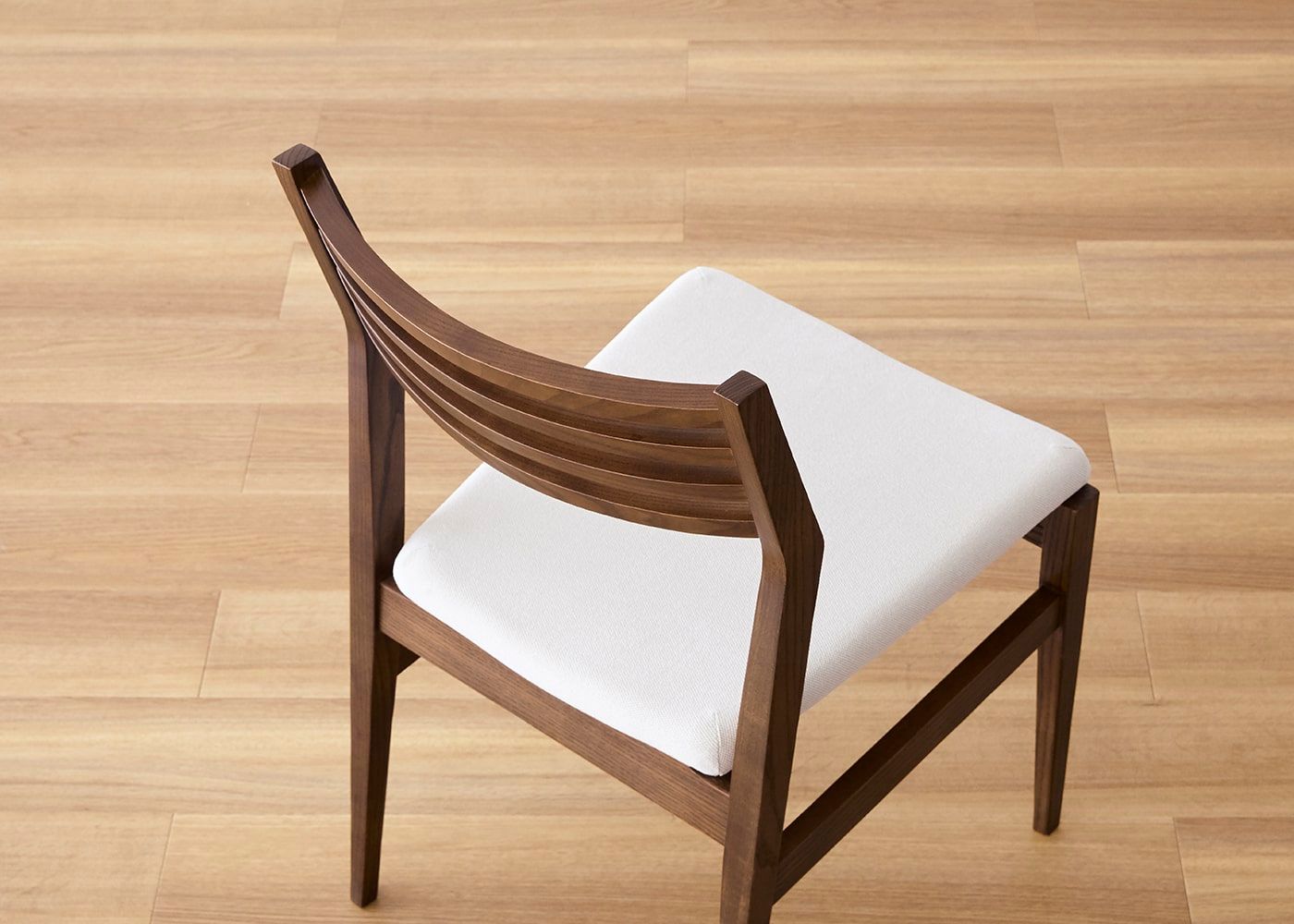 日々の暮らしでリビングからダイニングを見ることが多いため、背面のデザインにもこだわりました。先端に向けて細くなる脚、そして背もたれから座面周りに抜けを設けることで軽やかな印象に仕上げました。
