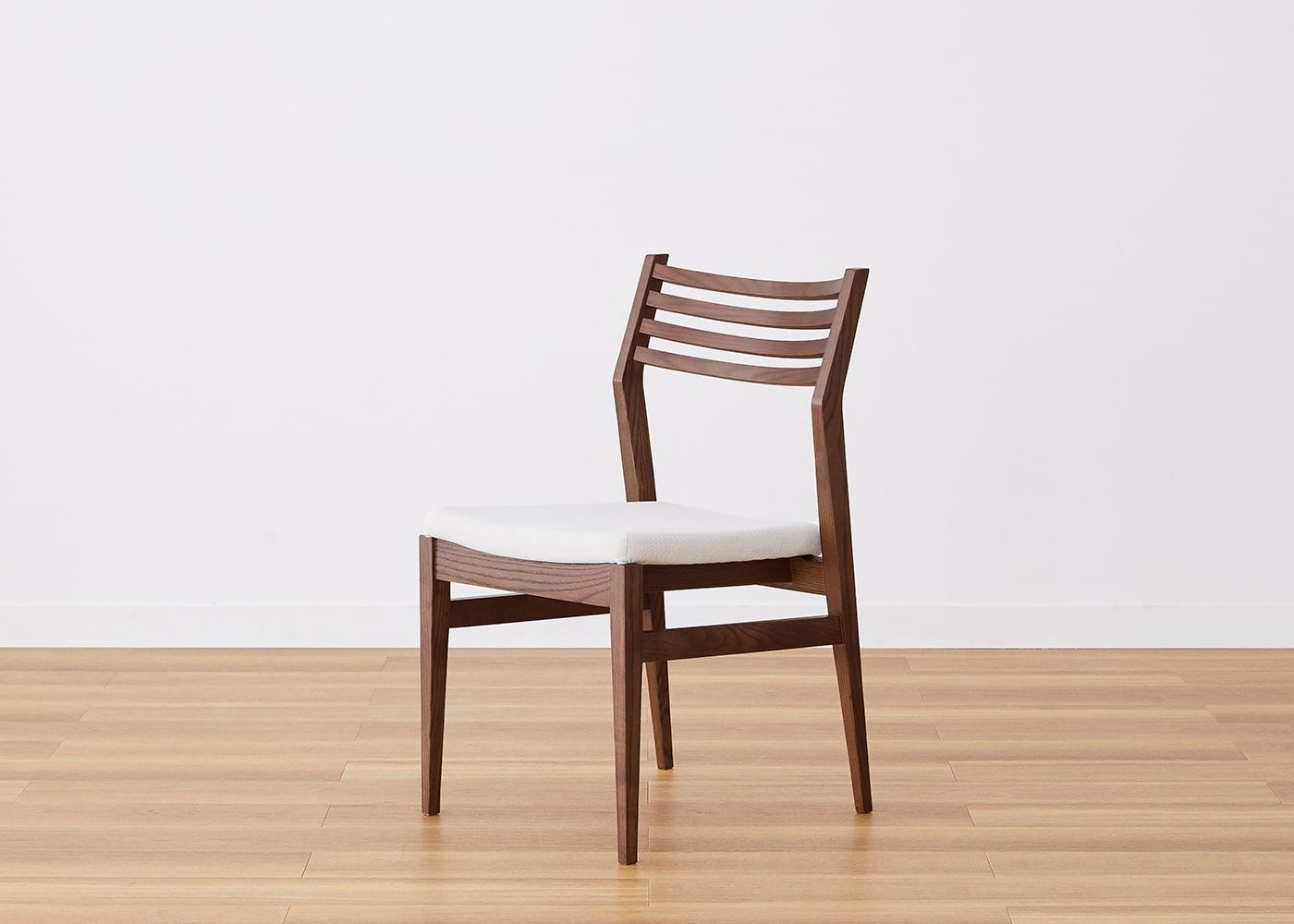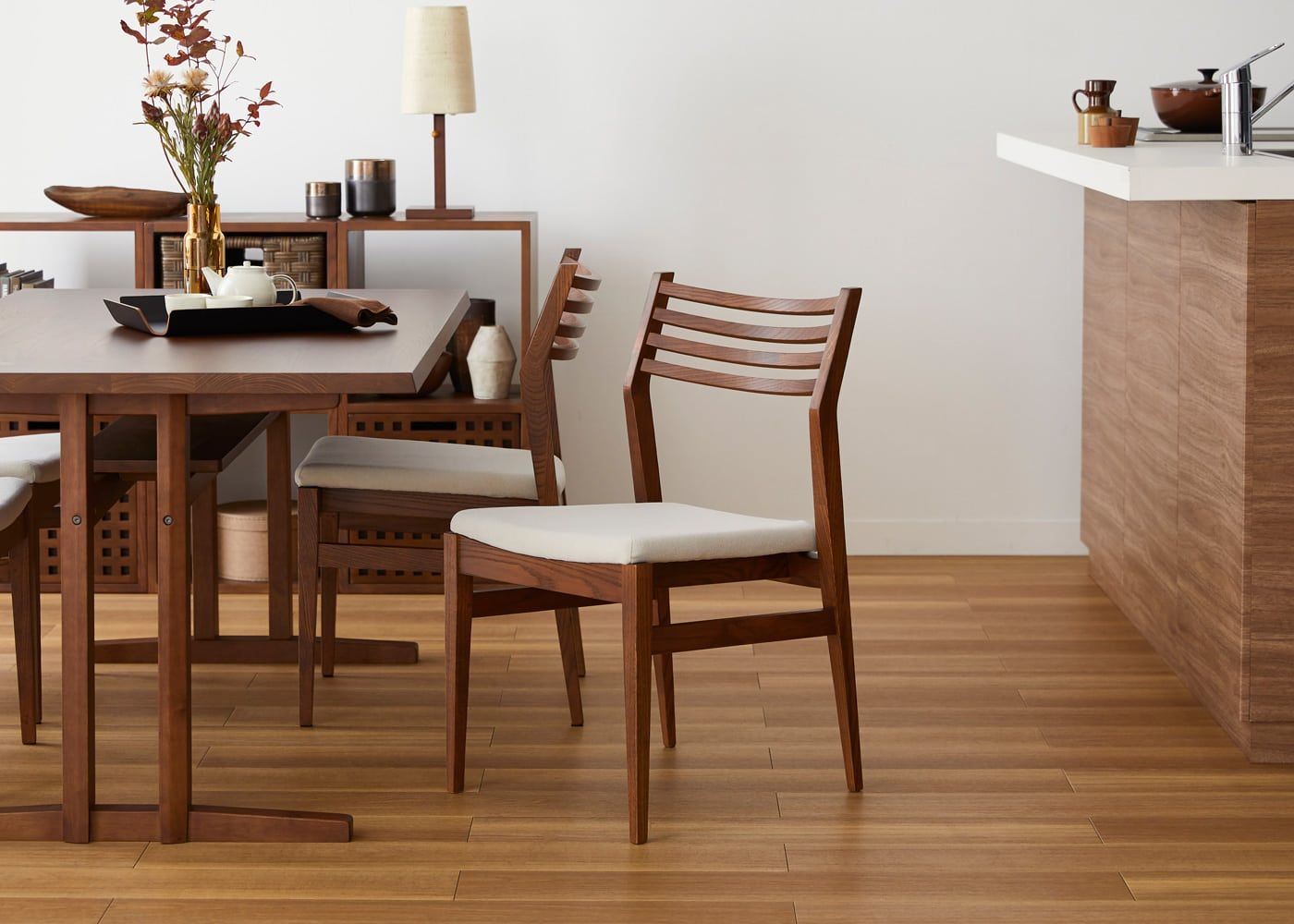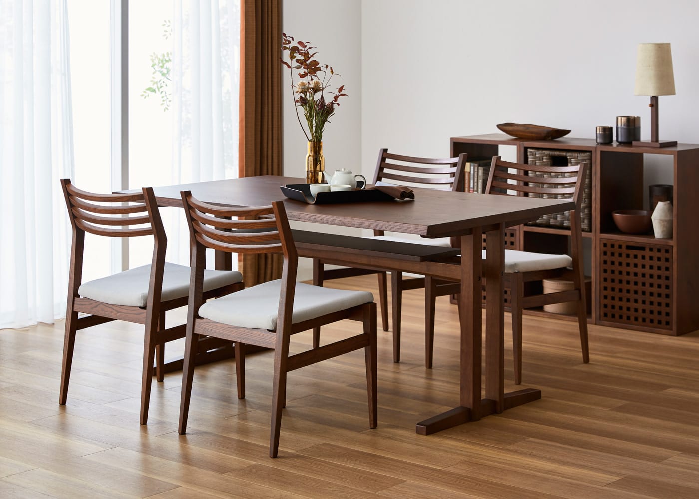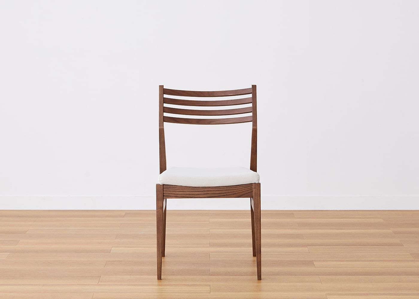 日々の暮らしでリビングからダイニングを見ることが多いため、背面のデザインにもこだわりました。先端に向けて細くなる脚、そして背もたれから座面周りに抜けを設けることで軽やかな印象に仕上げました。