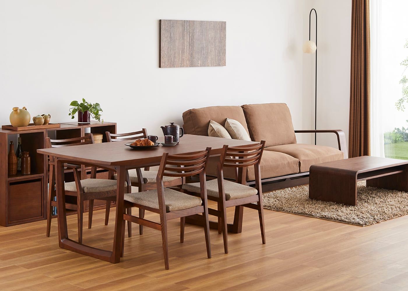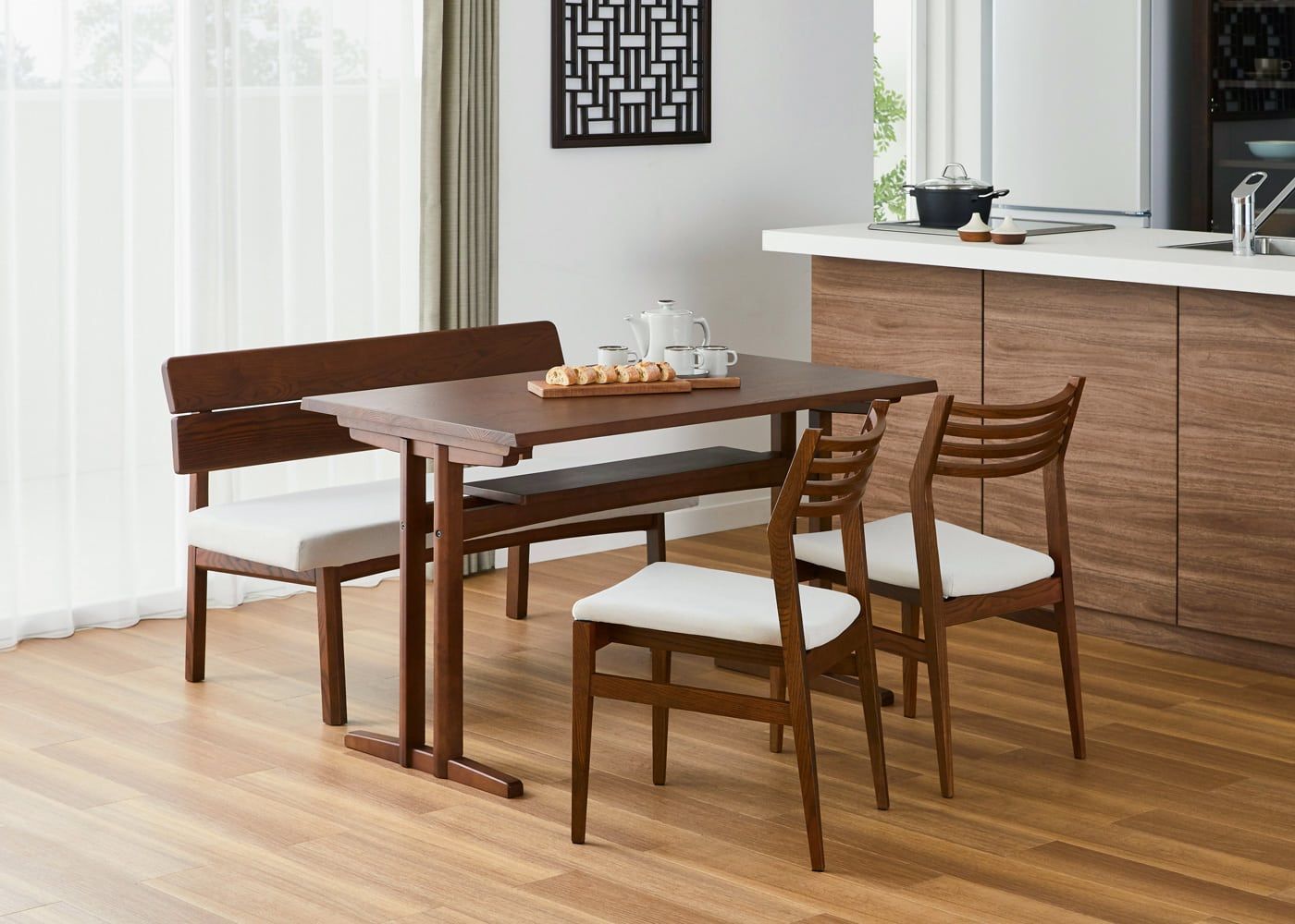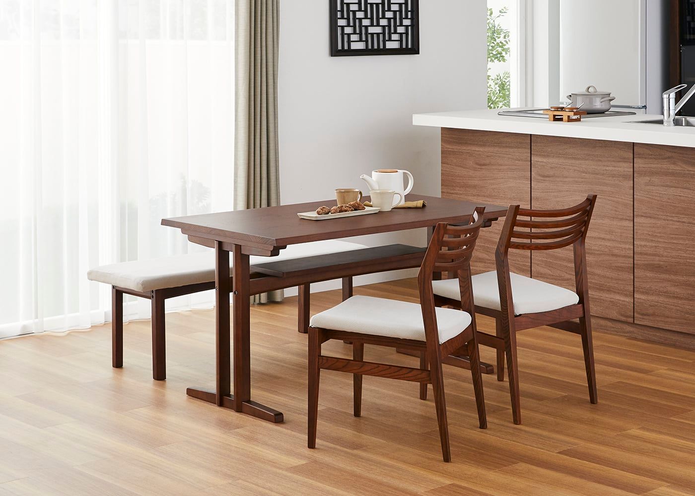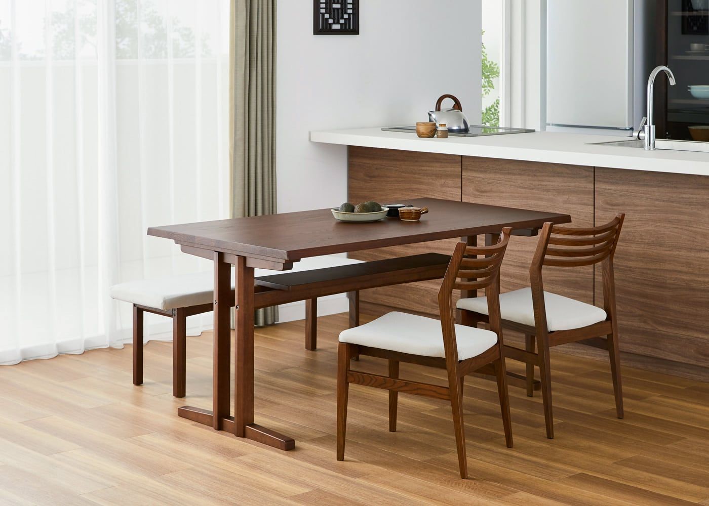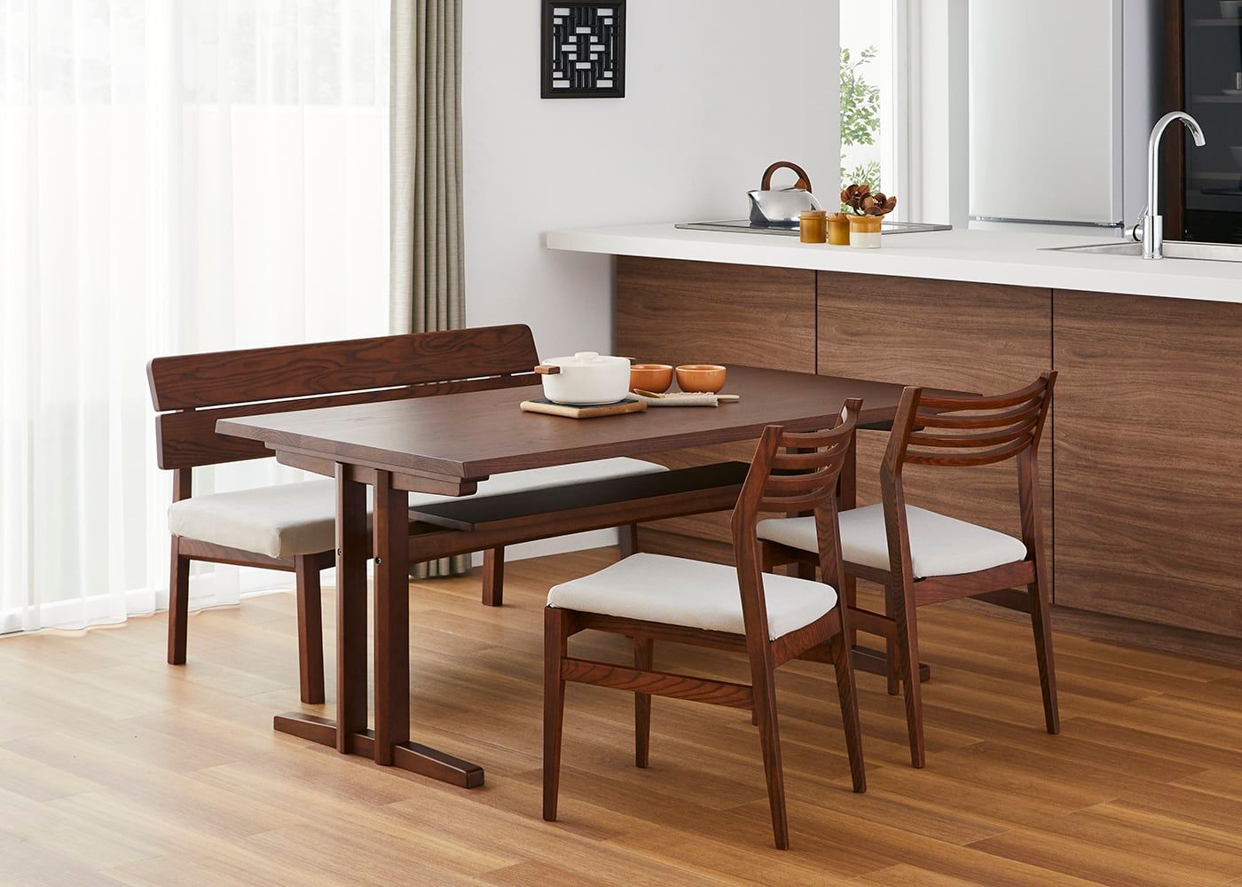 日々の暮らしでリビングからダイニングを見ることが多いため、背面のデザインにもこだわりました。先端に向けて細くなる脚、そして背もたれから座面周りに抜けを設けることで軽やかな印象に仕上げました。