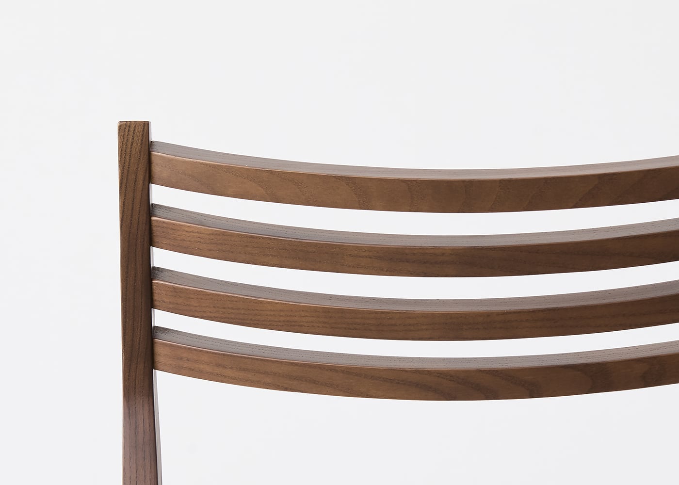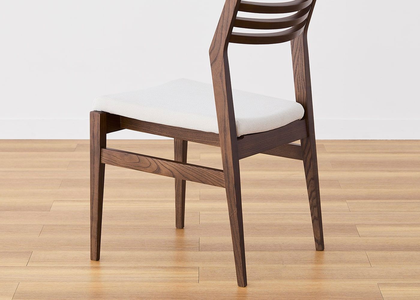 背もたれにはアッシュ無垢材を使用。無垢材でしか感じることのできない、やさしい手触りと木の温もりに癒されます。世界に一つだけの木目をお楽しみください。時を重ねるごとに表情が変化して味わい深くなっていくのも無垢材の魅力です。また、美しい木目を引き出すために、オイルステインを使用したグレインブラウン色を採用しています。