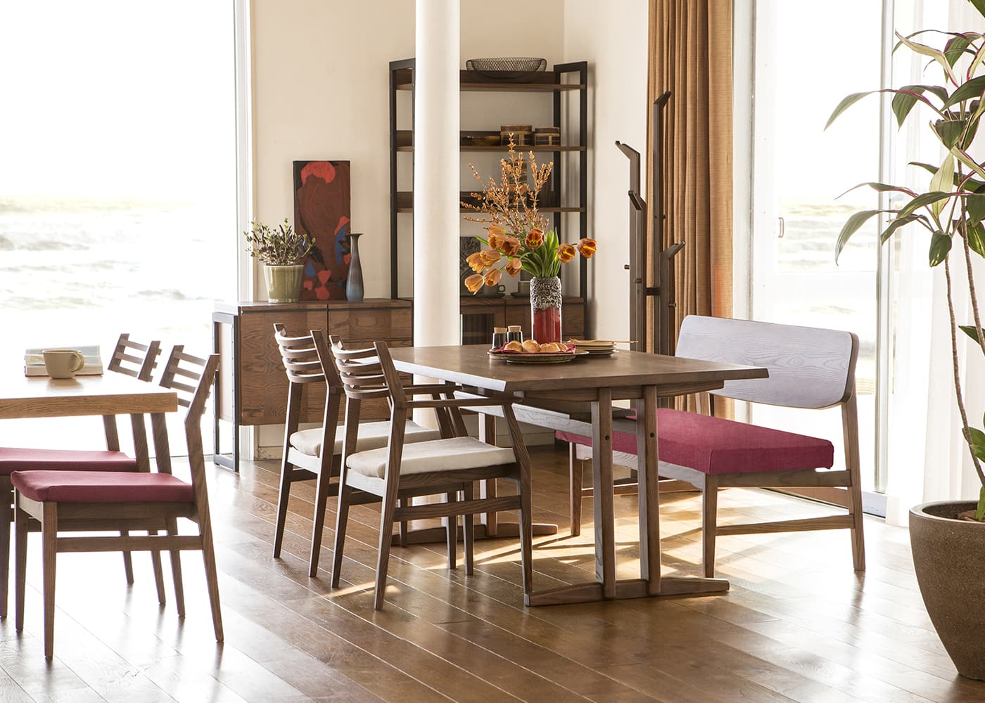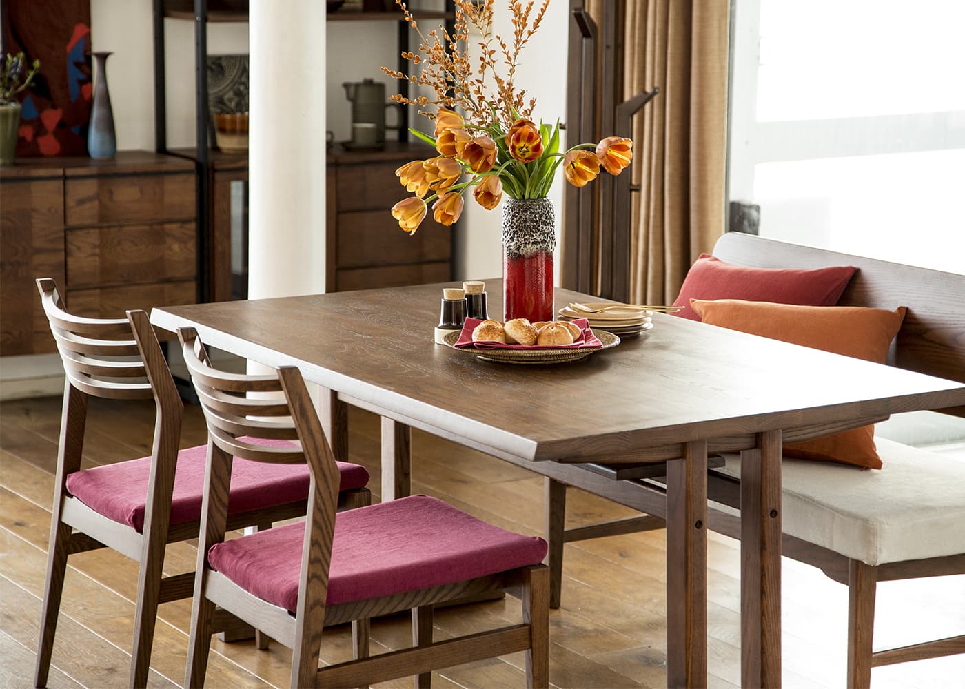 サンセットの温もりに包まれるような南国リゾートを想わせるコーディネート例。ウッド・ダイニングチェアなどの無垢材家具で統一したダイニング空間に、鮮やかなレッドやオレンジの差し色が入ることで、非日常感のある食卓が叶います。
