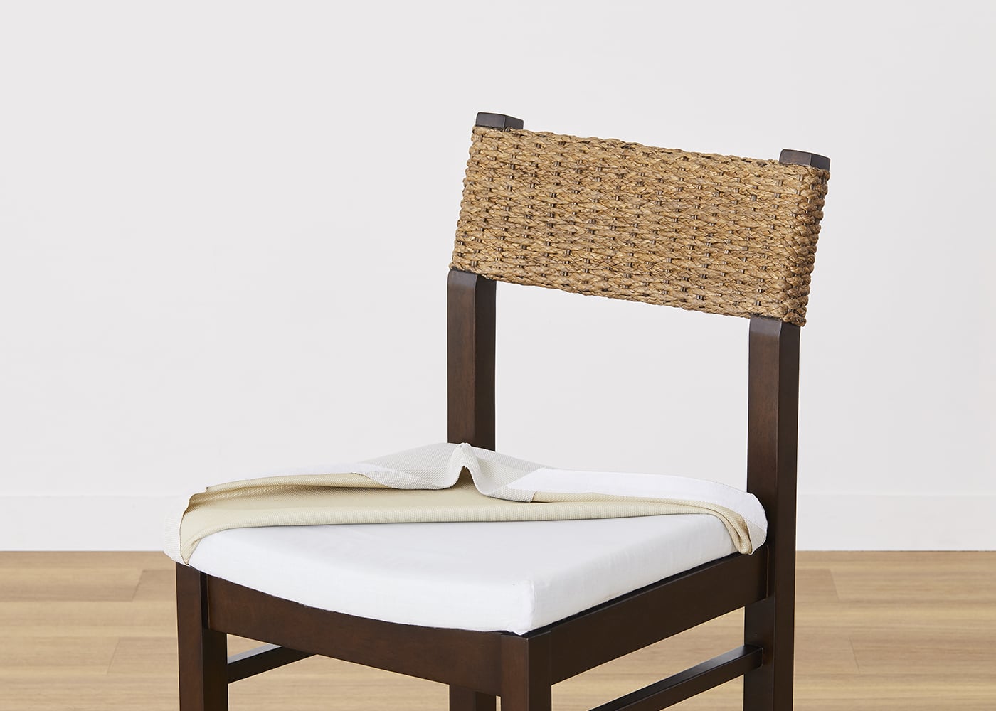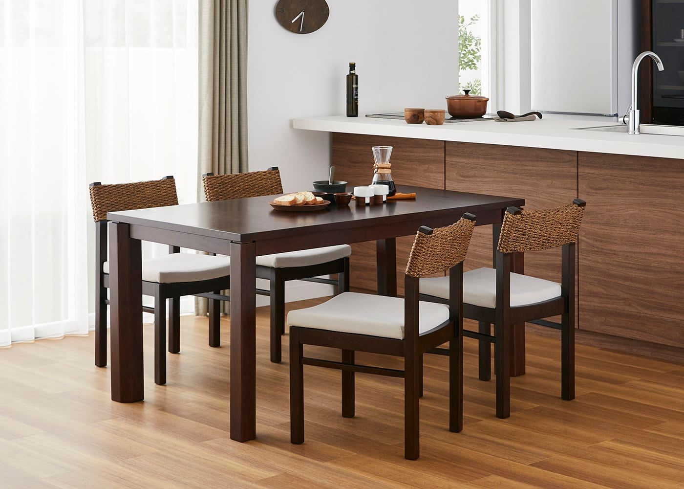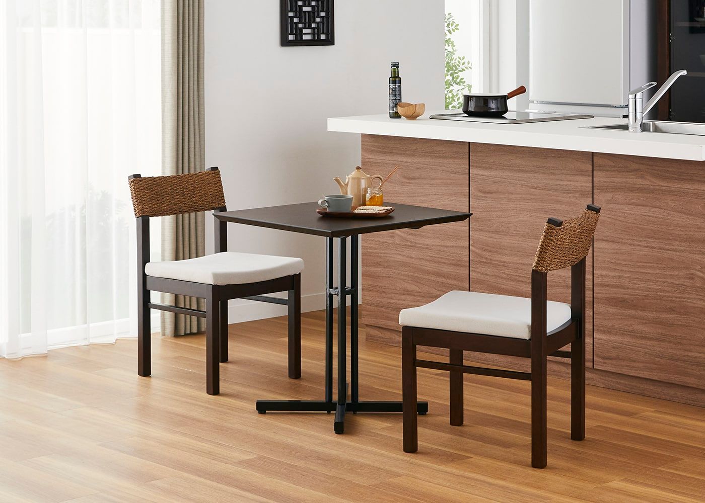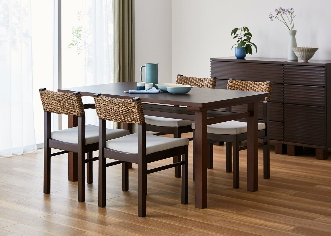 ヒヤシンスの素材感を際立たせたい時は、ダークブラウンのチェアカバーでコーディネートしてみましょう。背もたれの素材が映える、モダンアジアンなダイニングを演出できます。(写真は