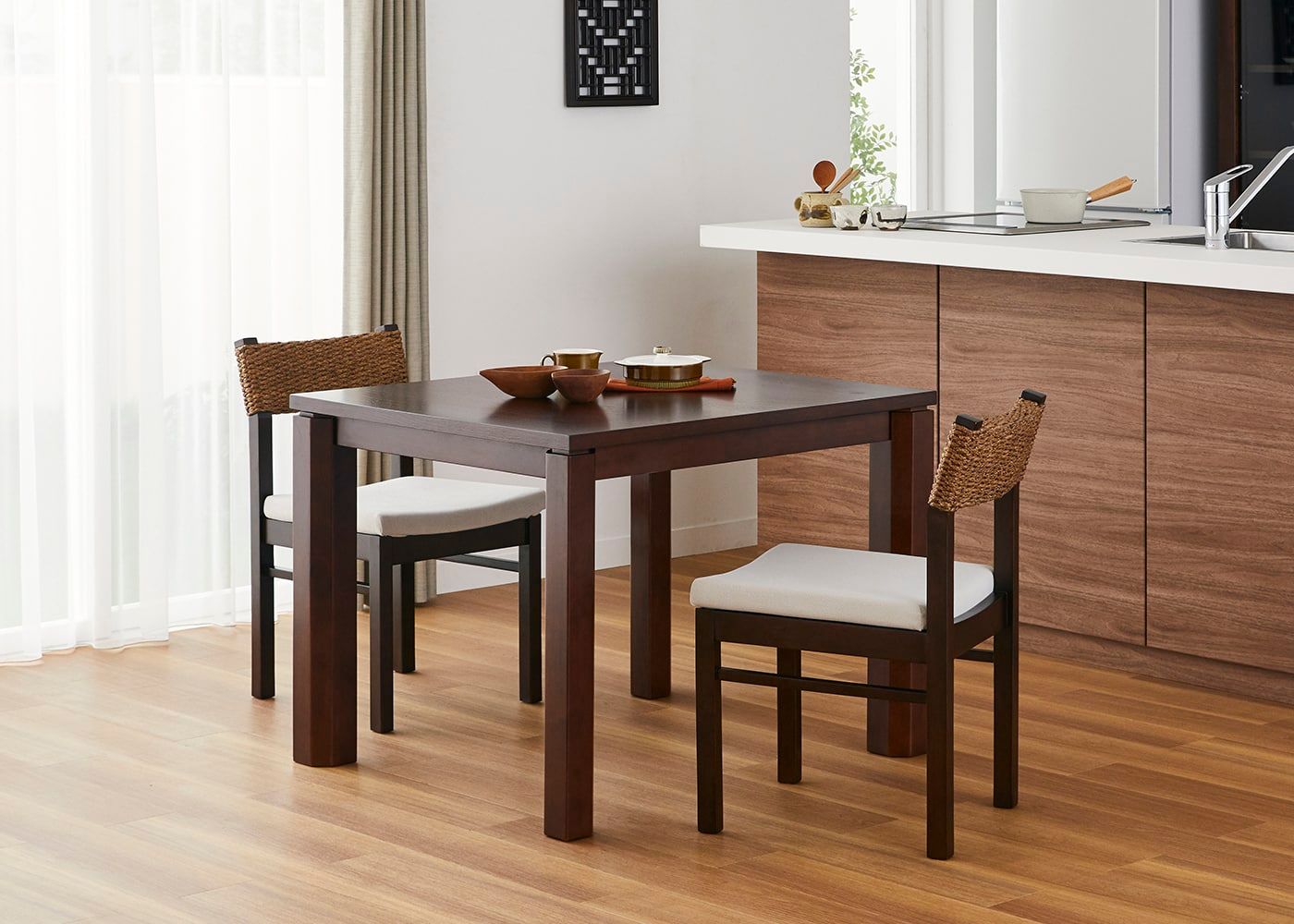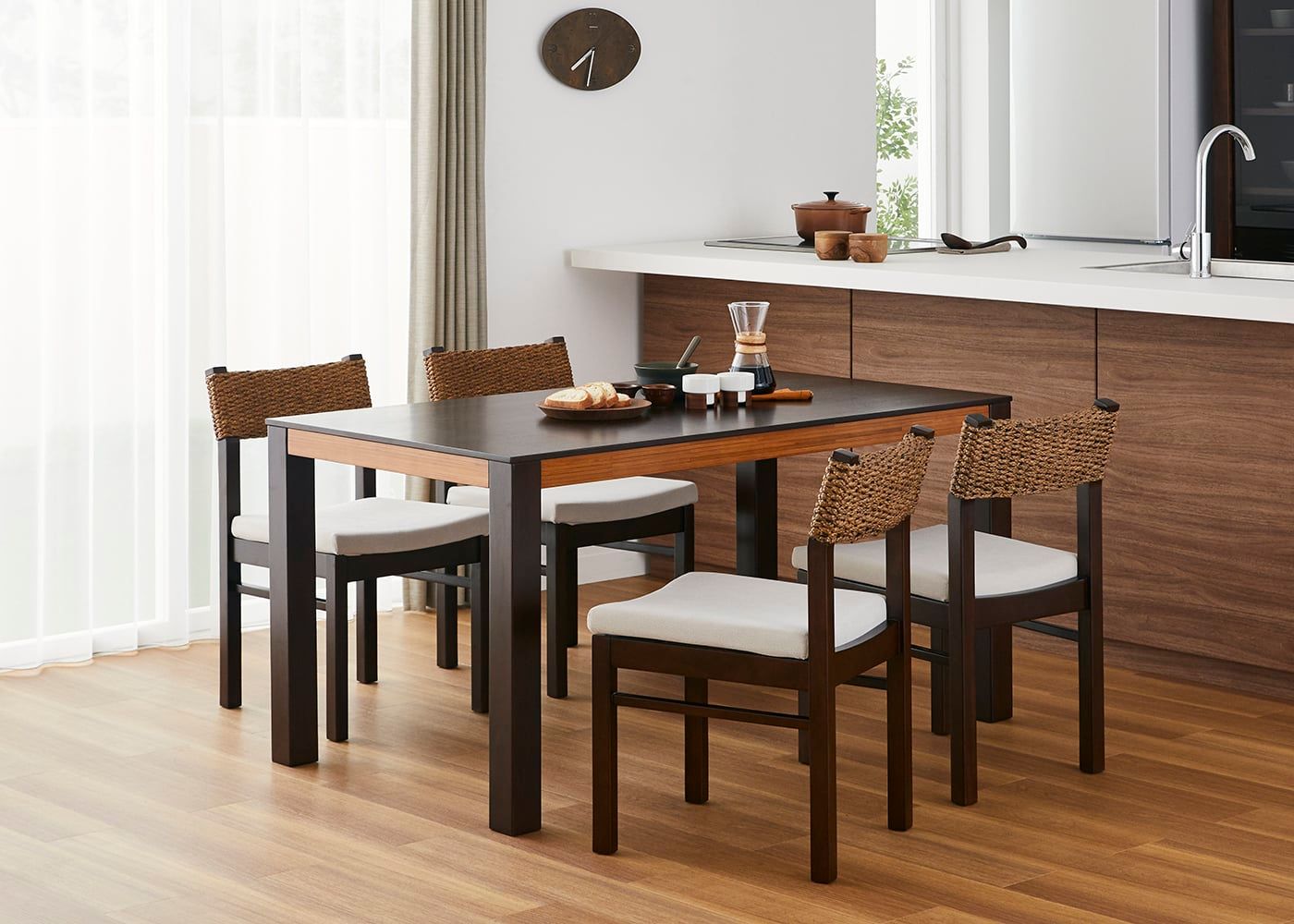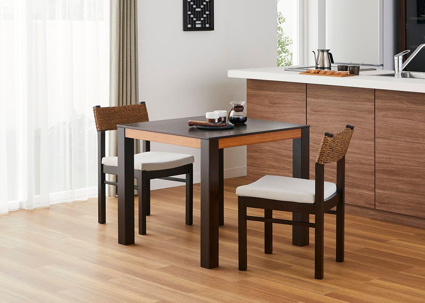 日々の暮らしでリビングからダイニングを見ることが多いため、背面のデザインにもこだわりました。コントラストが際立つ四角形の脚がカオならではのディテールです。