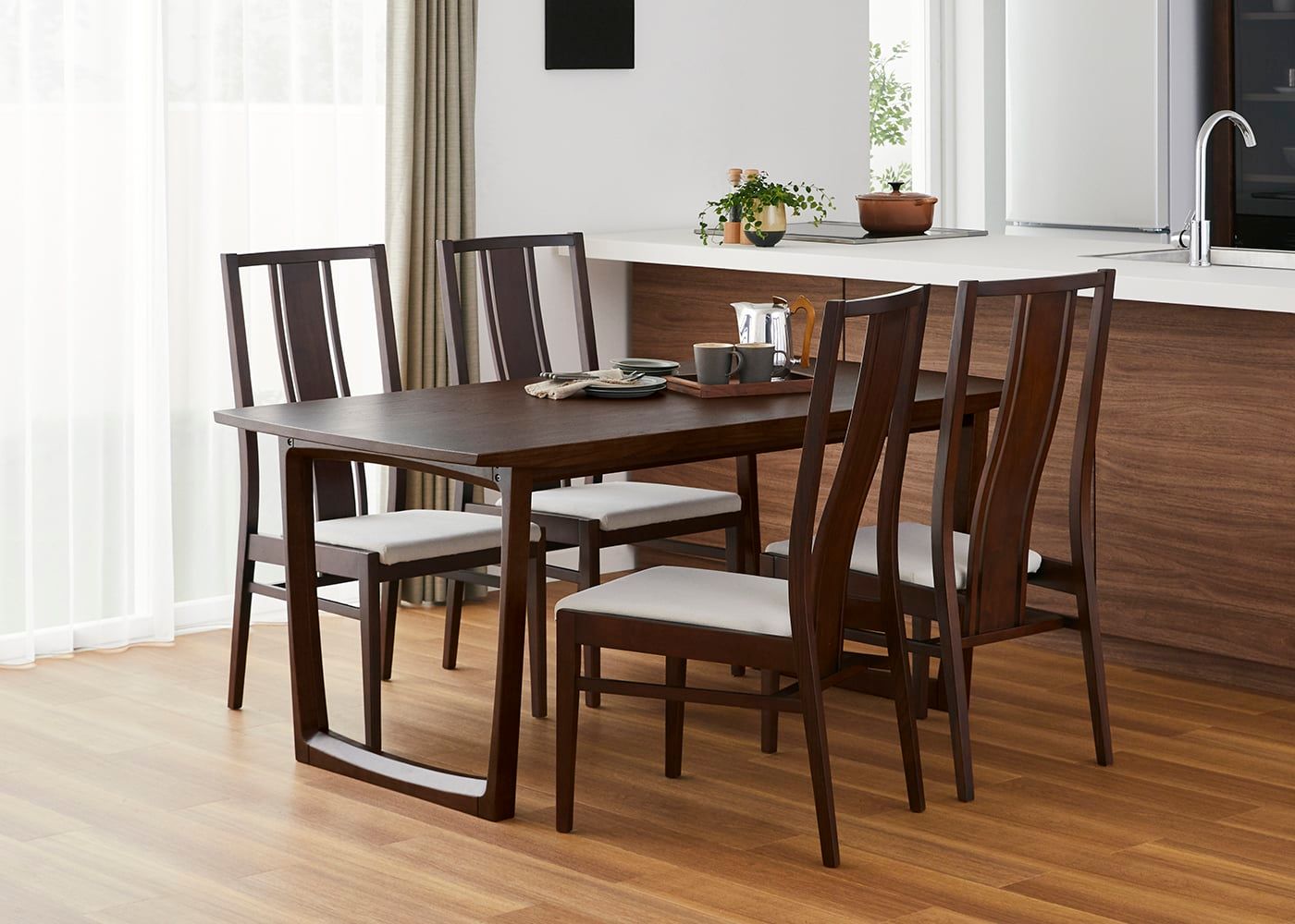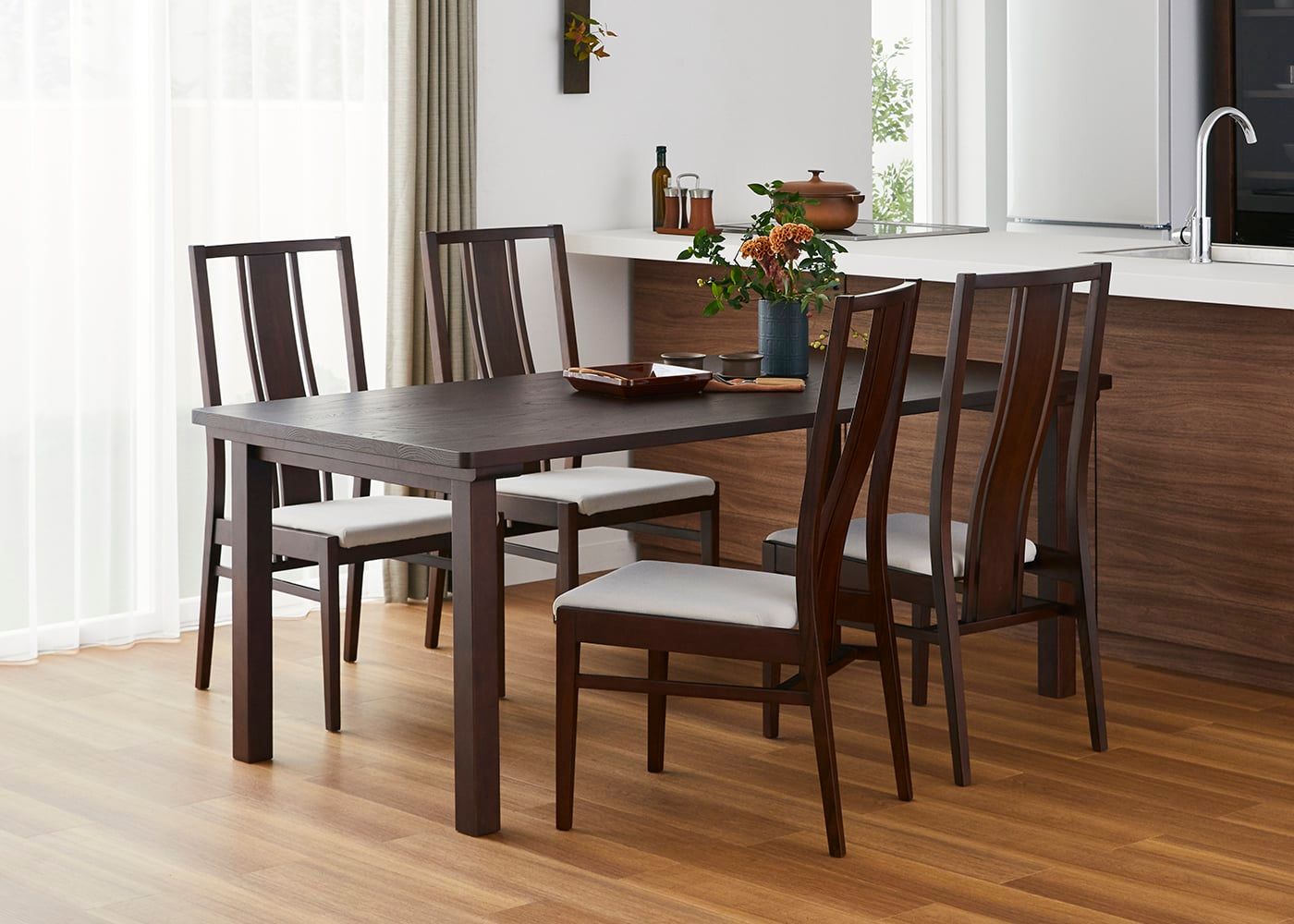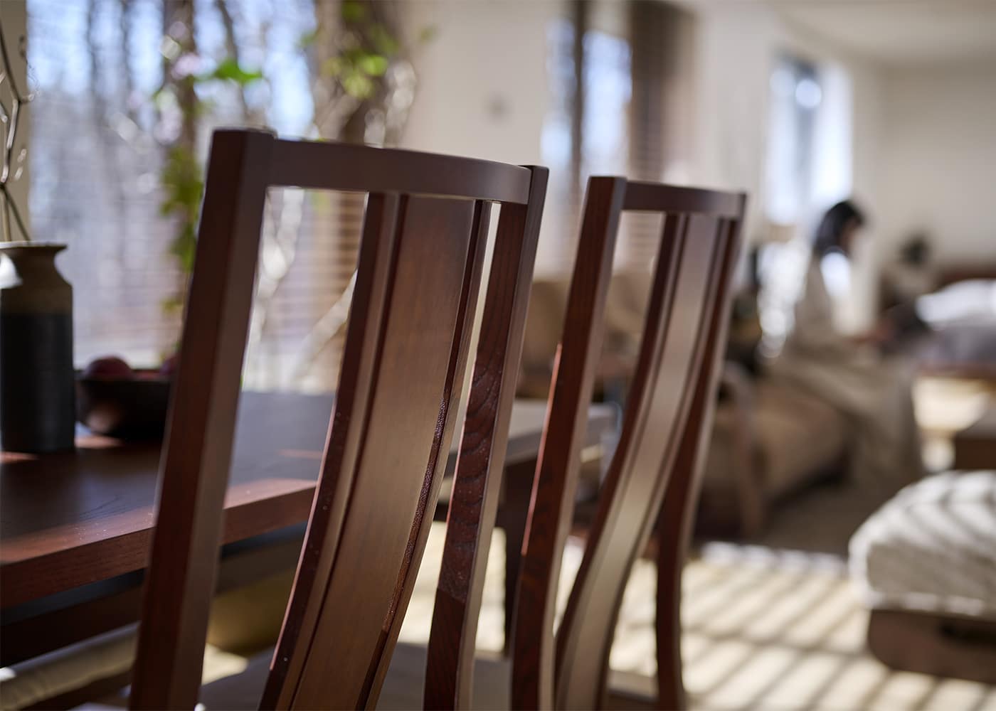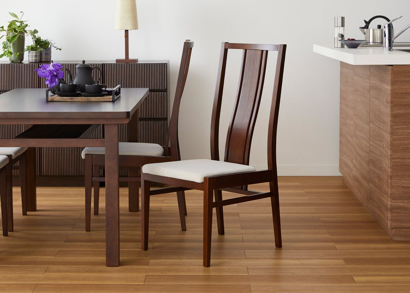 日々の暮らしでリビングからダイニングを見ることが多いため、背面のデザインにもこだわりました。座面の後側の抜け感と背もたれからつながるすらっとした後脚が脚長効果をもたらし、すっきりとした佇まいに。