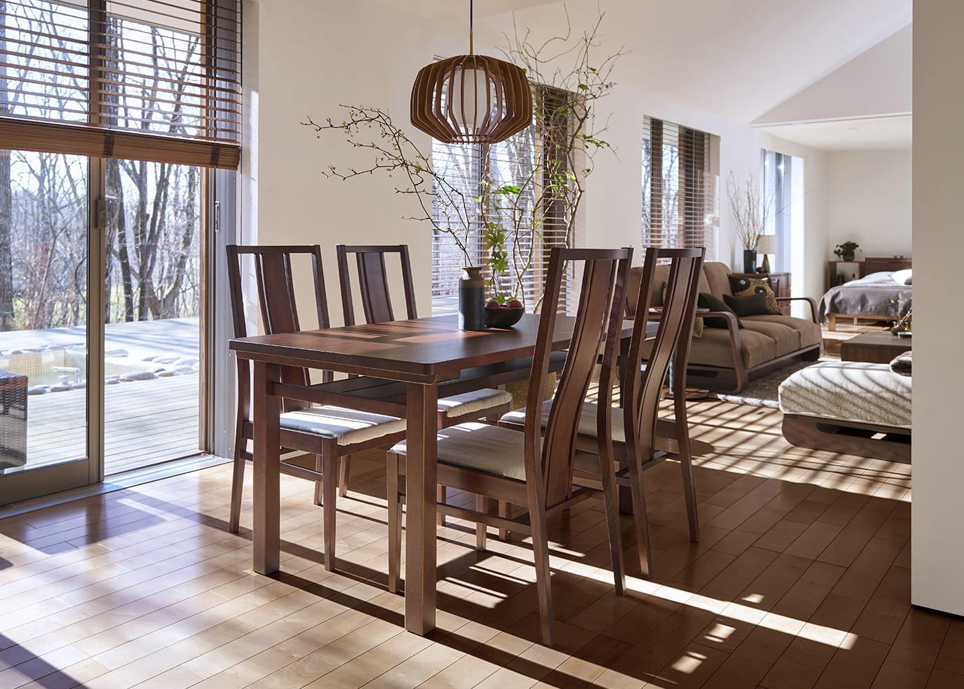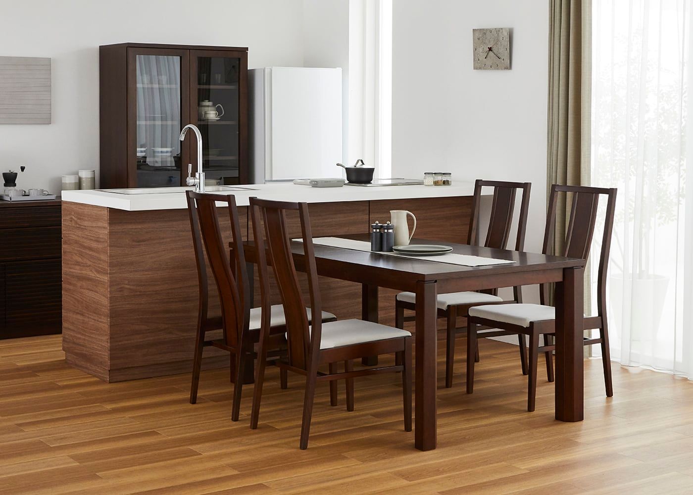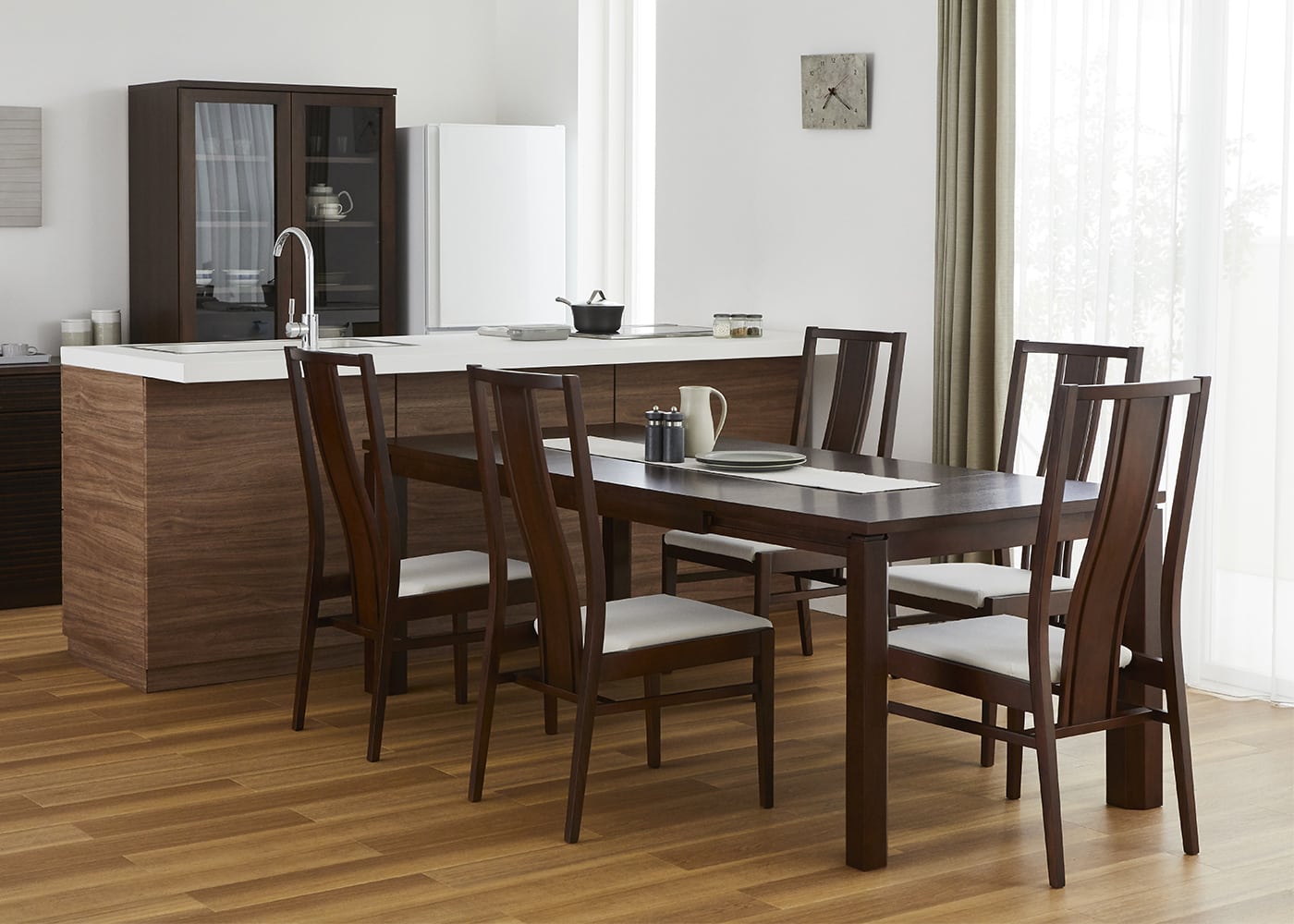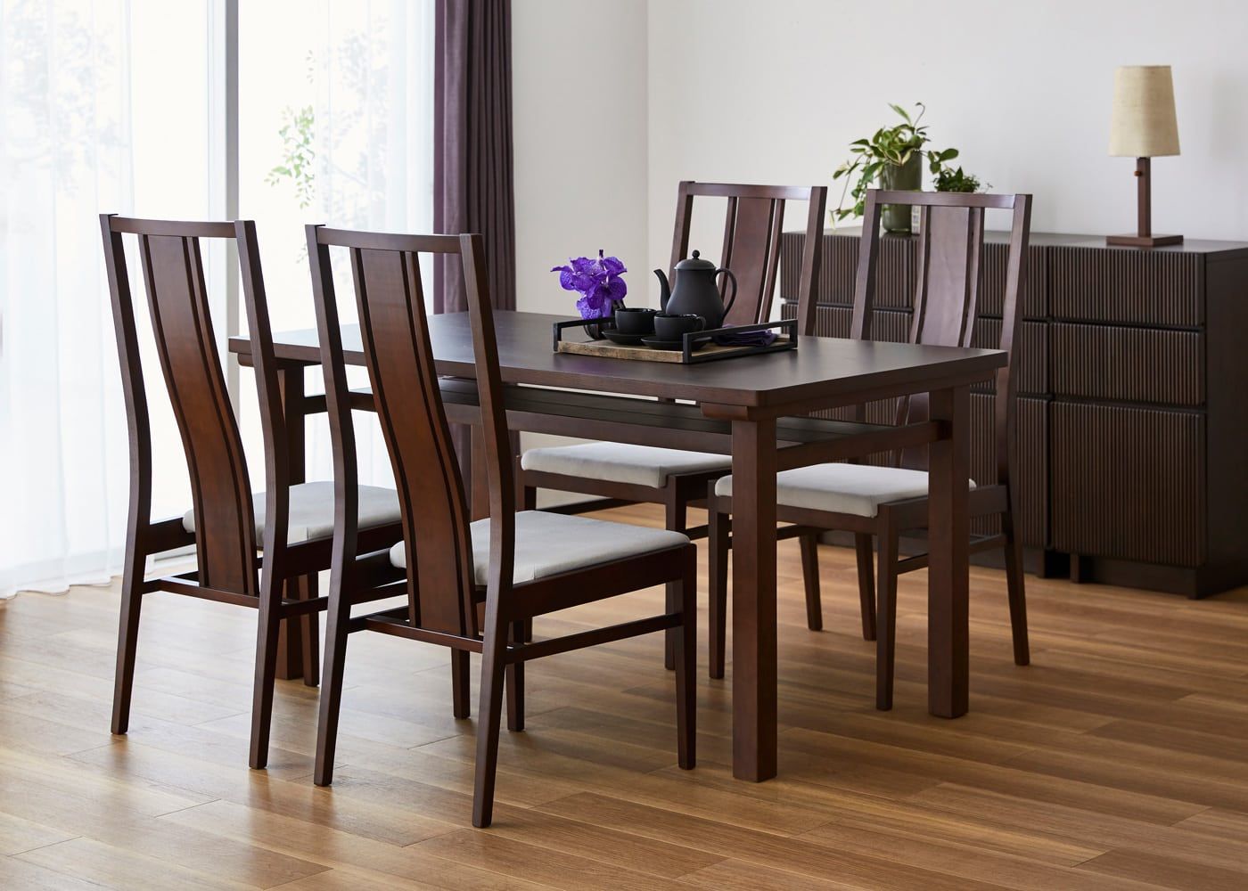 ダイニングテーブルを伸ばして、リン・ハイバックチェアを1脚追加した5人掛けの状態。流線型の美しい背もたれが立ち並び、存在感がある上質なダイニングでゲストと食事を味わえます。