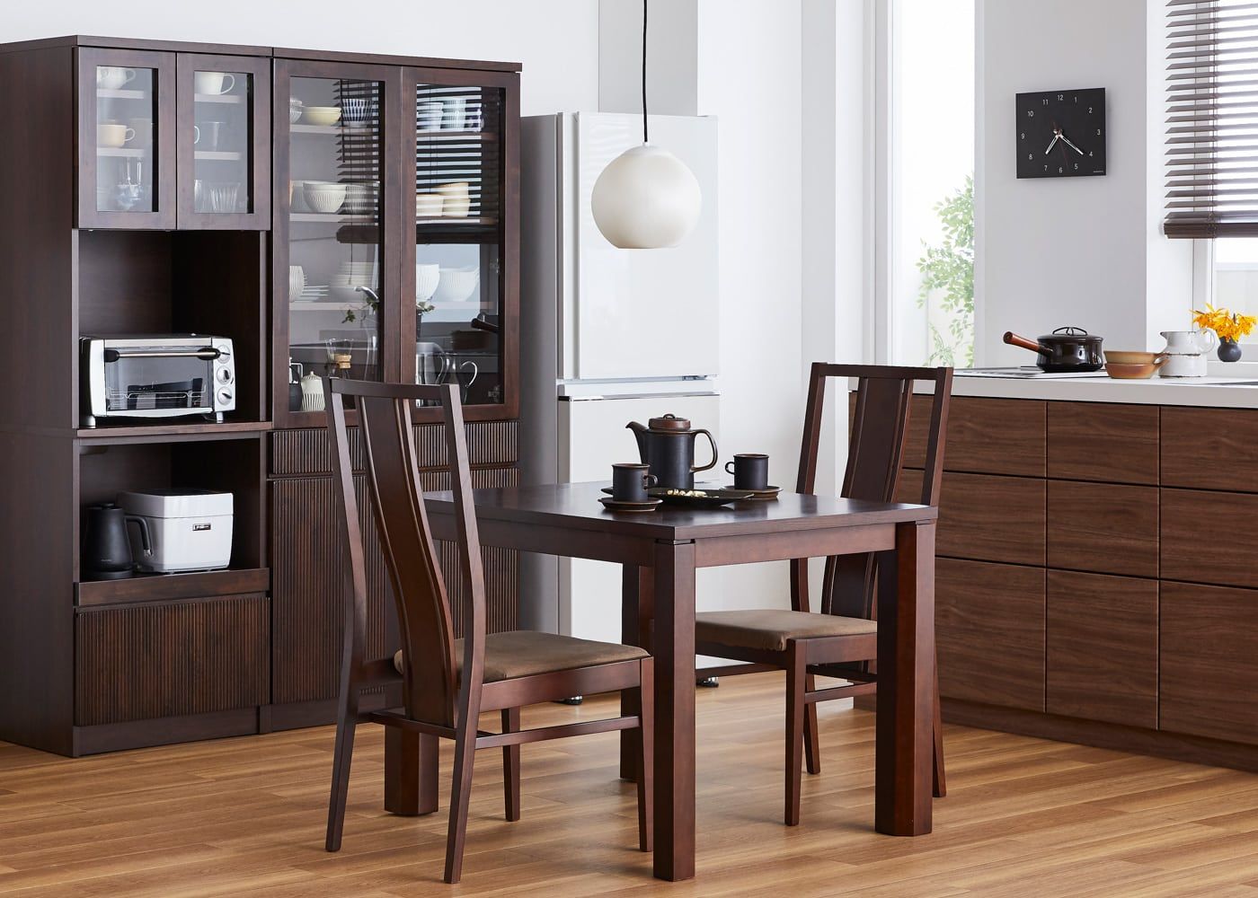 ダイニング周辺をシックなグレーでコーディネートすれば、モダンなイメージの食卓で食事を楽しむこともできます。また、ダークブラウンのダイニングテーブルとも綺麗に調和するため、高級感のあるダイニングを作ることも可能です。(写真は