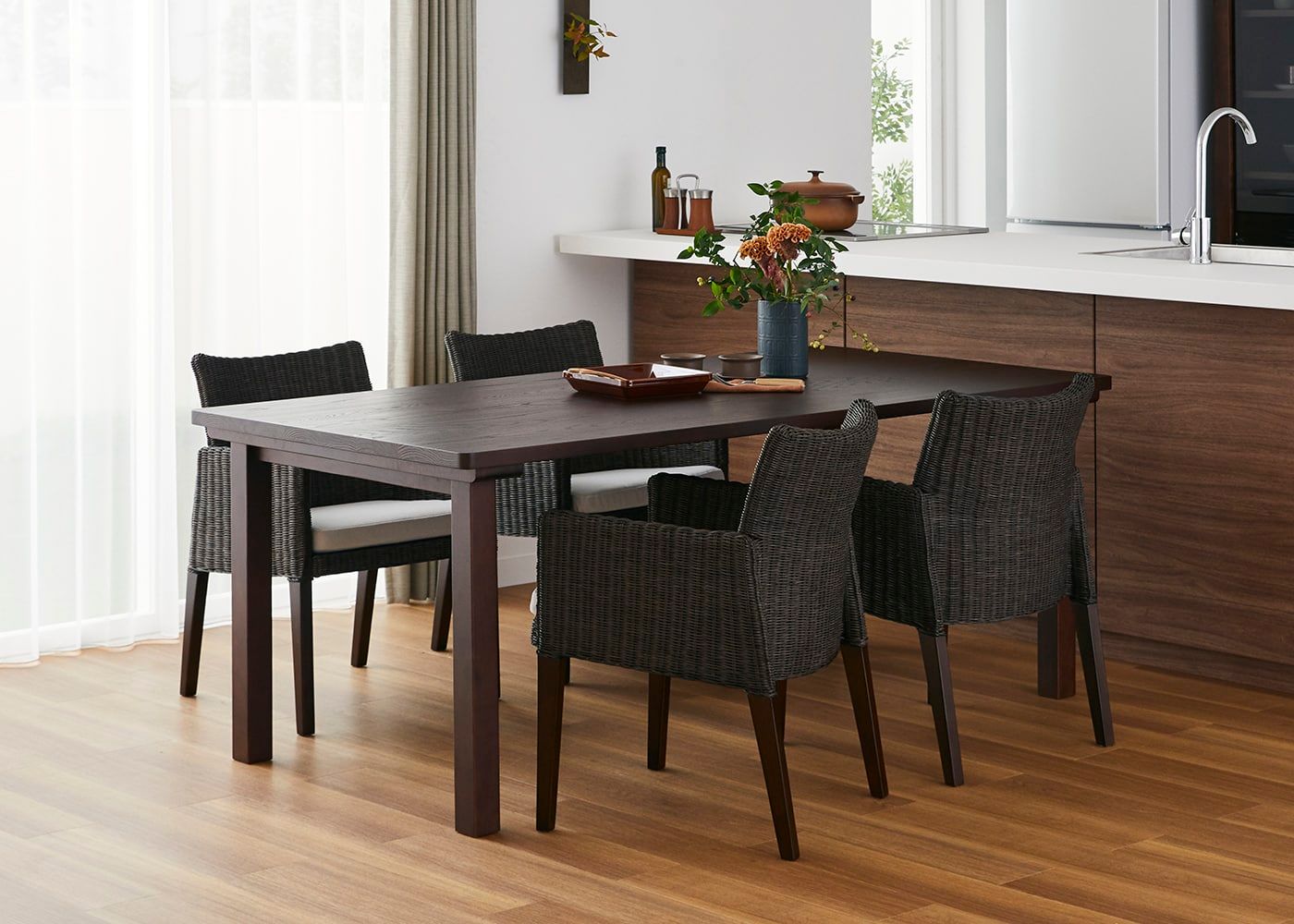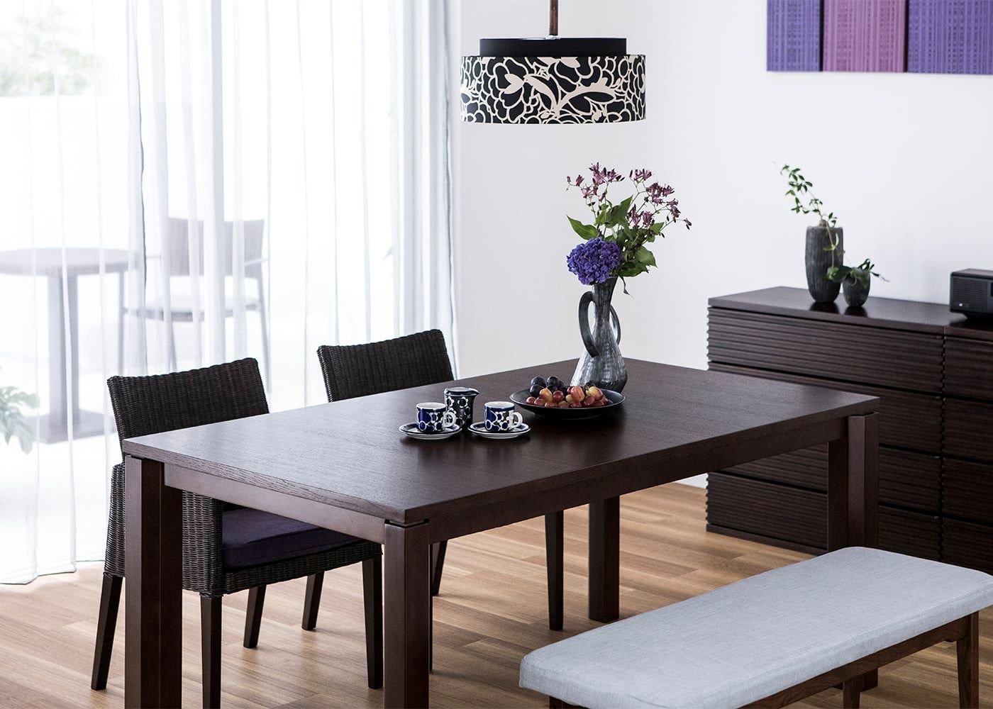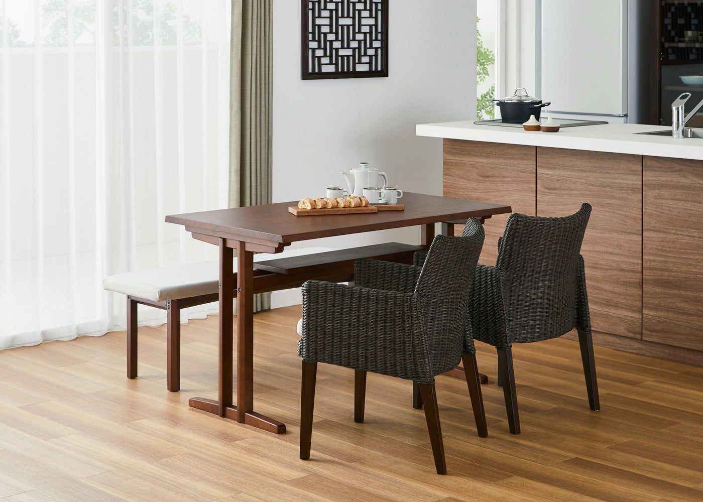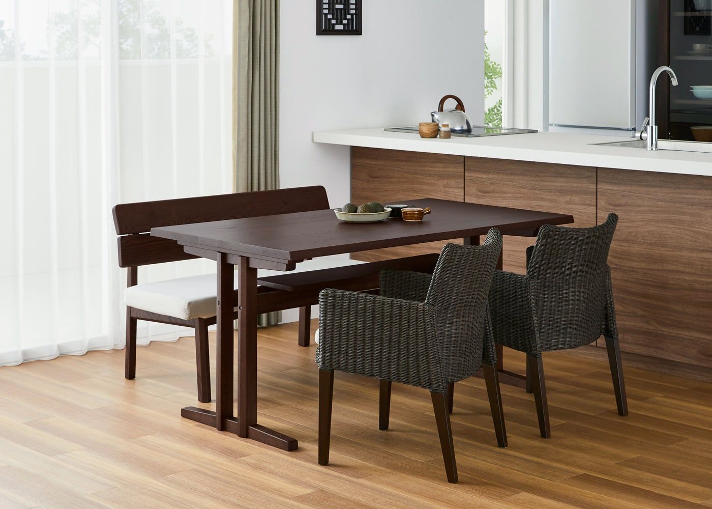 ダイニングベンチと組むことで、統一感のあるダークブラウンのコーディネートを楽しめます。お好みのチェアカバーなどもプラスして、理想の食卓を叶えてください。(写真のチェアカバーは