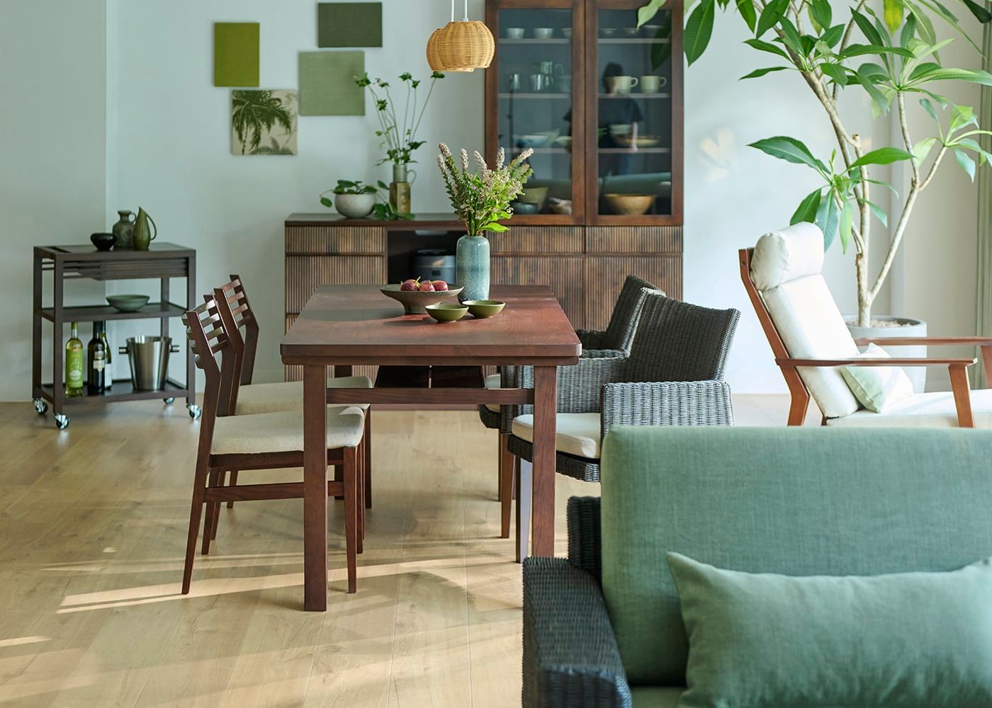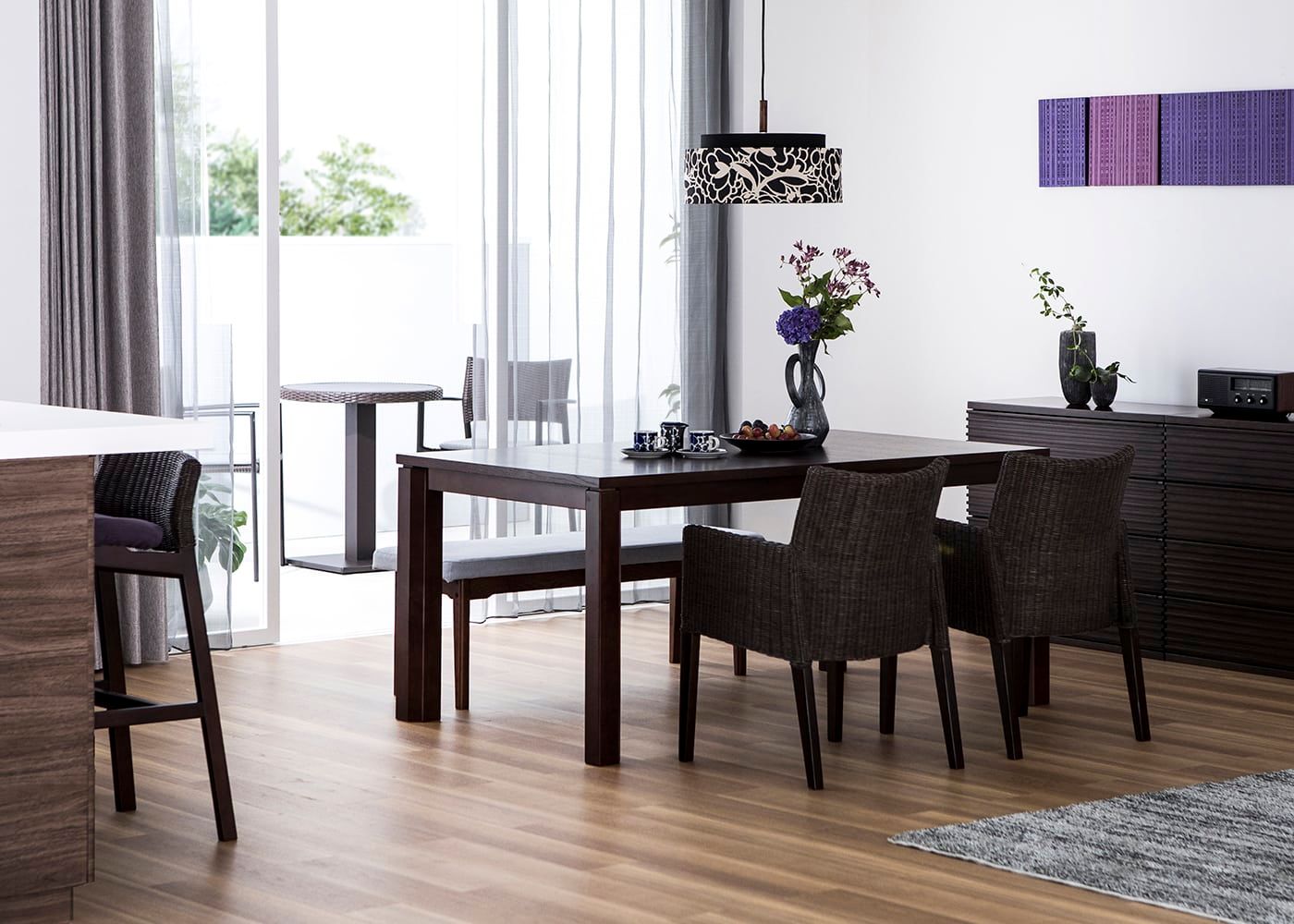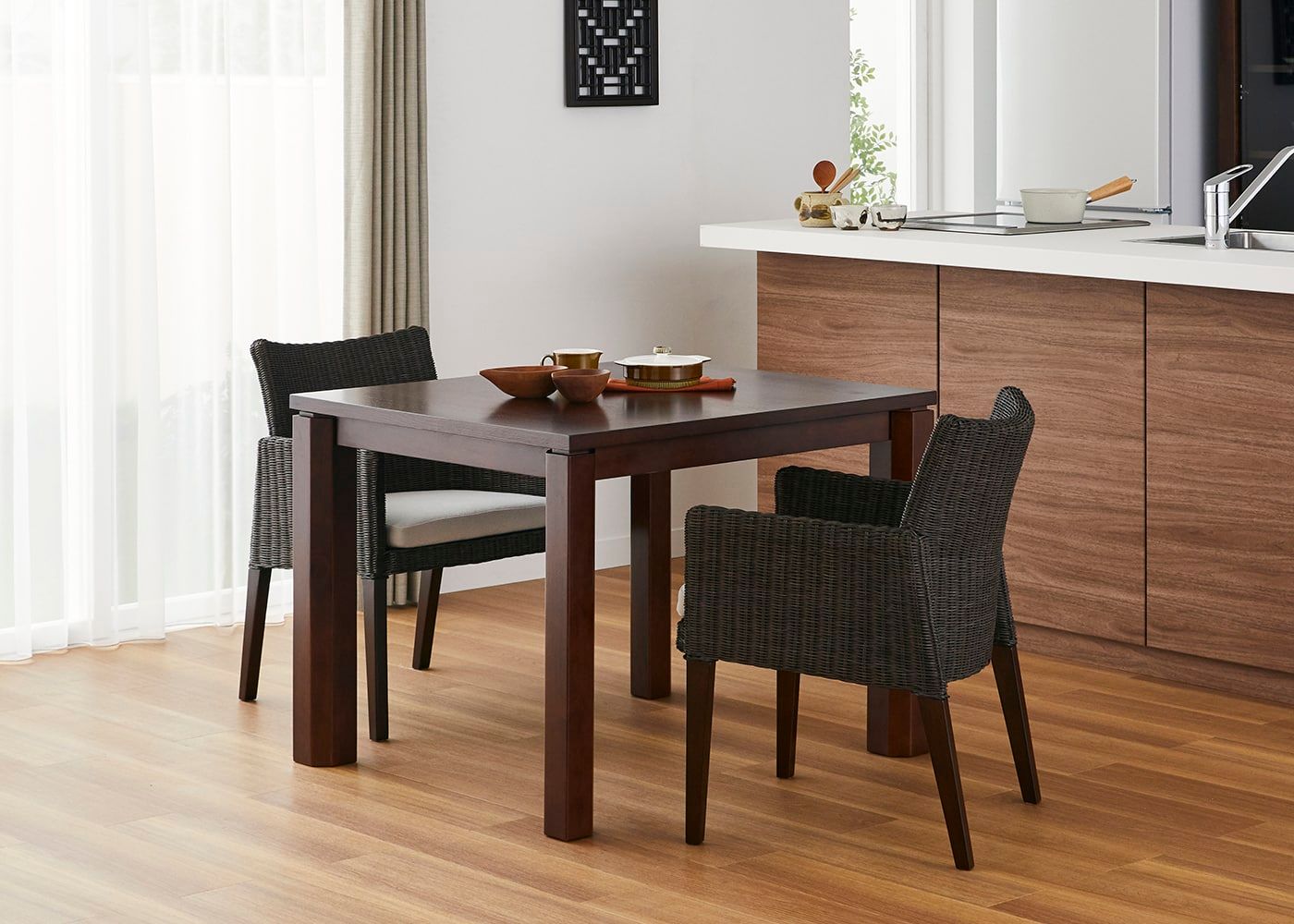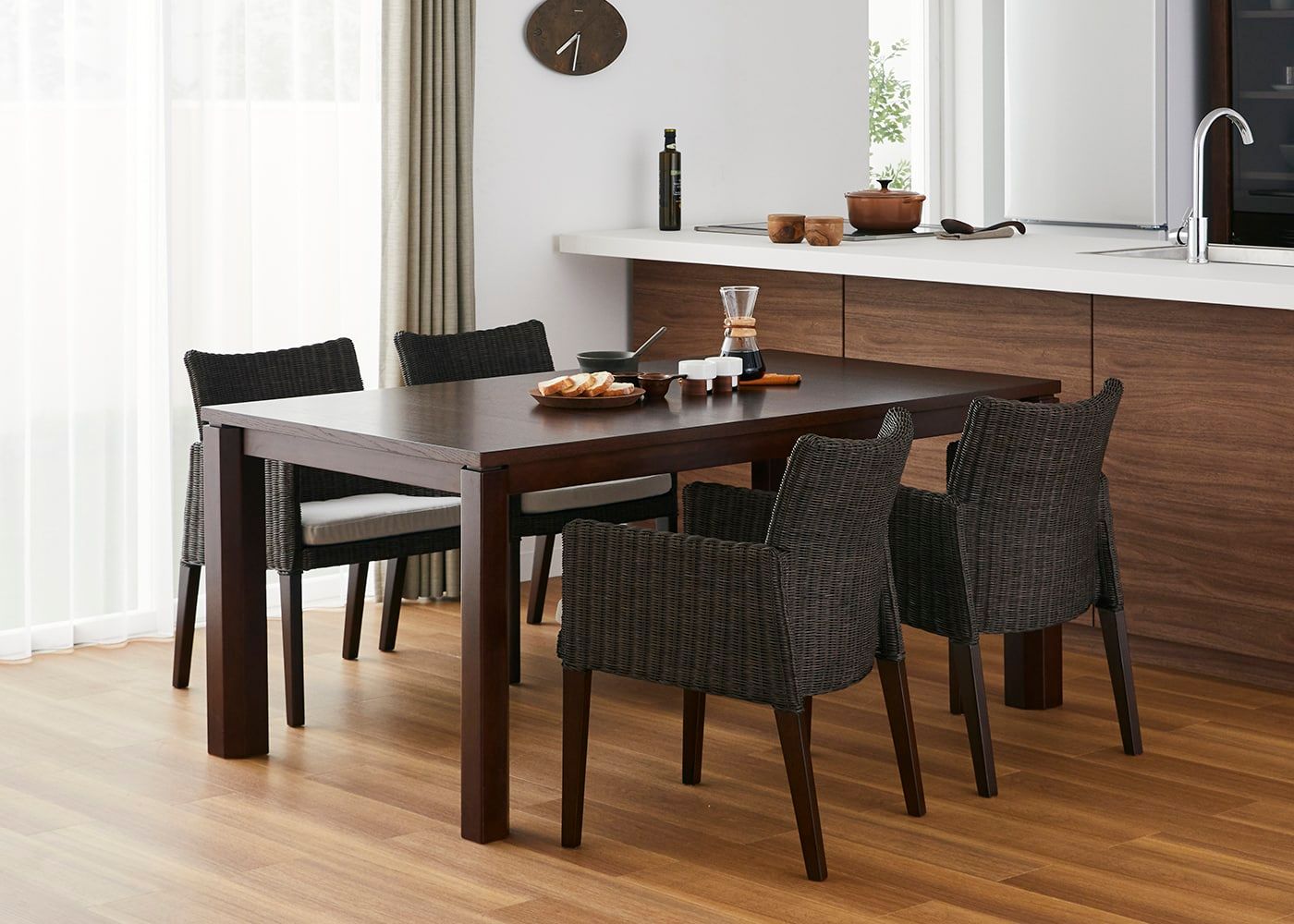 ダイニングベンチと組むことで、統一感のあるダークブラウンのコーディネートを楽しめます。お好みのチェアカバーなどもプラスして、理想の食卓を叶えてください。(写真のチェアカバーは