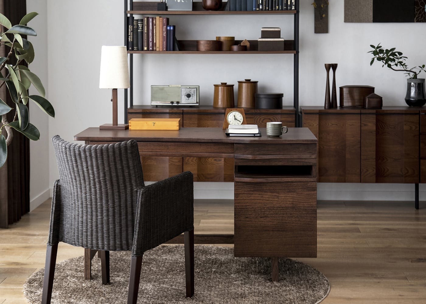 ムン・ダイニングアームチェアは食卓用のチェアとしてはもちろん、書斎用のチェアとしても使えます。無垢材のデスクと合わせて、リラックス感のあるスペースに仕上げれば仕事や作業も捗るでしょう。(写真は