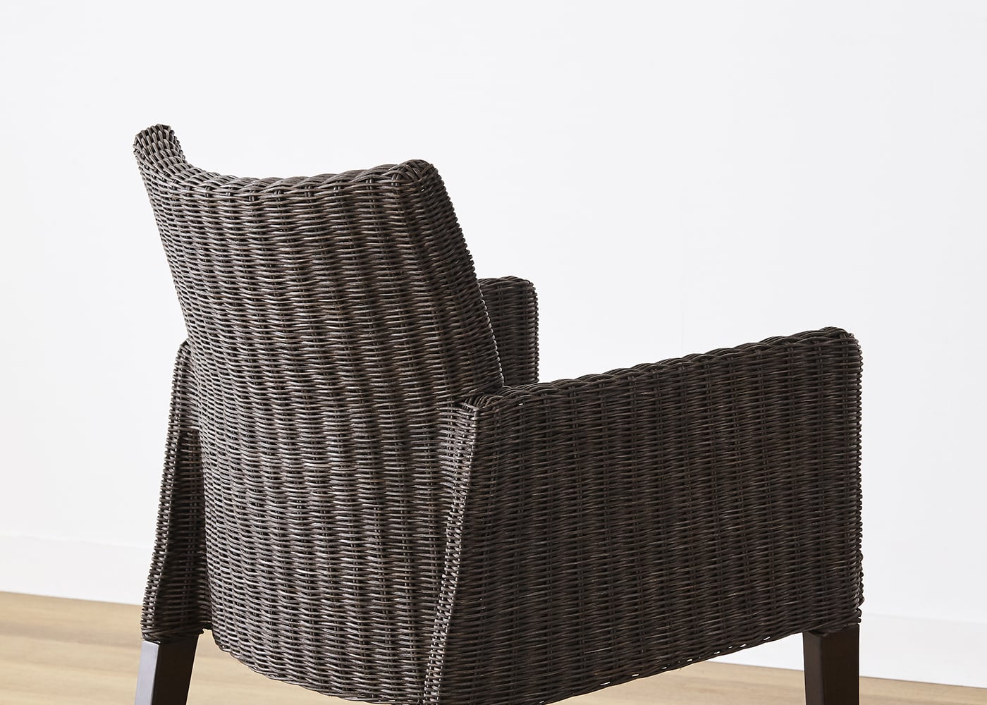 アームまでつながる細くて軽やかな脚のデザインにこだわりました。ラタン編み部分のボリューム感と脚の抜け感が調和することで、重厚感とリゾートの開放感をもたらすアームチェアです。
