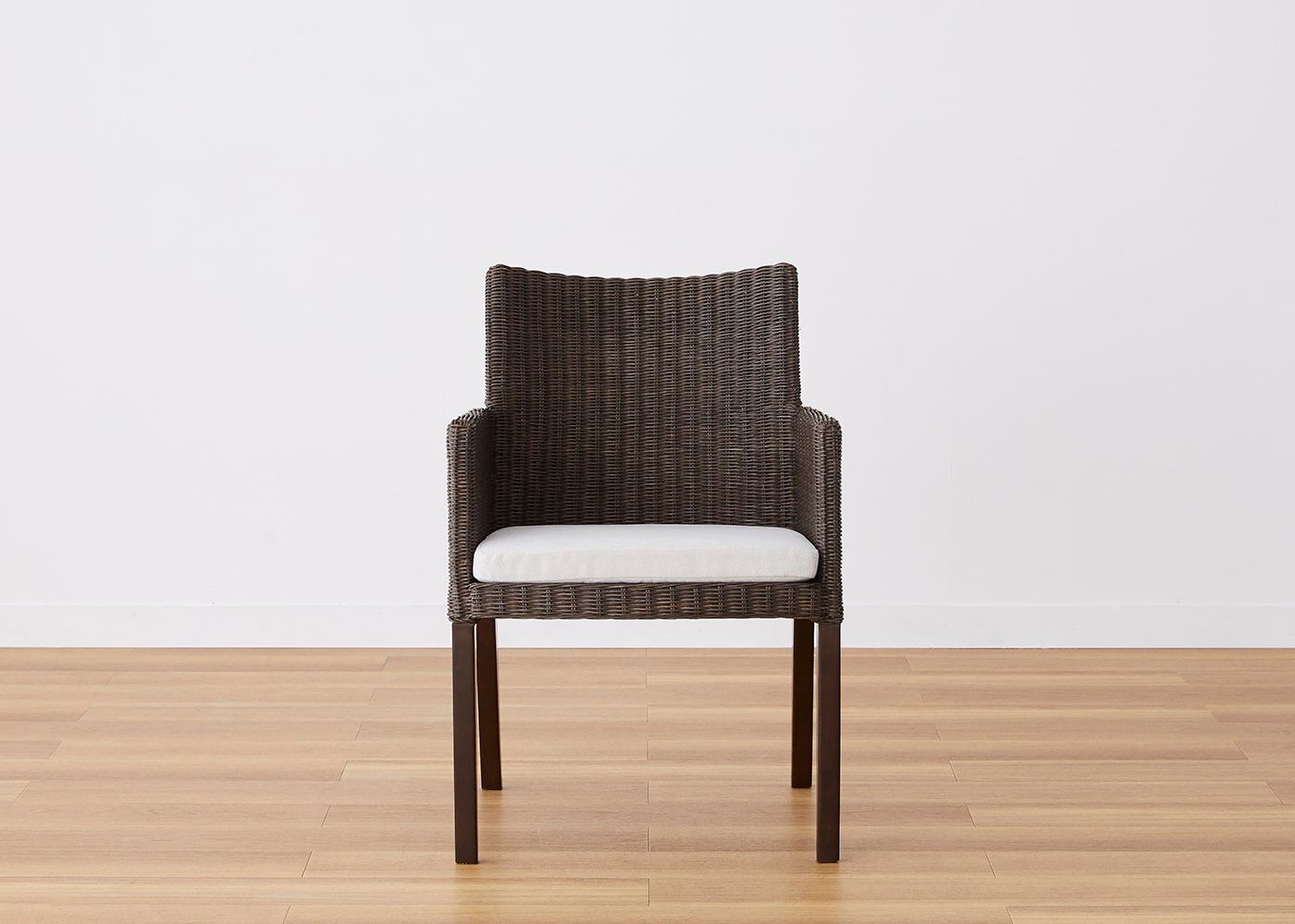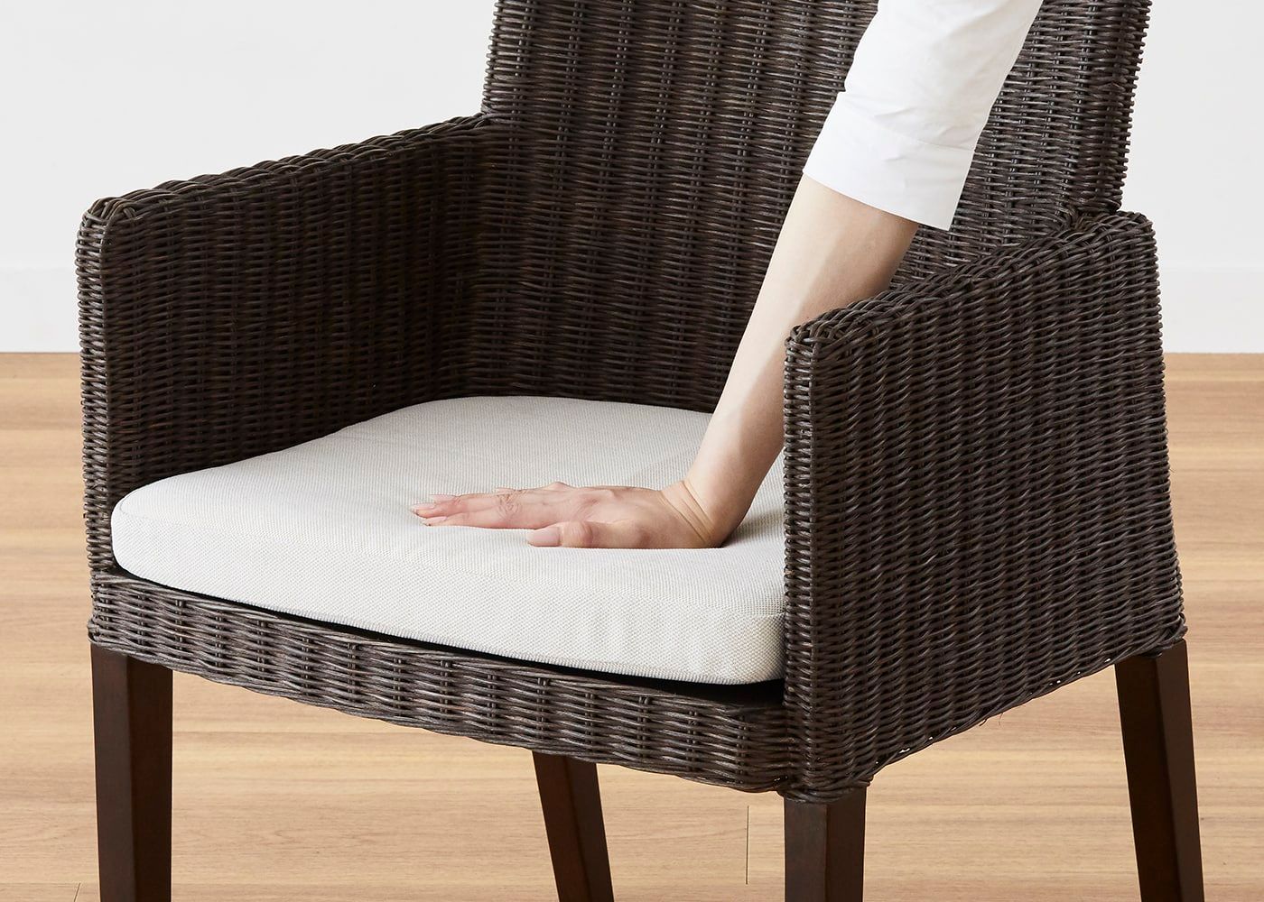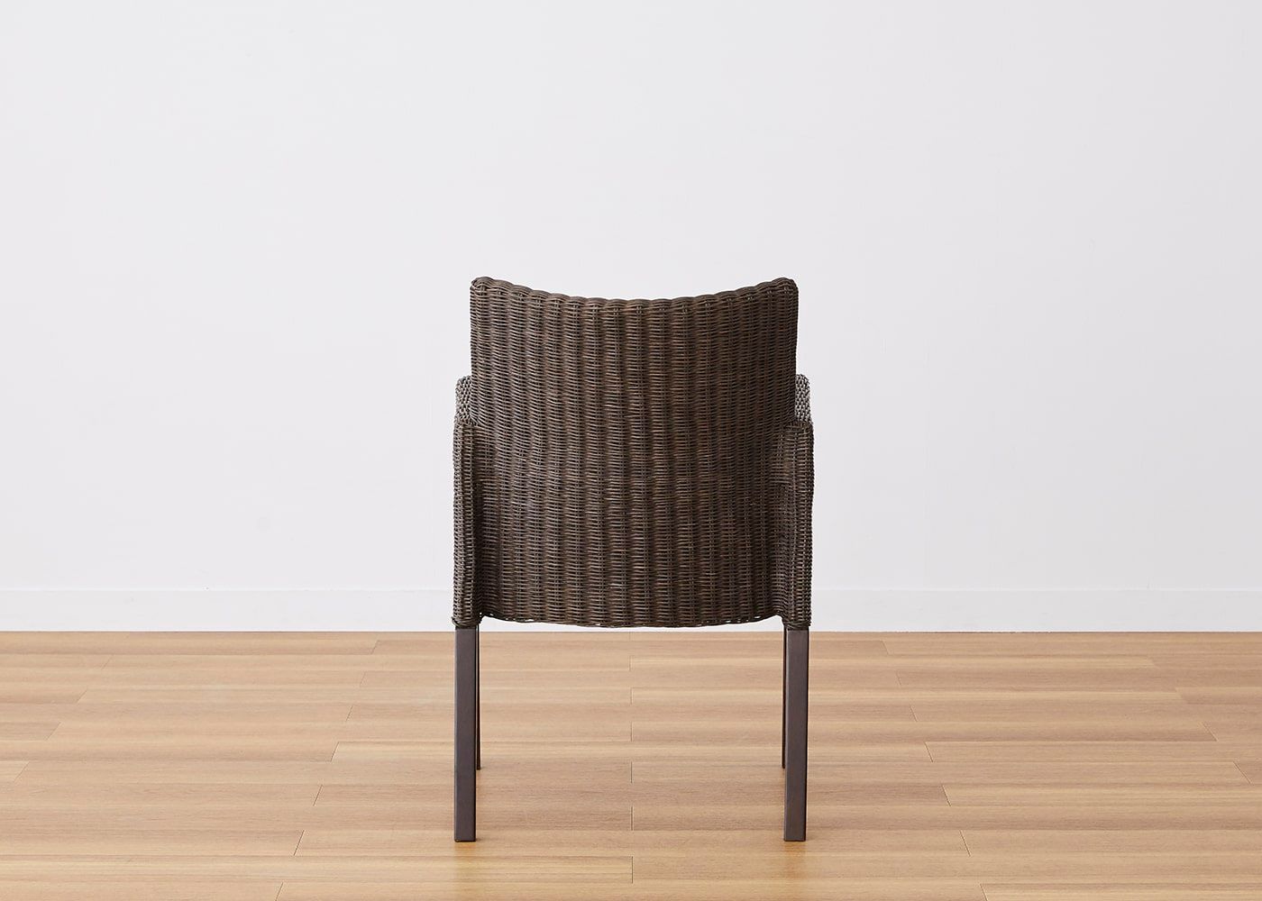 アーム全体にラタン素材が編み込まれているため、アームの角や上面にも適度に丸みが生まれます。腕や手へのあたりがやさしいアームチェアです。