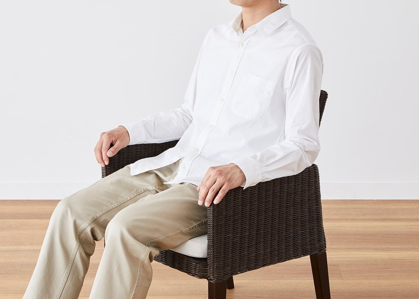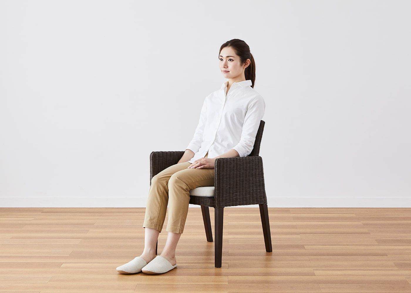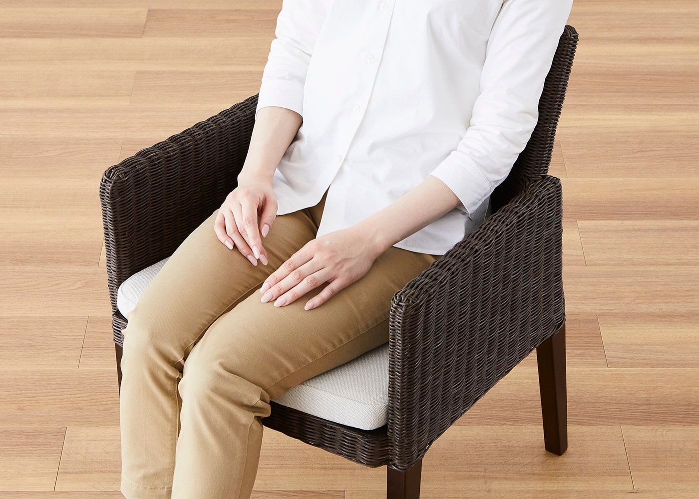 両側が抜けていないアームチェアでも太もも周りが広く、余裕をもって座れます。(モデルは身長167cmの女性)