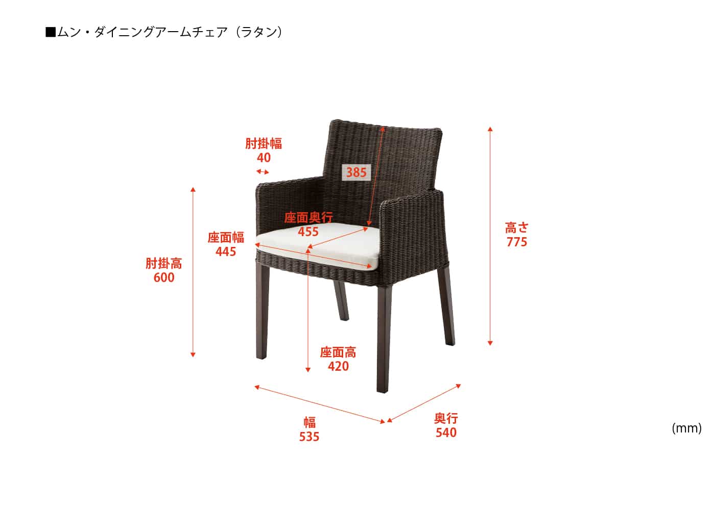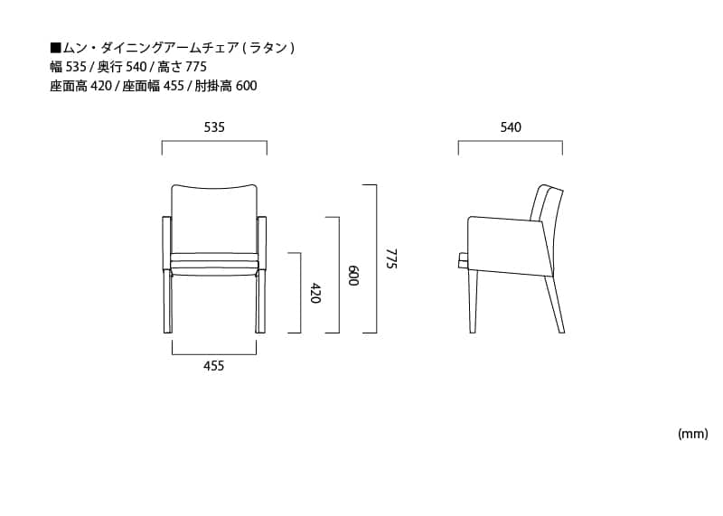 幅535 / 奥行540 / 高さ775 / 座面高420 / 肘掛高600 ※単位は mm