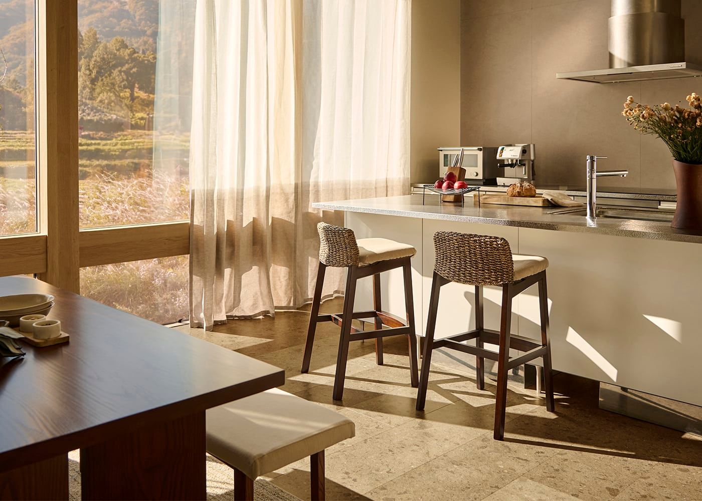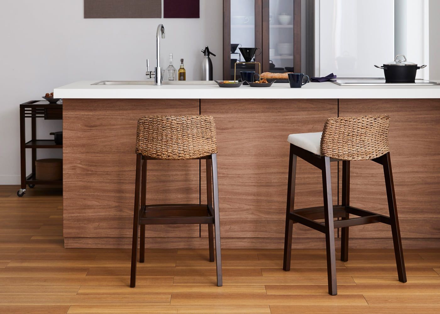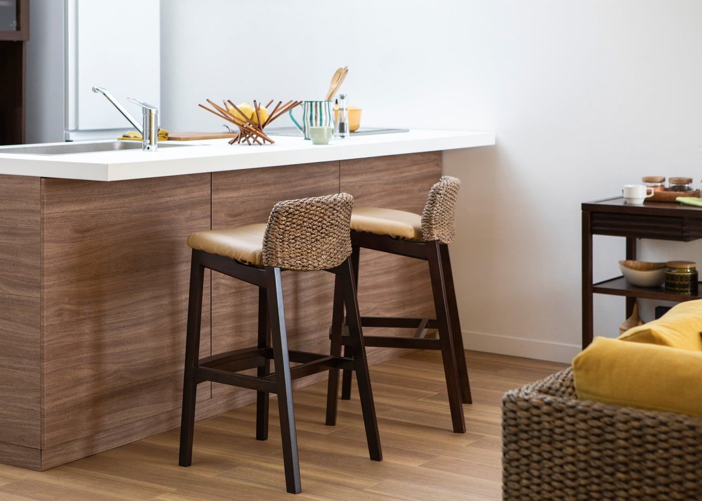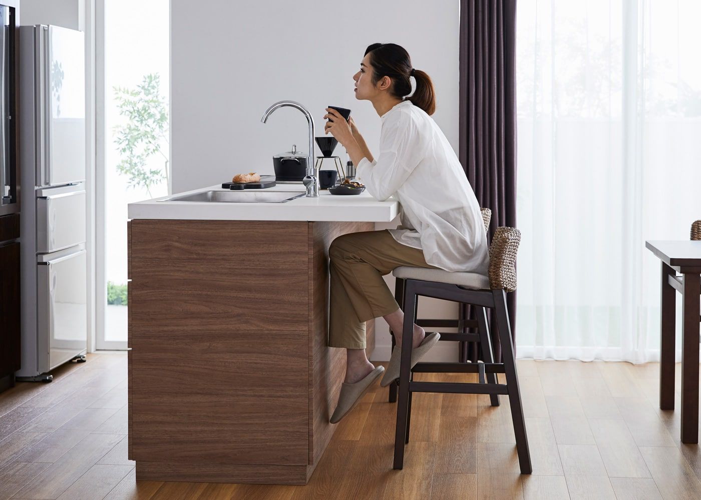 a.flatのカウンターチェアはカバーの着せ替えができるのが魅力。約100色のファブリックから素材や色を選んで、あなただけのカラーコーディネートをお楽しみください。(別売、受注生産)