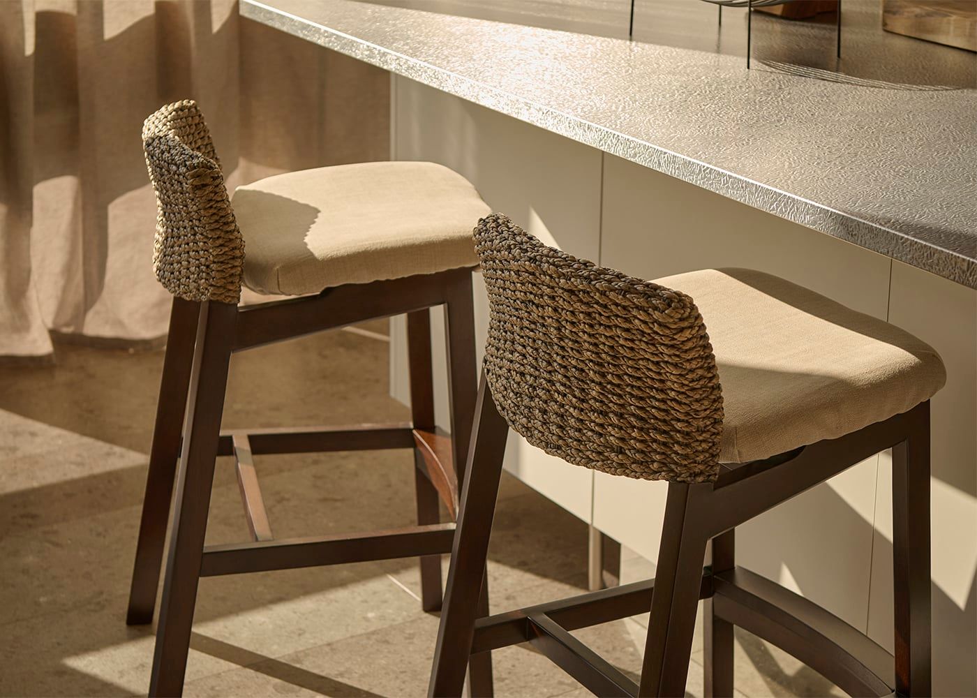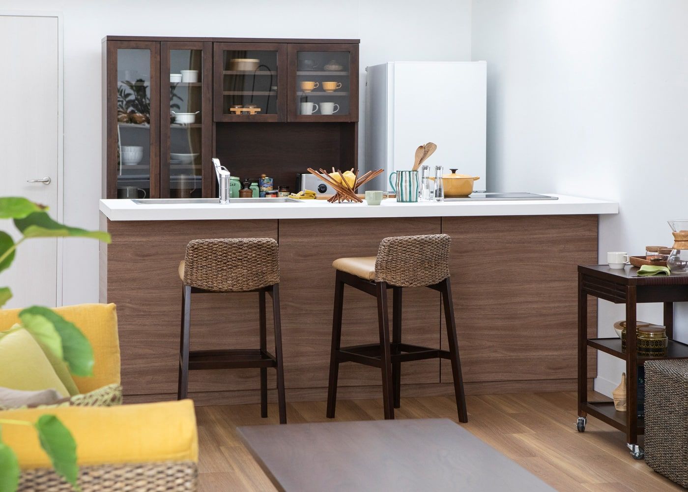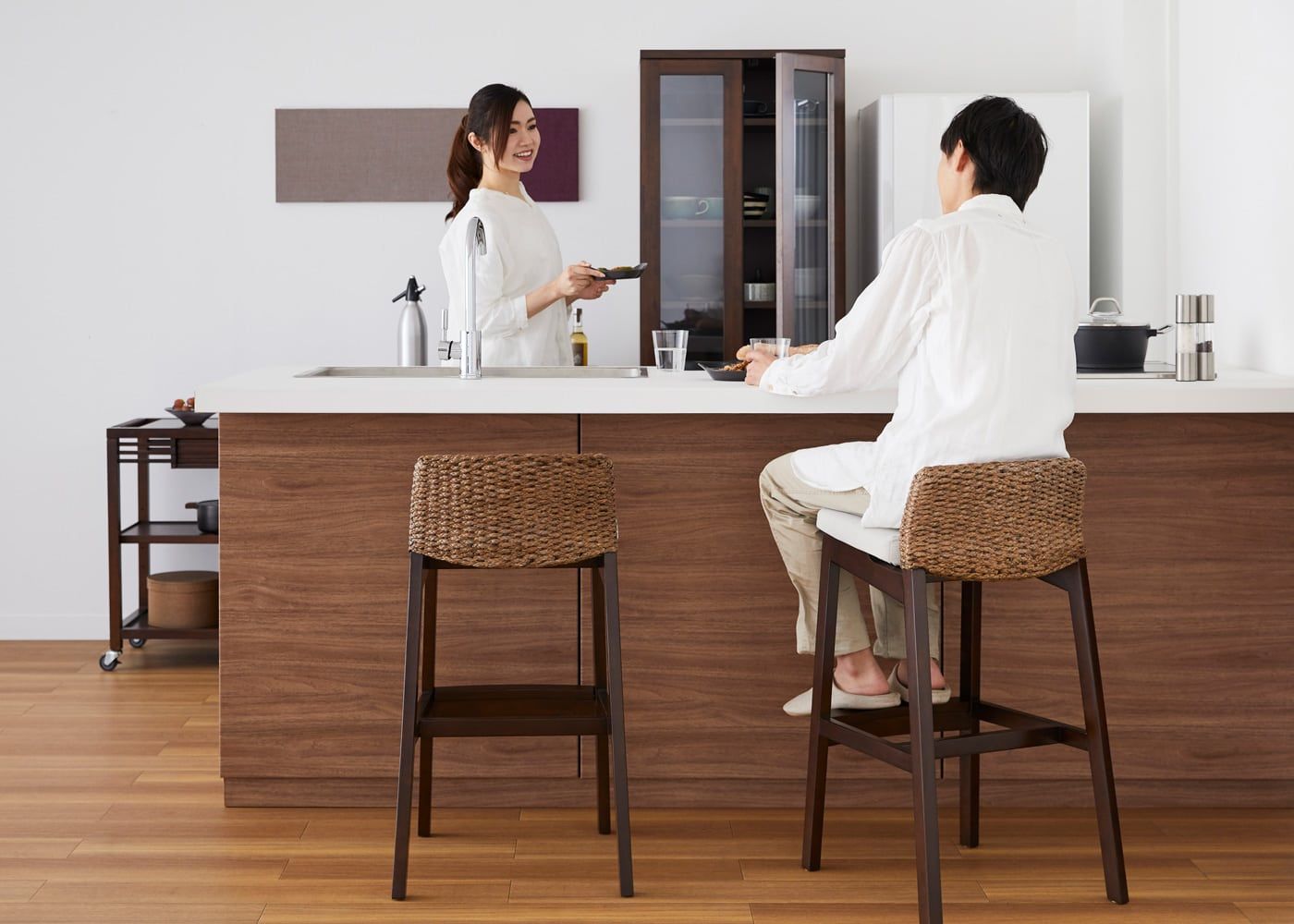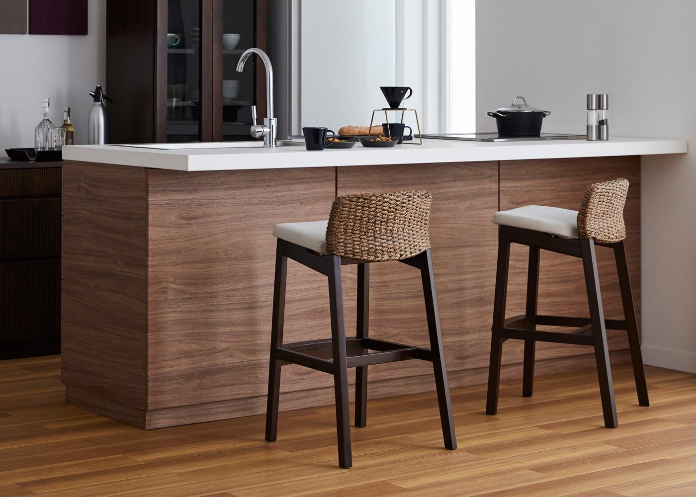 a.flatのカウンターチェアはカバーの着せ替えができるのが魅力。約100色のファブリックから素材や色を選んで、あなただけのカラーコーディネートをお楽しみください。(別売、受注生産)
