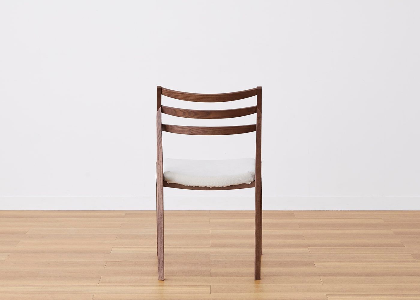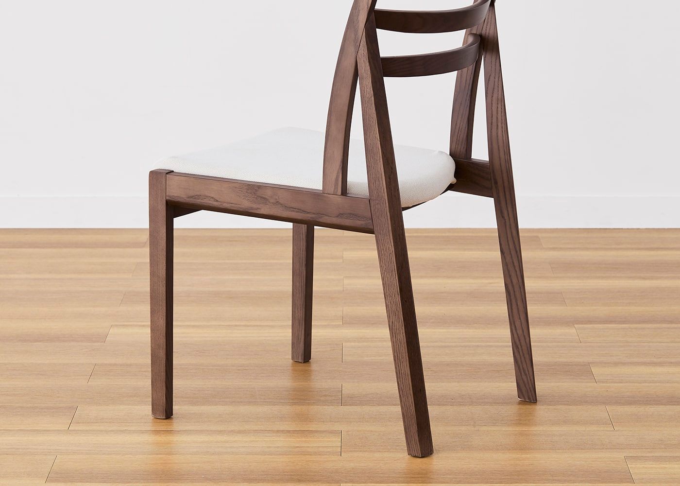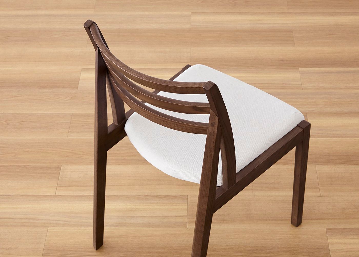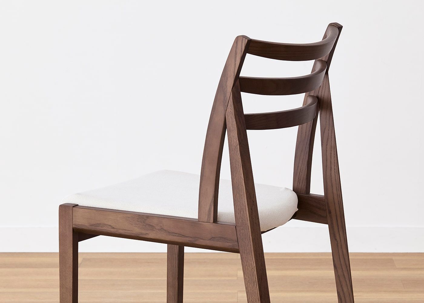 日々の暮らしでリビングからダイニングを見ることが多いため、背面のデザインにもこだわりました。エッジ加工した台形状の後脚や座枠がセイルならではのディテールです。見る角度によって形状の変化や光の陰影が楽しめます。また、座面の後ろ側の抜けと脚に貫材のない構造が脚長効果をもたらし、すっきりとした佇まいに。