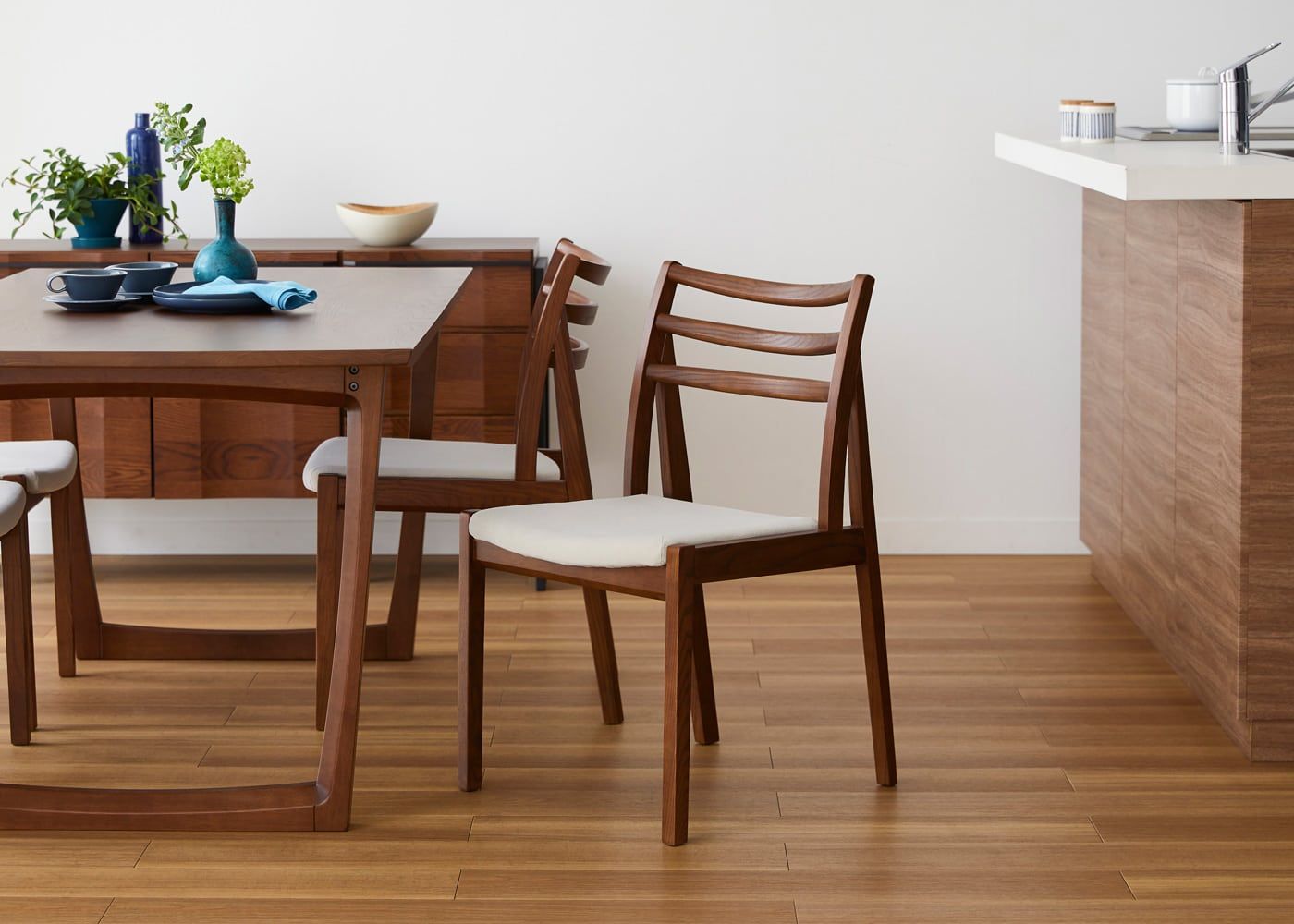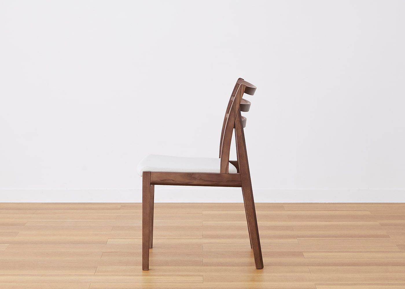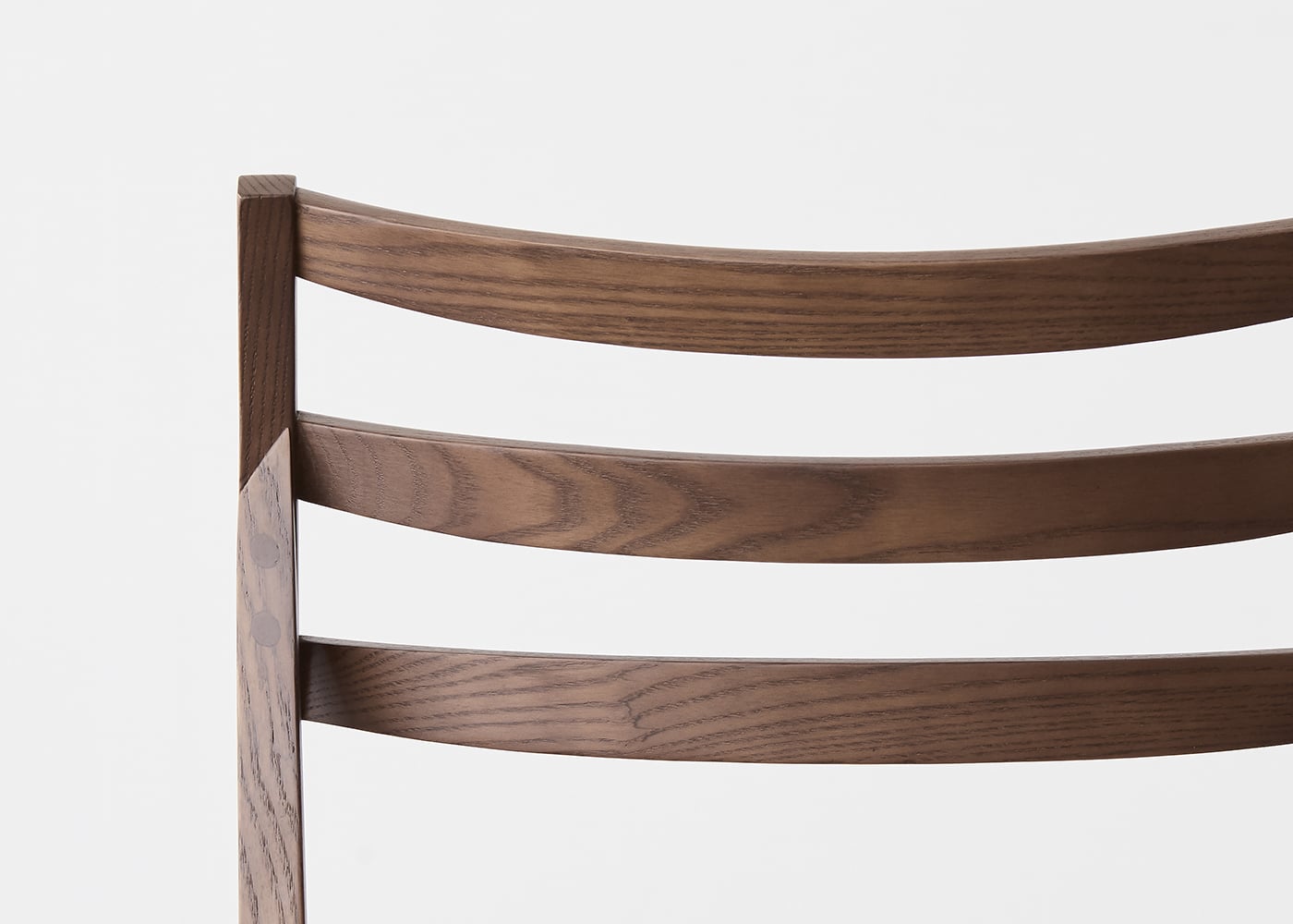 日々の暮らしでリビングからダイニングを見ることが多いため、背面のデザインにもこだわりました。エッジ加工した台形状の後脚や座枠がセイルならではのディテールです。見る角度によって形状の変化や光の陰影が楽しめます。また、座面の後ろ側の抜けと脚に貫材のない構造が脚長効果をもたらし、すっきりとした佇まいに。