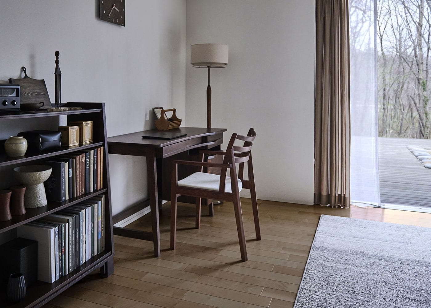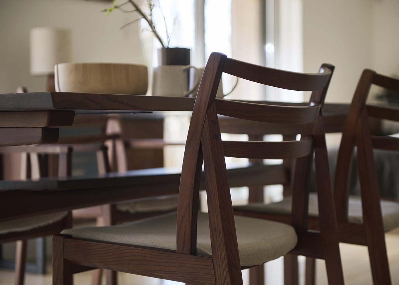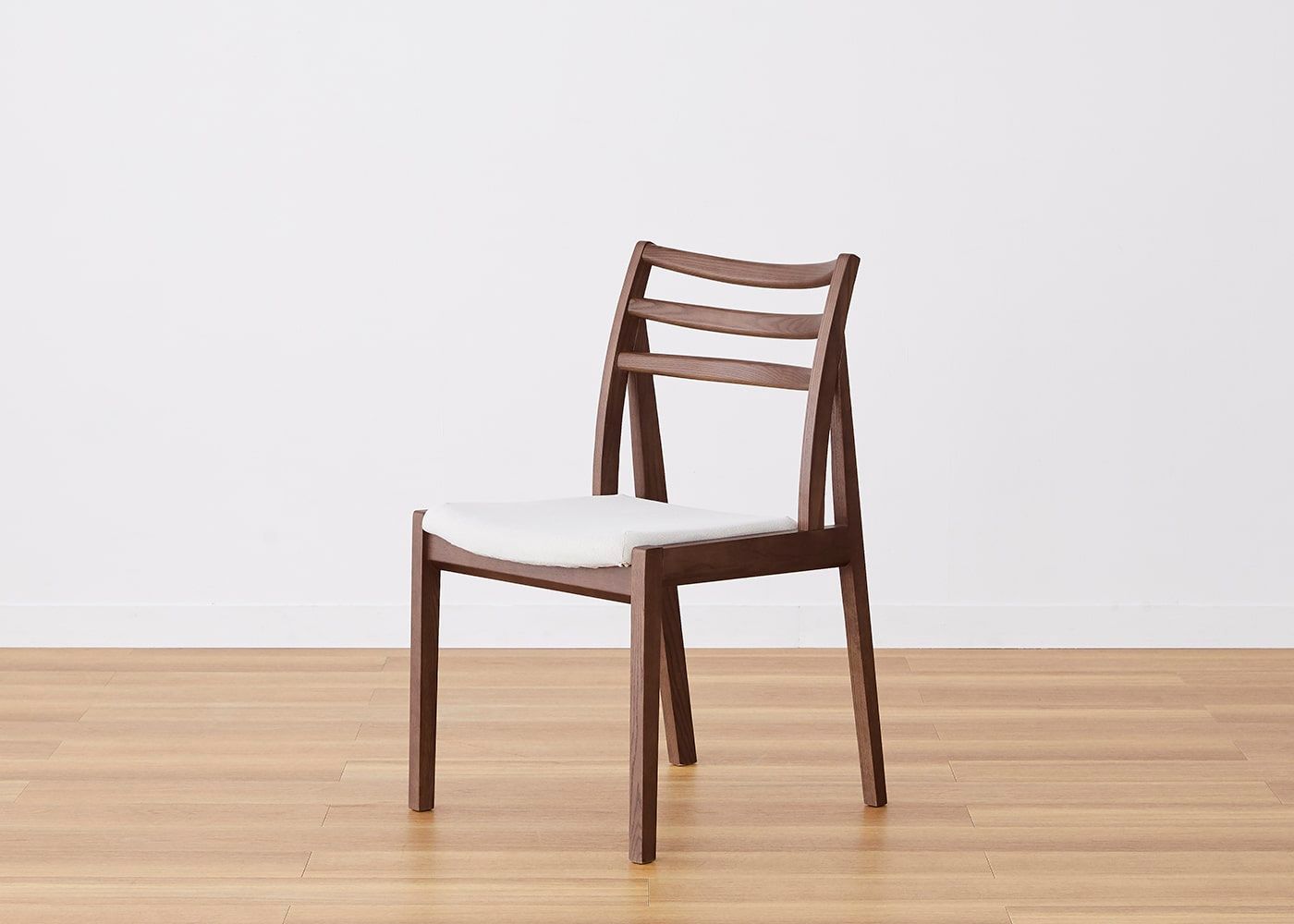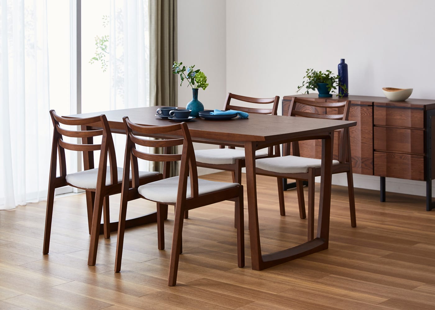 日々の暮らしでリビングからダイニングを見ることが多いため、背面のデザインにもこだわりました。エッジ加工した台形状の後脚や座枠がセイルならではのディテールです。見る角度によって形状の変化や光の陰影が楽しめます。また、座面の後ろ側の抜けと脚に貫材のない構造が脚長効果をもたらし、すっきりとした佇まいに。