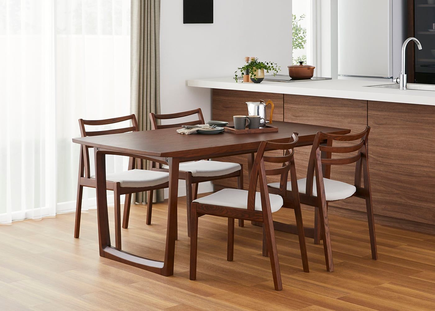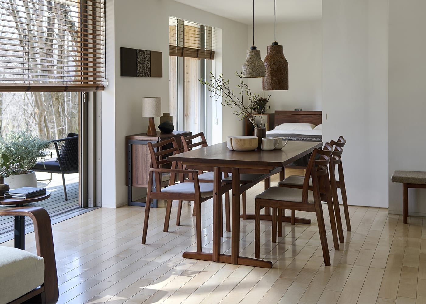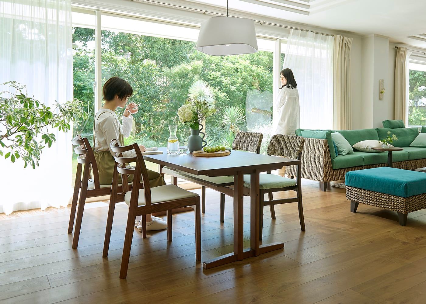 自然を感じるようダイニング作りには、無垢材のテーブルやチェアがぴったりです。爽やかなグリーンのチェアカバーや植栽と調和し、食事の時間がよりリラックスできる特別なひとときに変わります。自然や緑の効果で日々の疲れを癒しましょう。