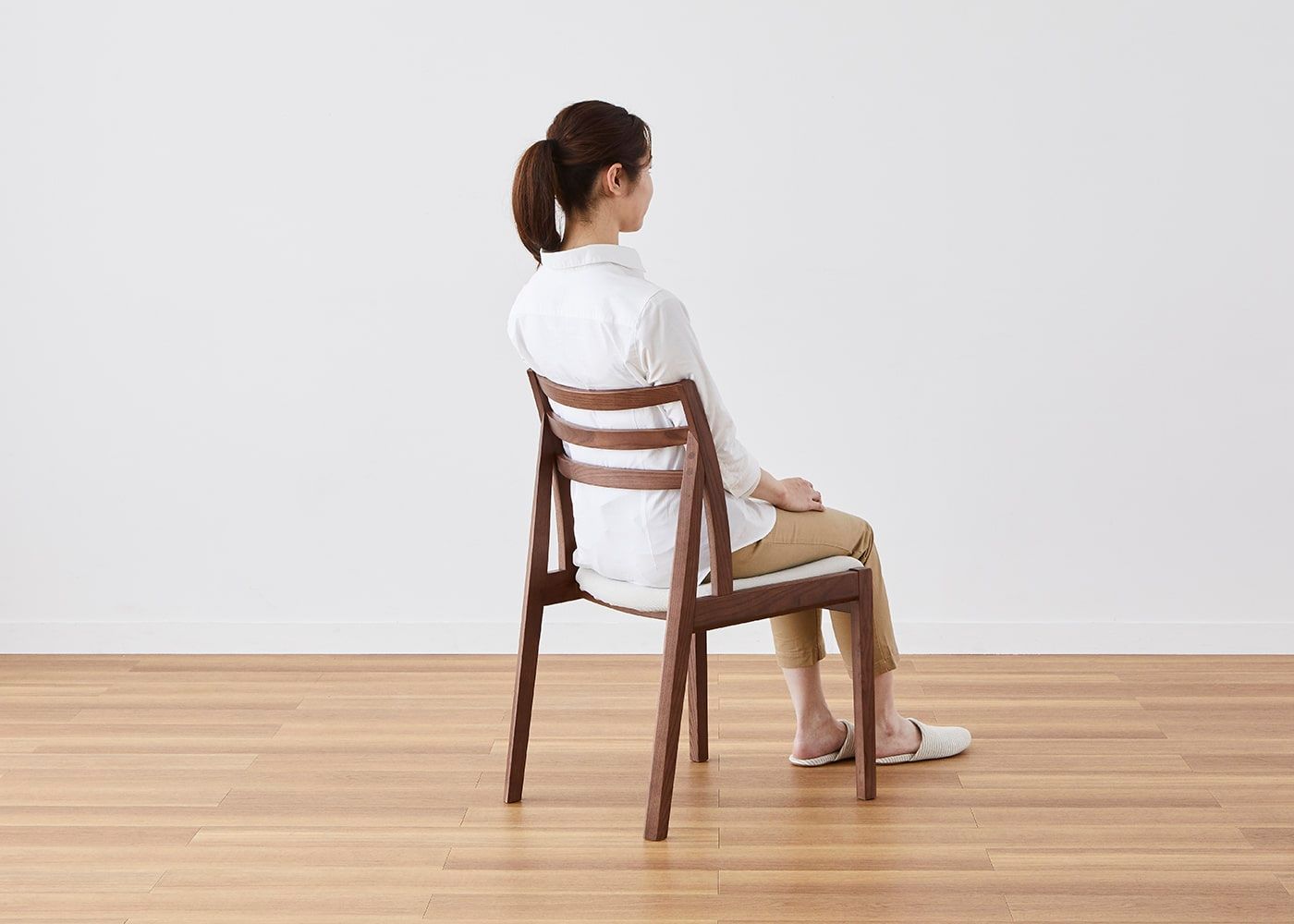 3本ある背もたれの取り付け角度をそれぞれ変えることで、ゆるやかに「く」の字を描いた背もたれが実現しました。背骨が自然なS字曲線を描くことで、正しい座り姿勢を保ちます。肩甲骨の下まである背もたれが、背中をしっかり支えてくれます。(モデルは身長167cmの女性)