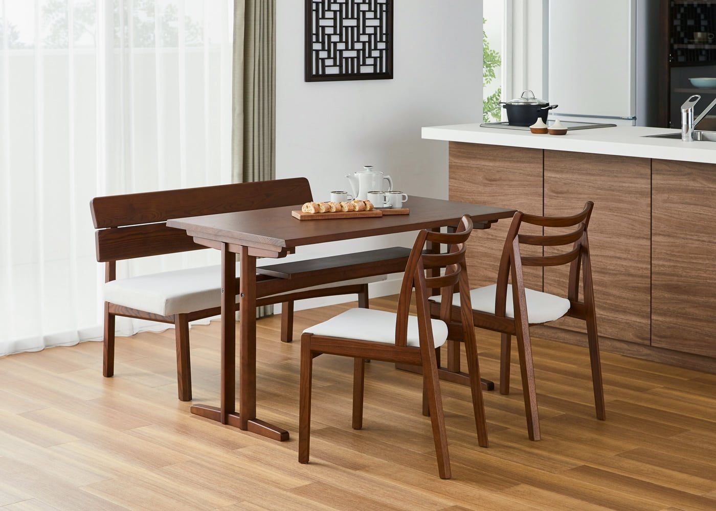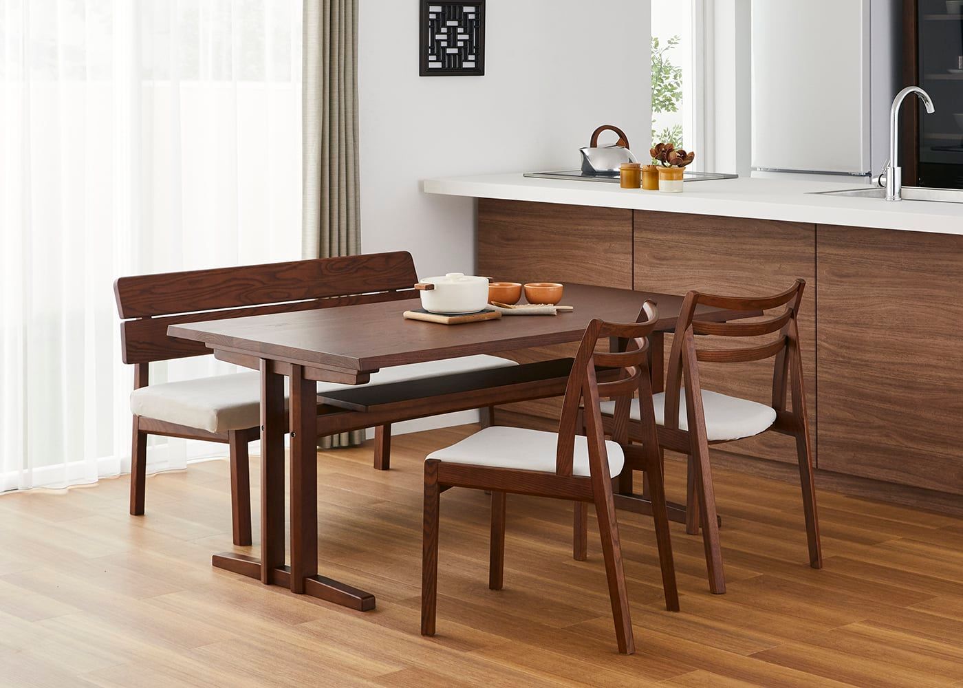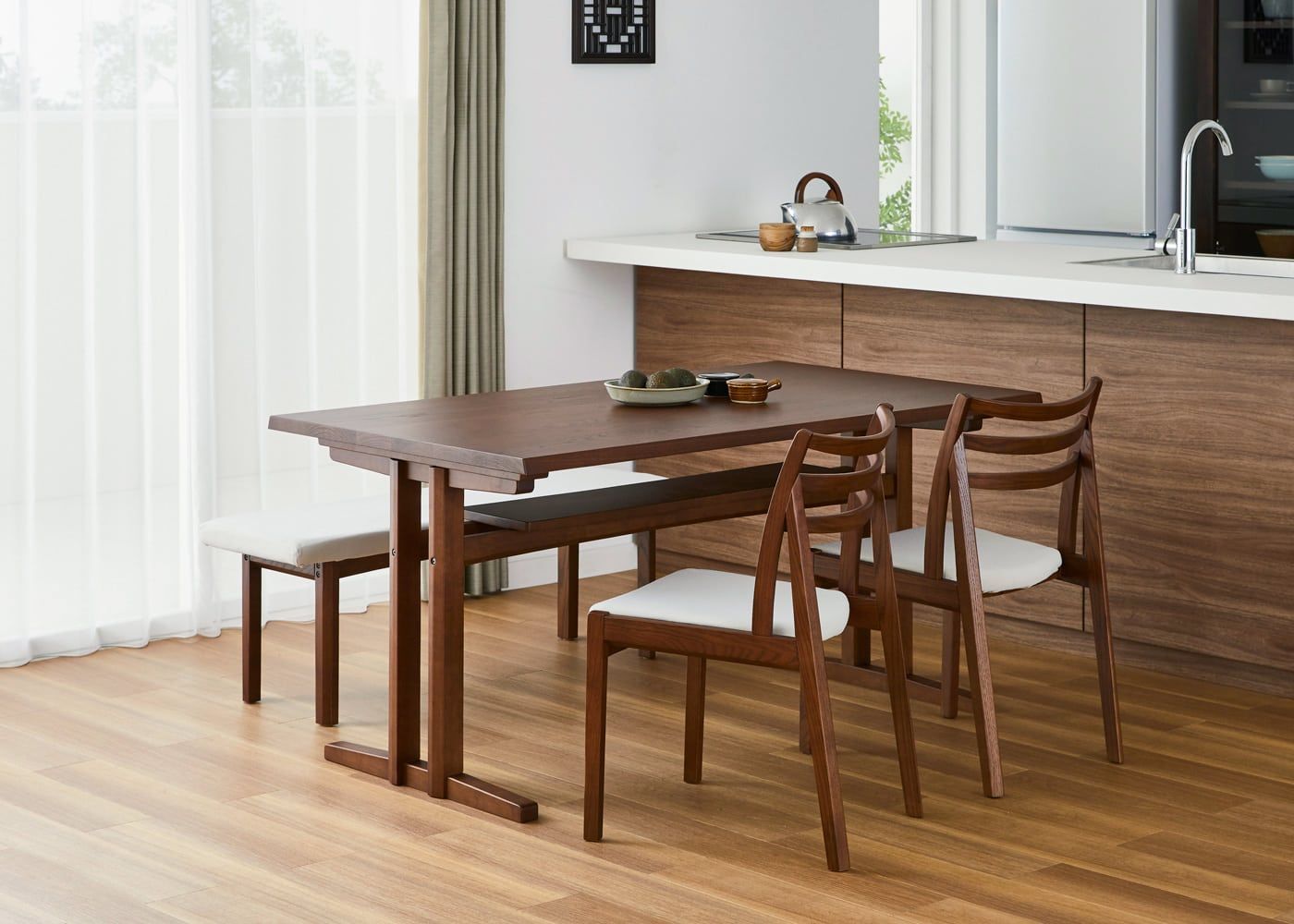 無垢材を用いた美しい曲線と直線が織り成すデザインが、開放的で温もりを感じるアジアンダイニングを演出します。もし、同シリーズのダイニングテーブルと合わせれば、船の上で過ごすような優雅さのあるダイニングを作れるでしょう。(写真は
