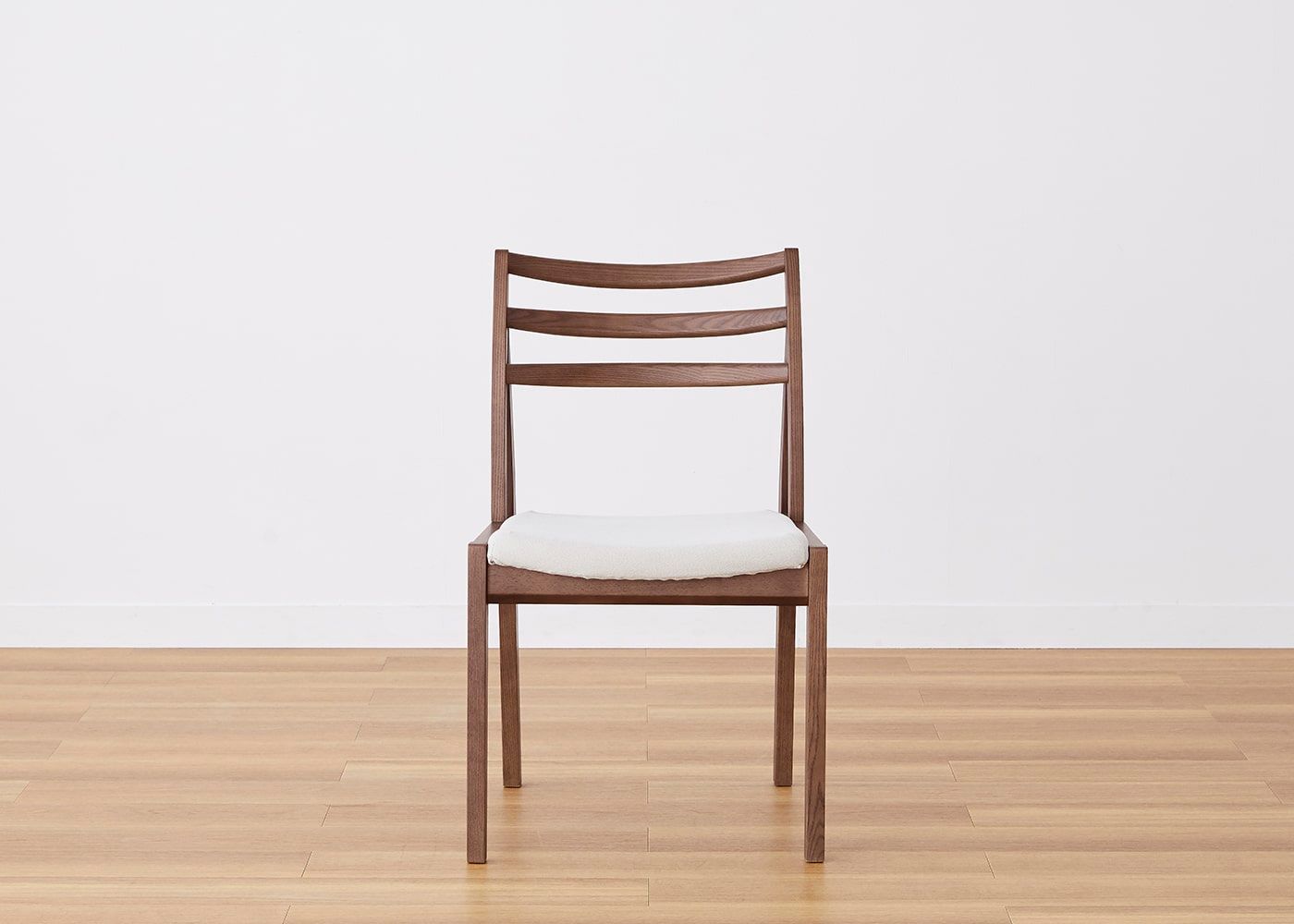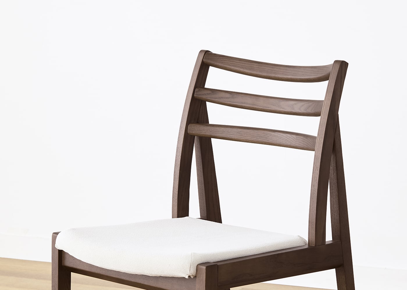 背もたれにはアッシュ無垢材を使用。無垢材でしか感じることのできない、やさしい手触りと木の温もりに癒されます。世界に一つだけの木目をお楽しみください。時を重ねるごとに表情が変化して味わい深くなっていくのも無垢材の魅力です。また、美しい木目を引き出すために、オイルステインを使用したグレインブラウン色を採用しています。