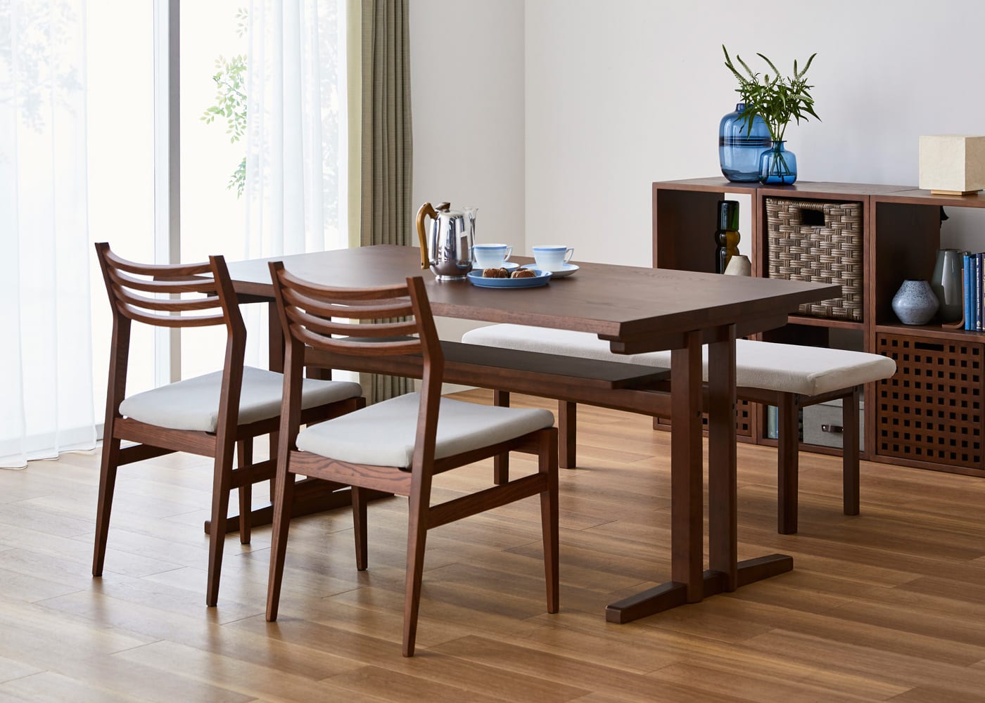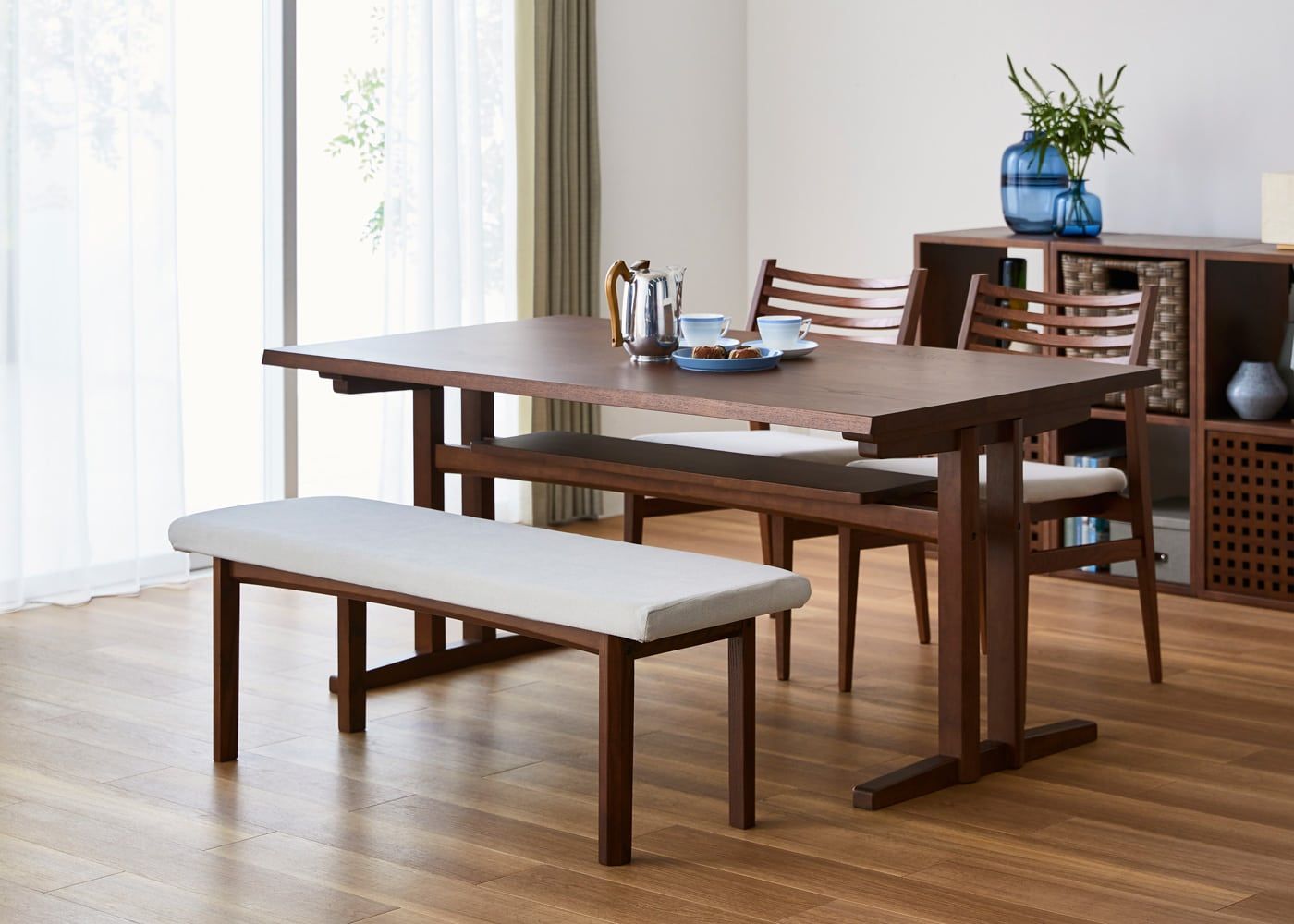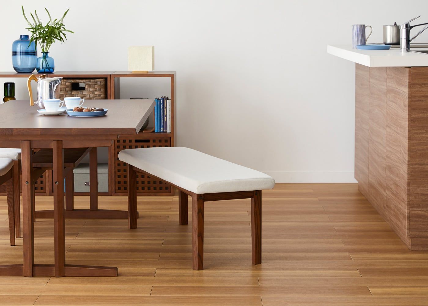 背もたれのないことによる開放感と立ち座りのし易さが特長のウッド・ダイニングベンチv01 (GB)。幅の広い座面で自由にくつろいだり、横に移動できるのもダイニングベンチの大きな魅力です。(写真は420タイプ)