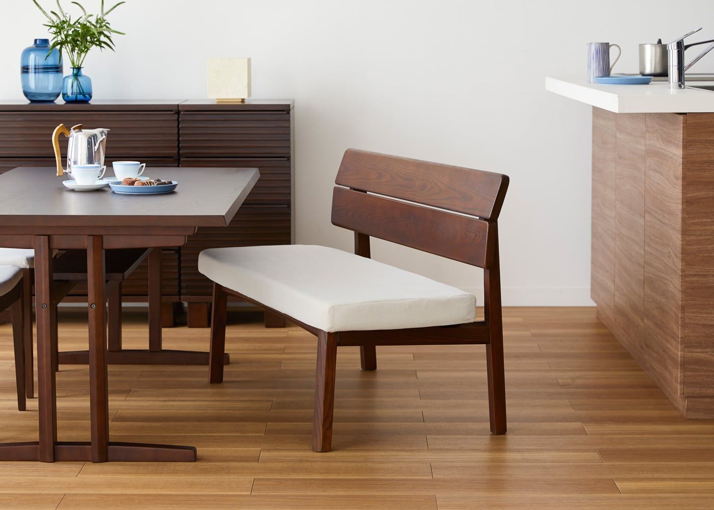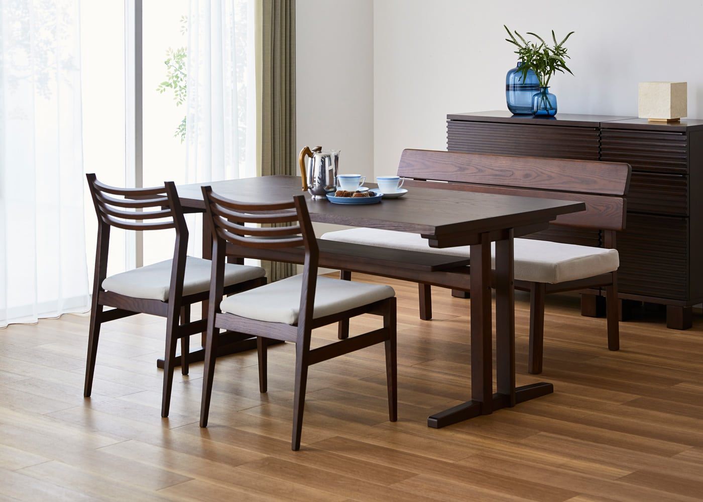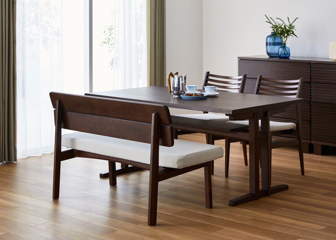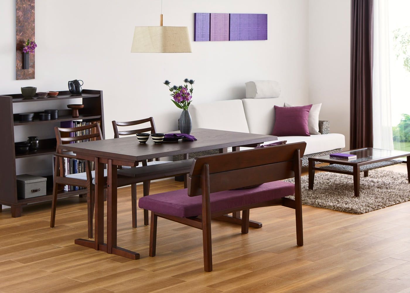 a.flatのダイニングベンチはカバーの着せ替えができるのが魅力。約100色のファブリックから素材や色を選んで、あなただけのカラーコーディネートをお楽しみください。(別売、受注生産)