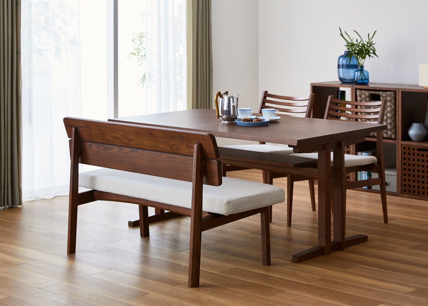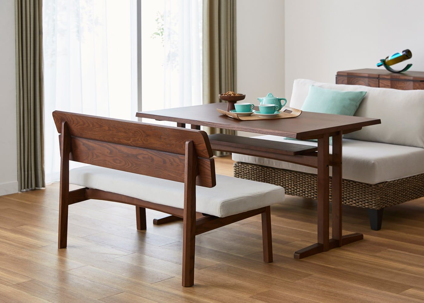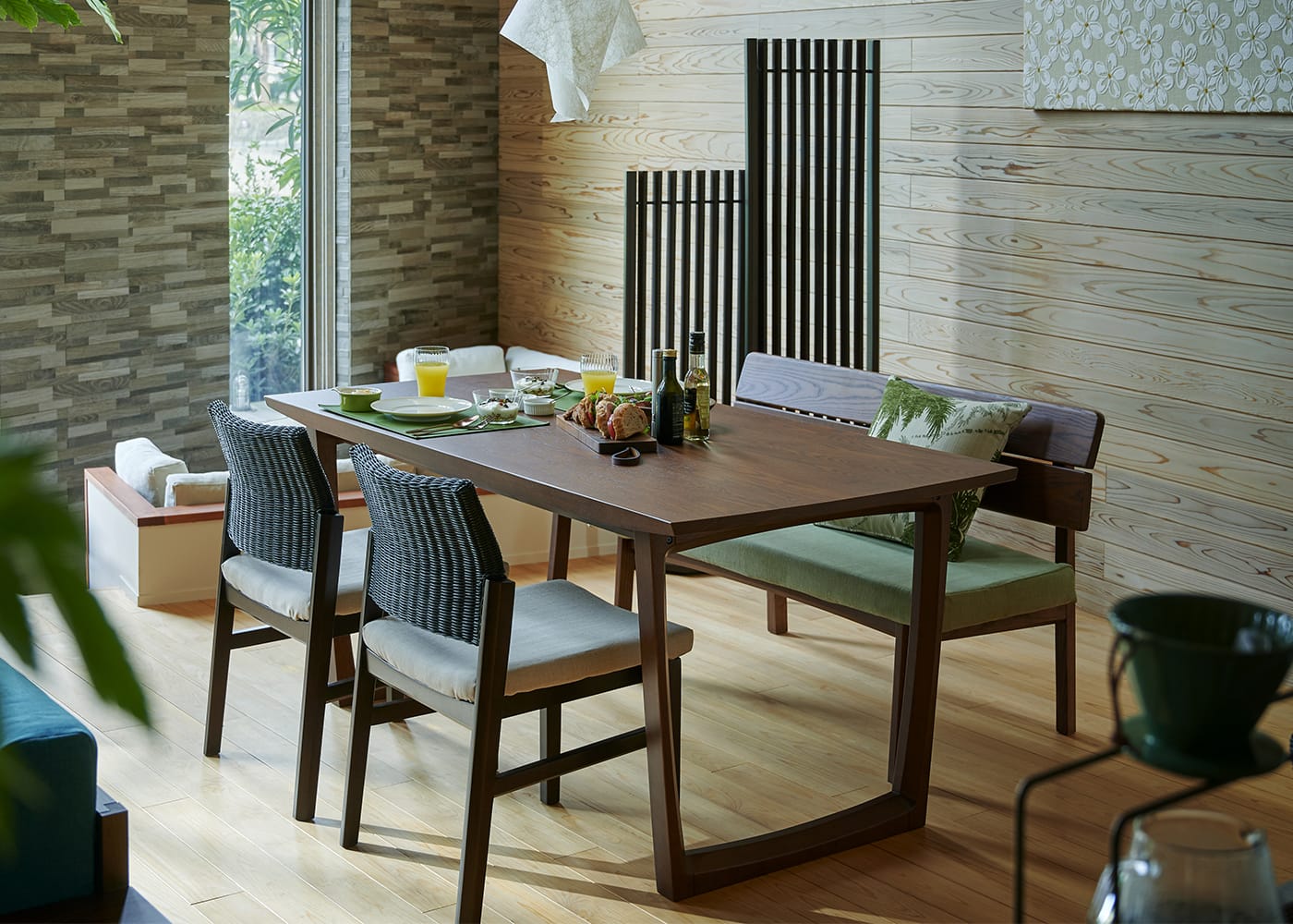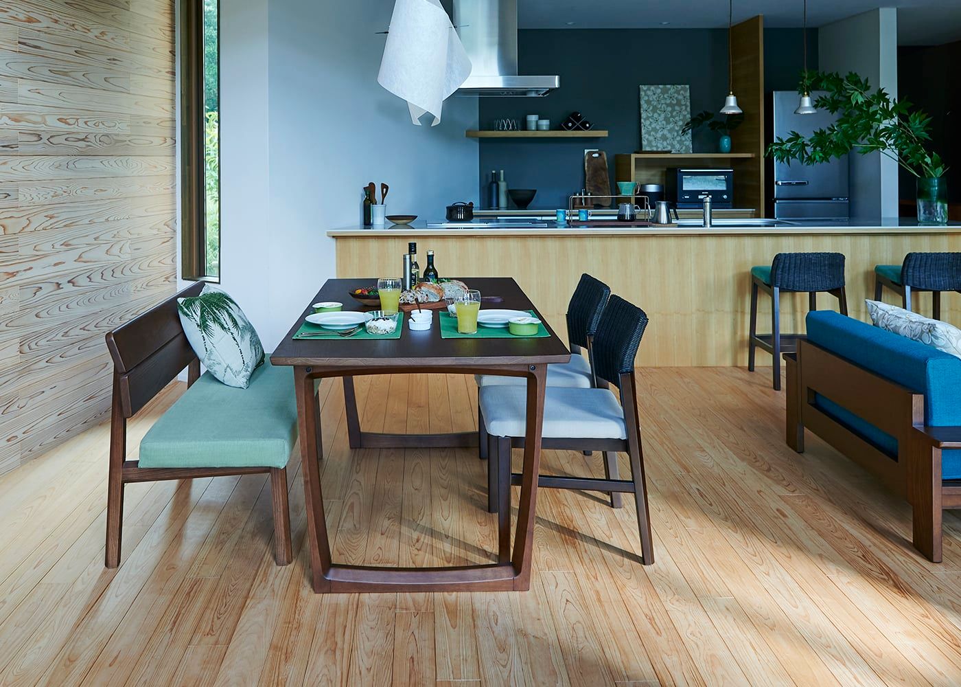 a.flatのダイニングベンチはカバーの着せ替えができるのが魅力。約100色のファブリックから素材や色を選んで、あなただけのカラーコーディネートをお楽しみください。(別売、受注生産)
