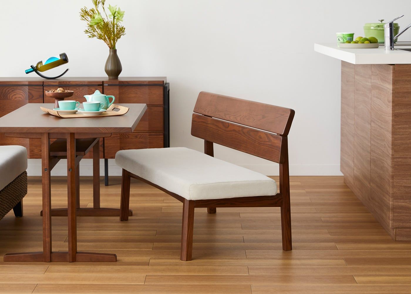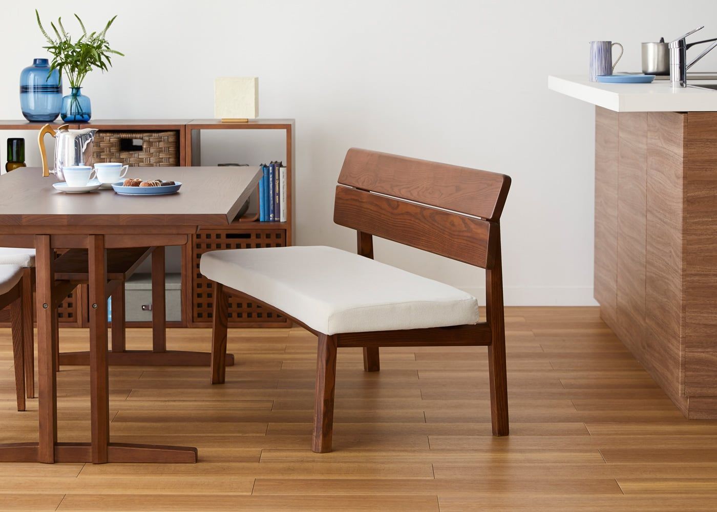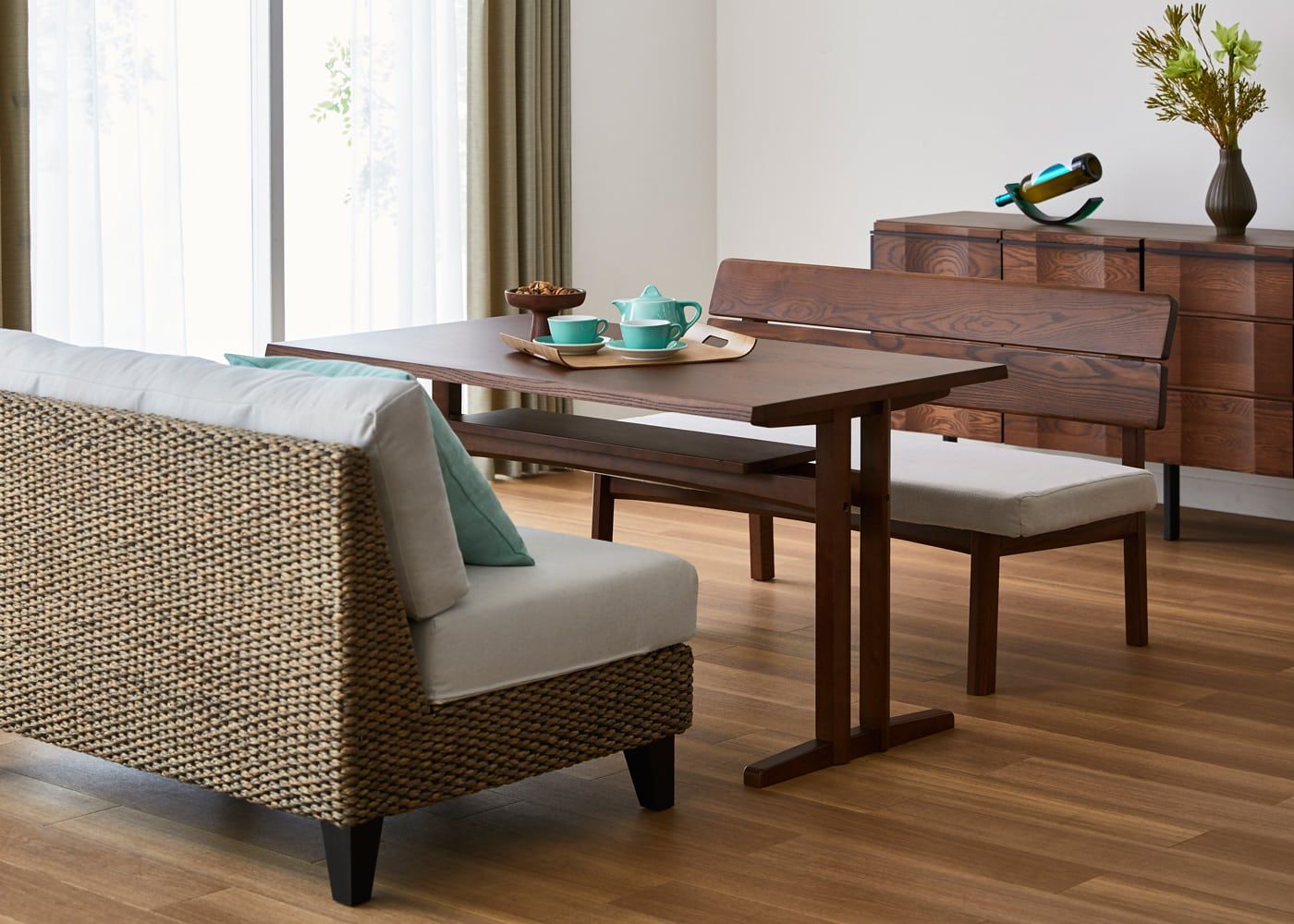 a.flatのダイニングベンチはカバーの着せ替えができるのが魅力。約100色のファブリックから素材や色を選んで、あなただけのカラーコーディネートをお楽しみください。(別売、受注生産)