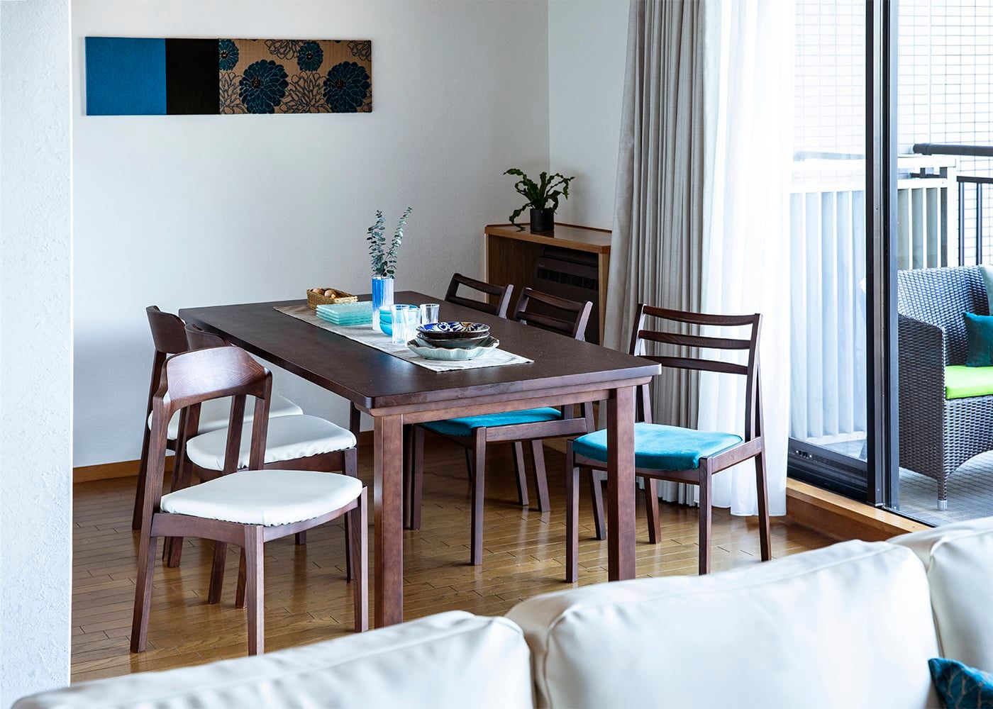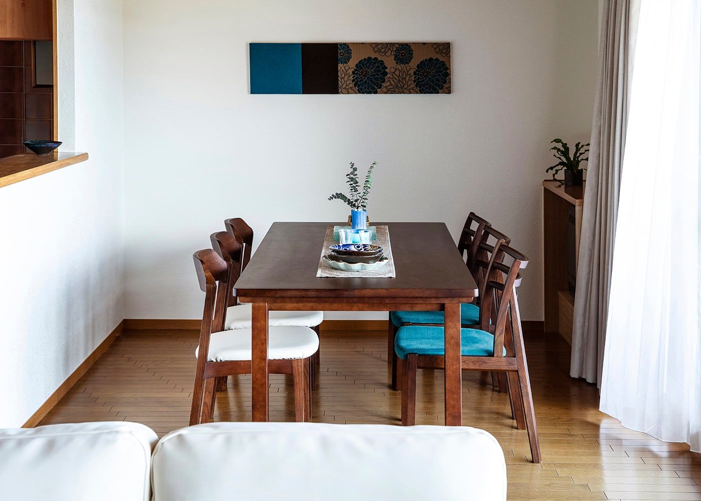 自然豊かな絶景を楽しめる「熱海」に別荘をご購入された実例。ダイニングに使用している家具は、海の情景からインスピレーションを受けたダイニングチェアやカラーを採用しました。