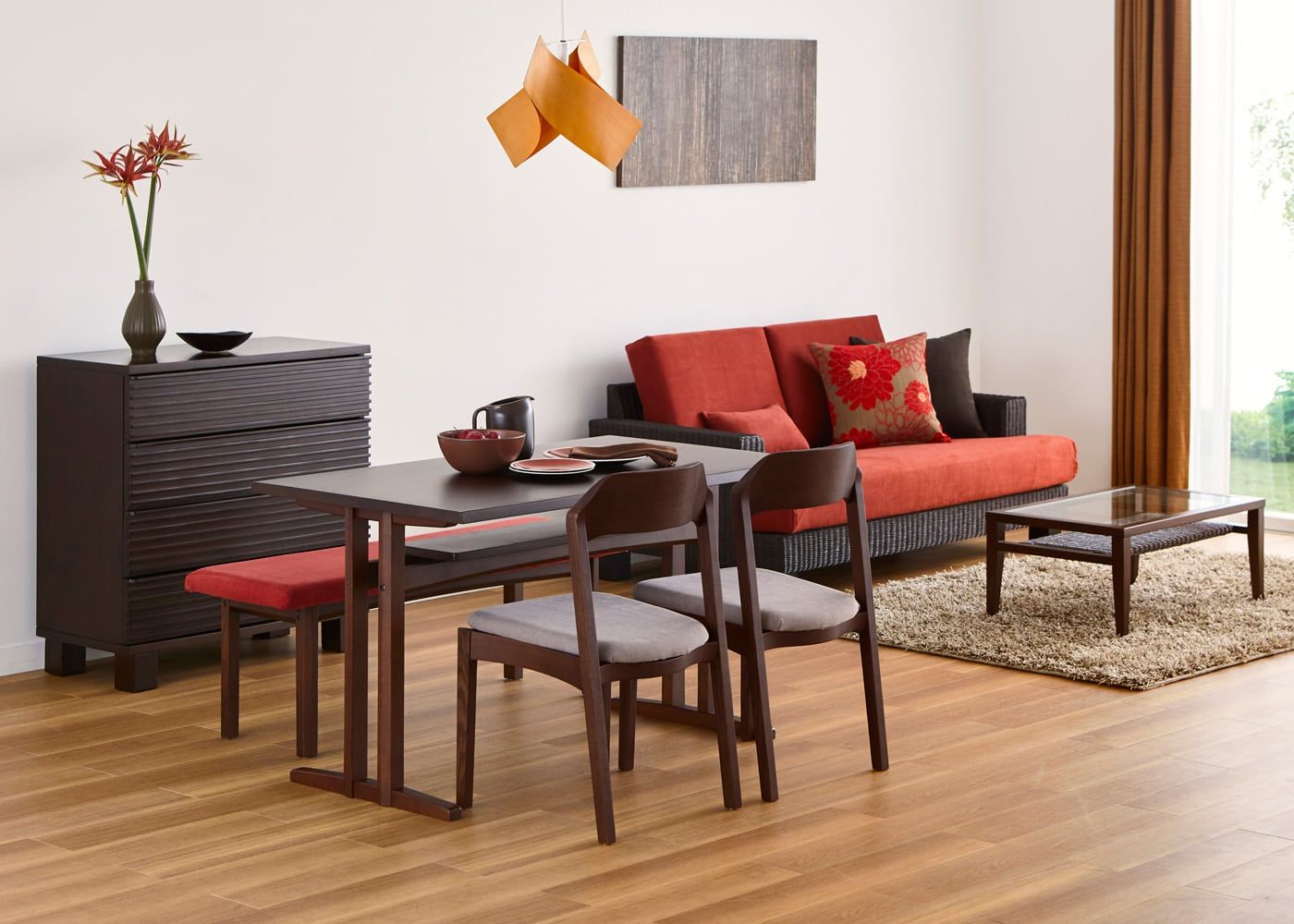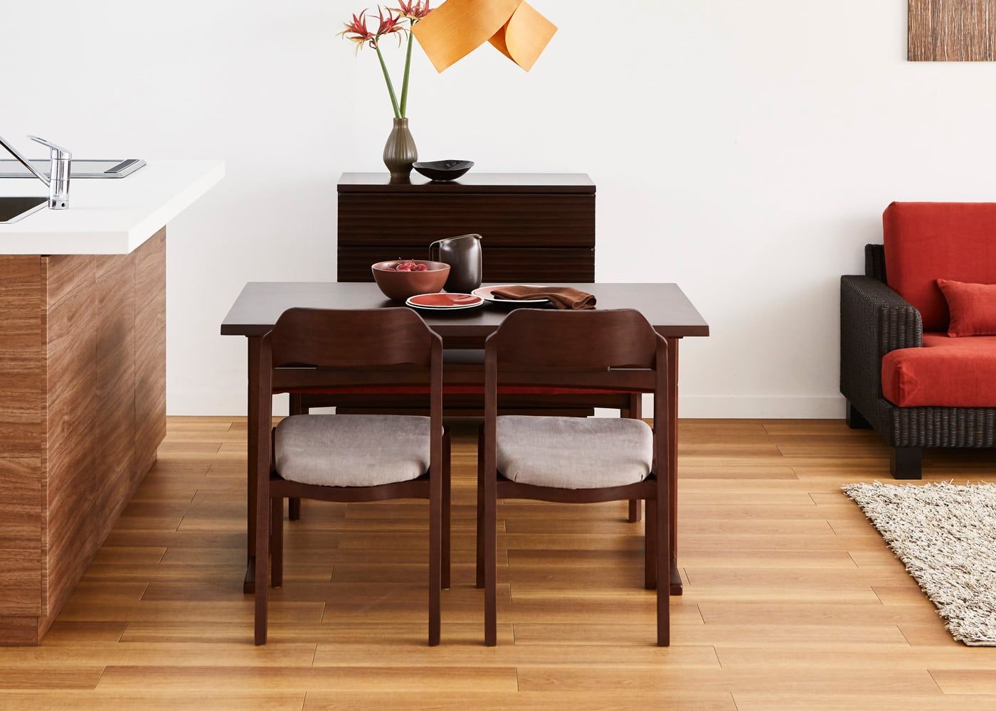 ブラウンとレッドでコーディネートすると、洗練感と温もりあるダイニング空間に。チェアカバーを替えるだけで、お部屋のイメージを簡単に変えられるのが大きな魅力です。(写真は
