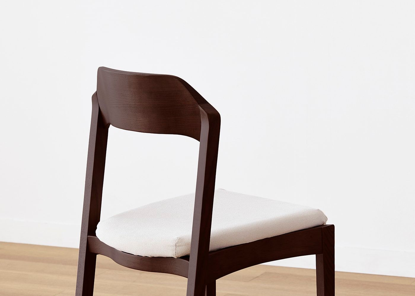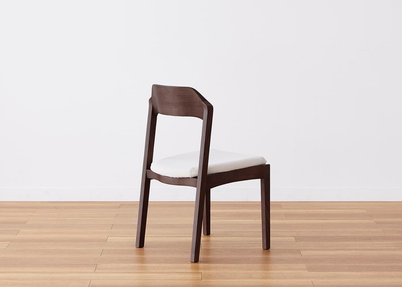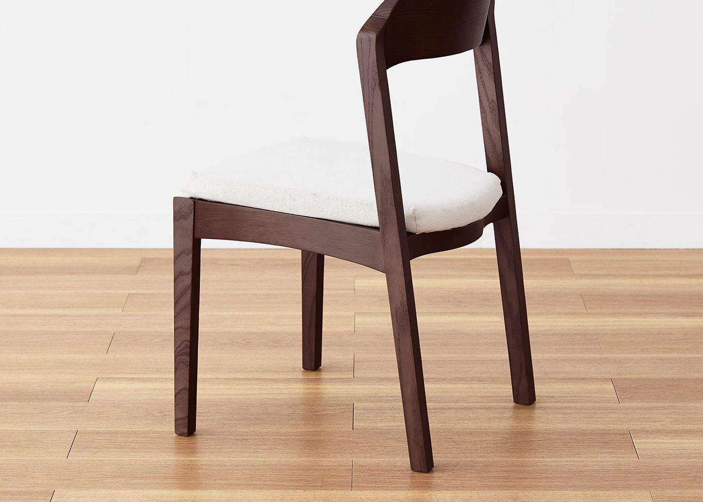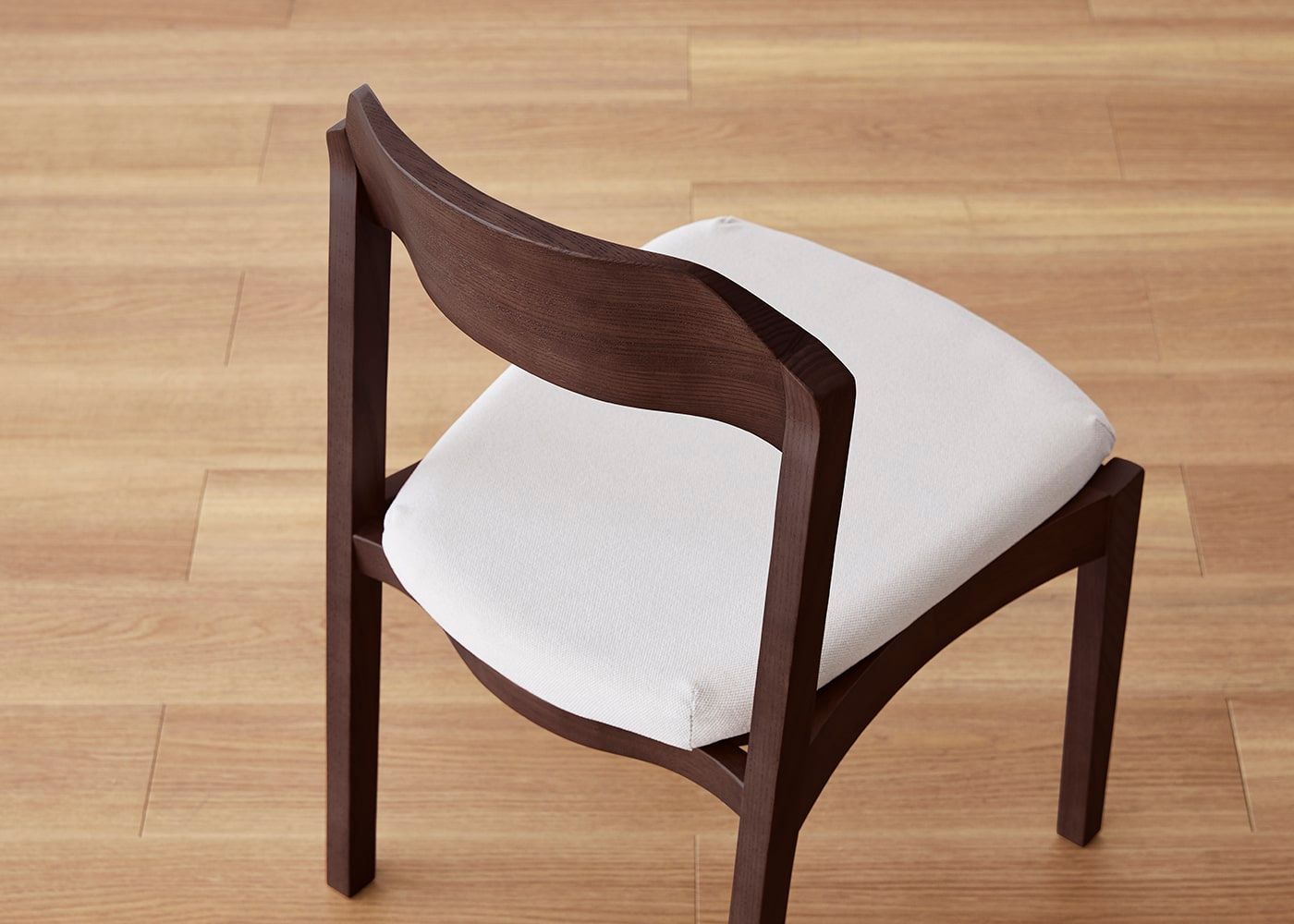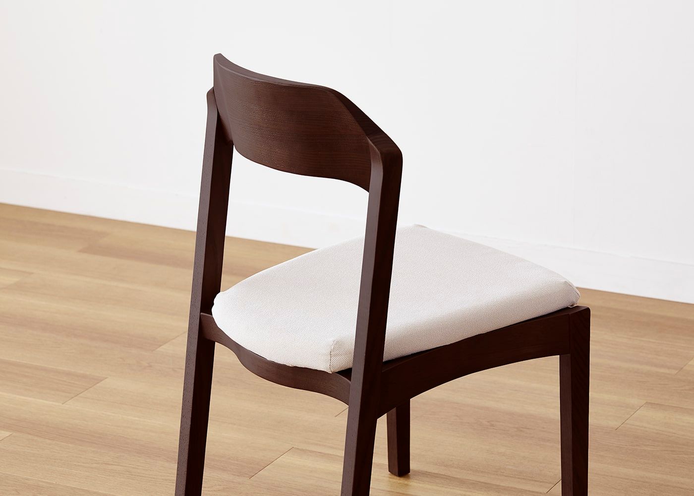 日々の暮らしでリビングからダイニングを見ることが多いため、背面のデザインにもこだわりました。潔い直線の後脚と背、座面や座枠の曲線が調和したコオウならではのディテールです。また、座面の後ろ側の抜けと脚に貫材のない構造が脚長効果をもたらし、すっきりとした佇まいに。