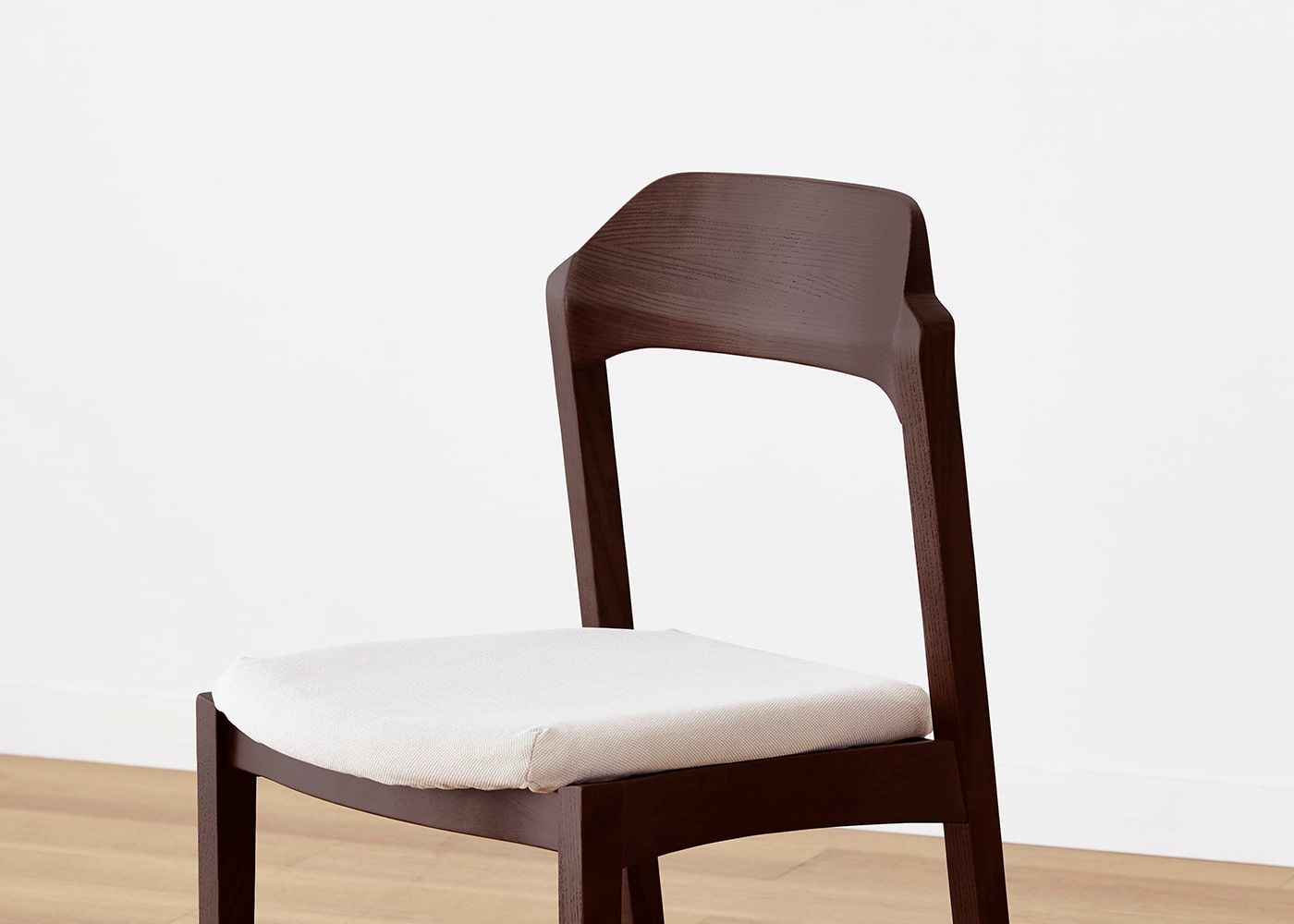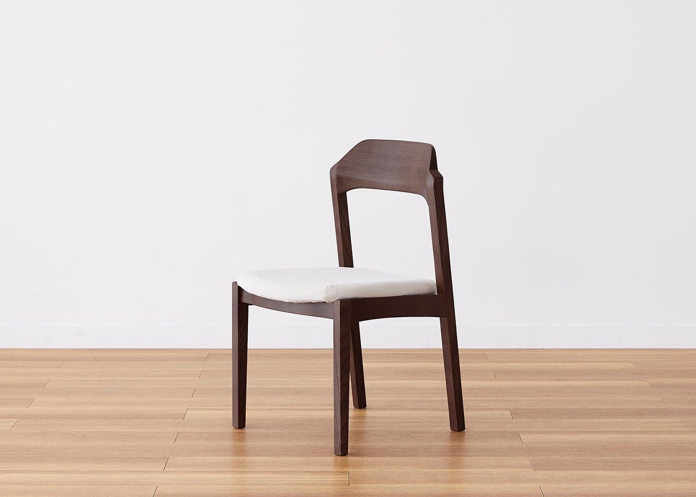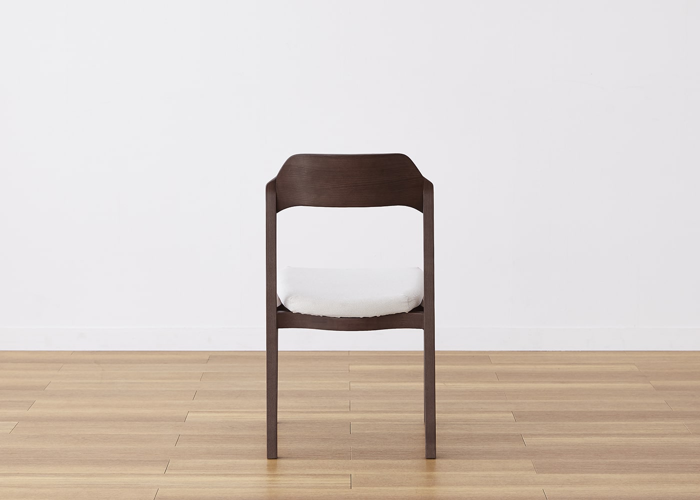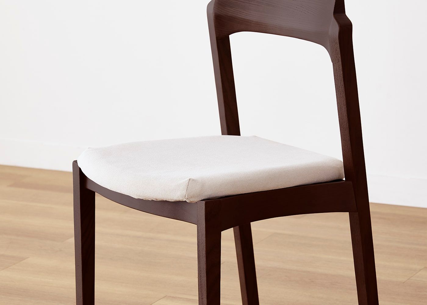 日々の暮らしでリビングからダイニングを見ることが多いため、背面のデザインにもこだわりました。潔い直線の後脚と背、座面や座枠の曲線が調和したコオウならではのディテールです。また、座面の後ろ側の抜けと脚に貫材のない構造が脚長効果をもたらし、すっきりとした佇まいに。