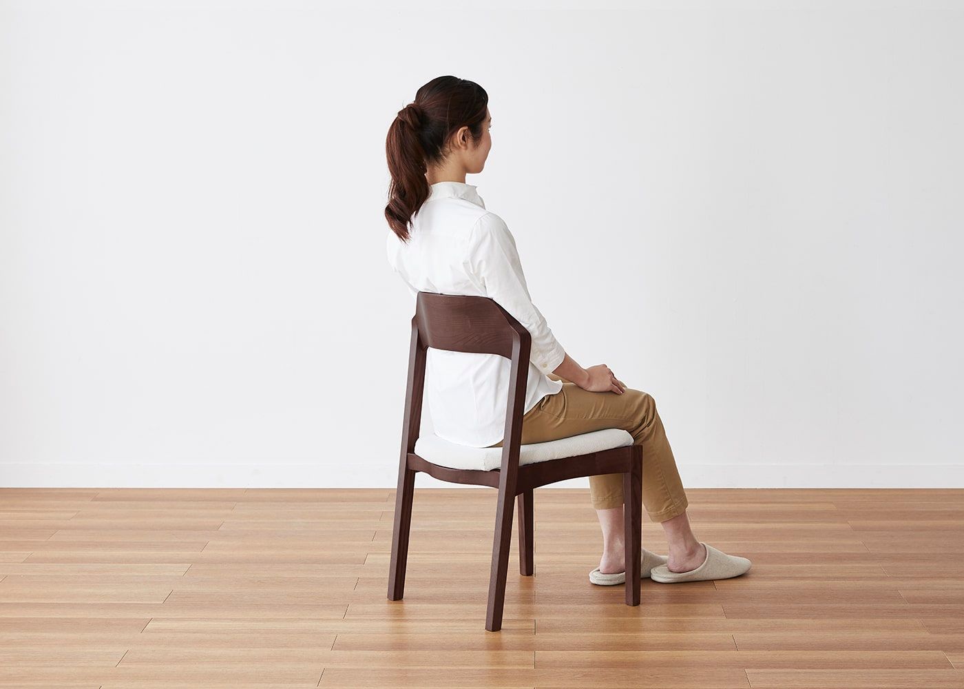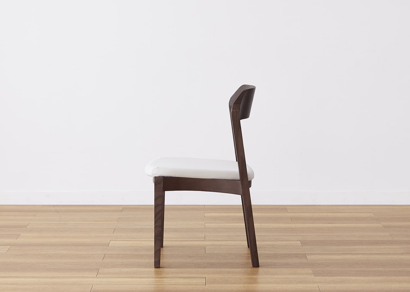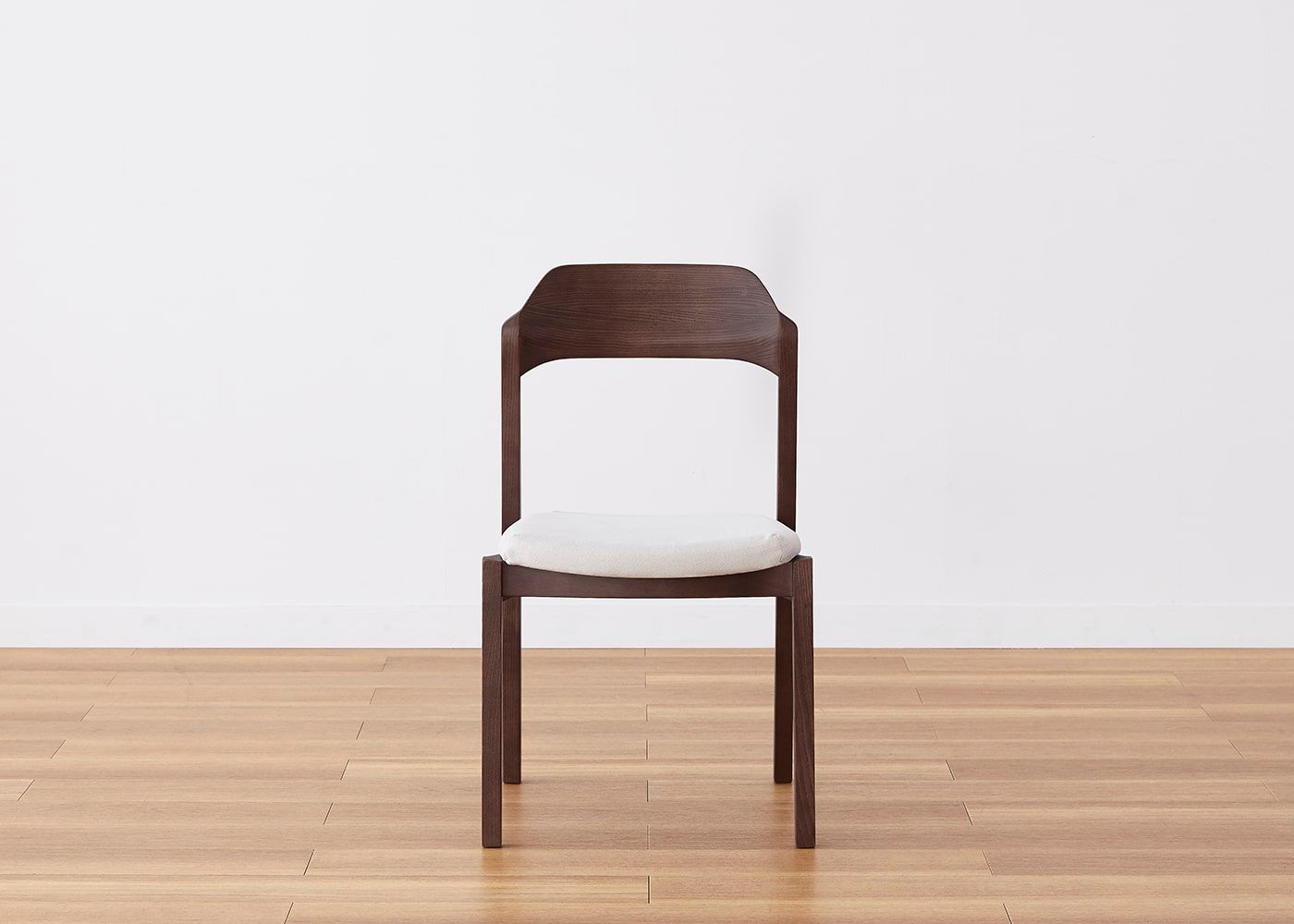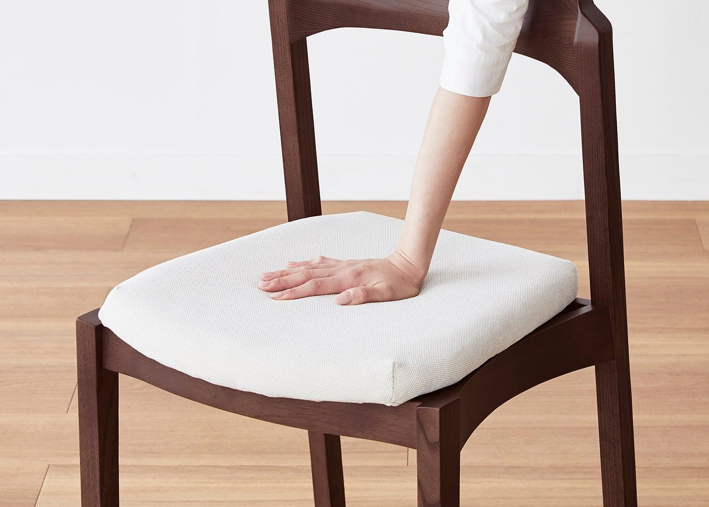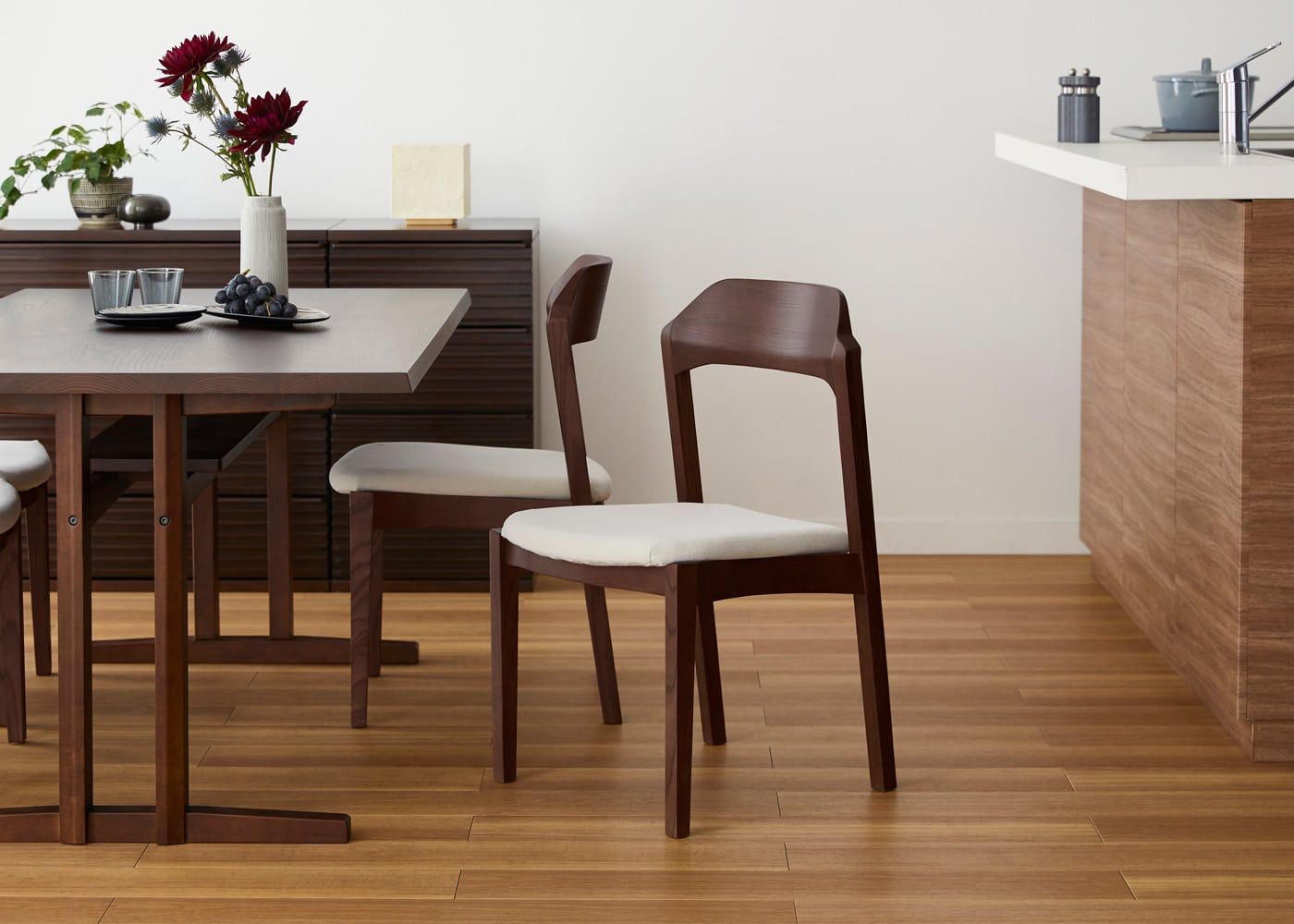 日々の暮らしでリビングからダイニングを見ることが多いため、背面のデザインにもこだわりました。潔い直線の後脚と背、座面や座枠の曲線が調和したコオウならではのディテールです。また、座面の後ろ側の抜けと脚に貫材のない構造が脚長効果をもたらし、すっきりとした佇まいに。