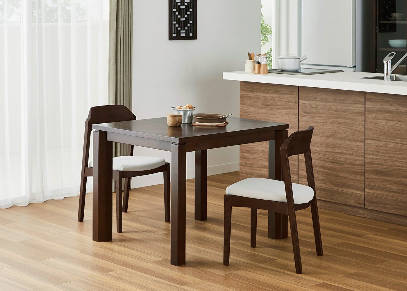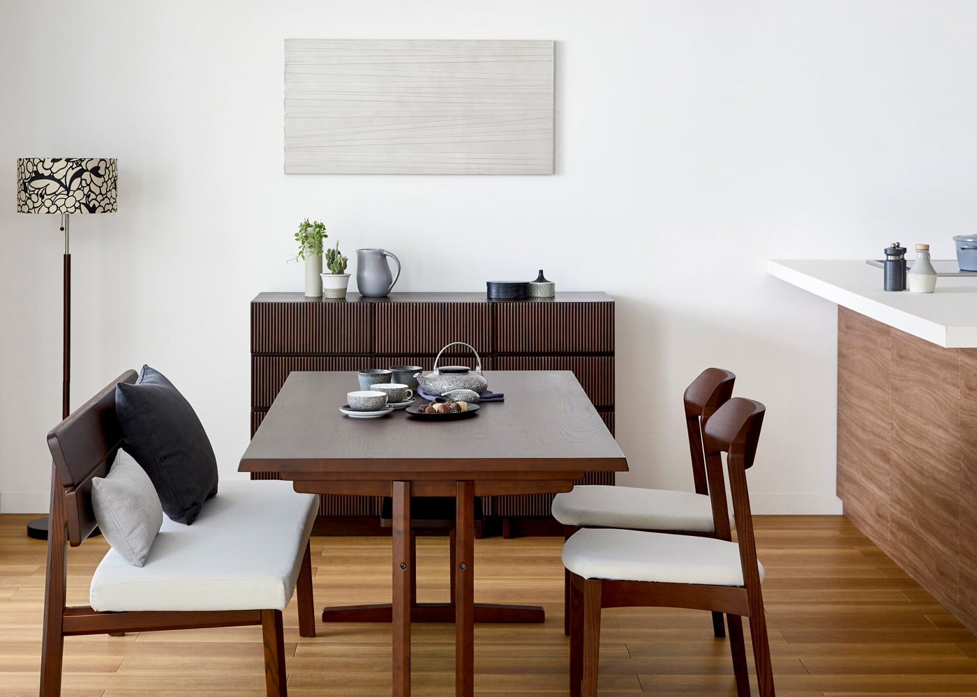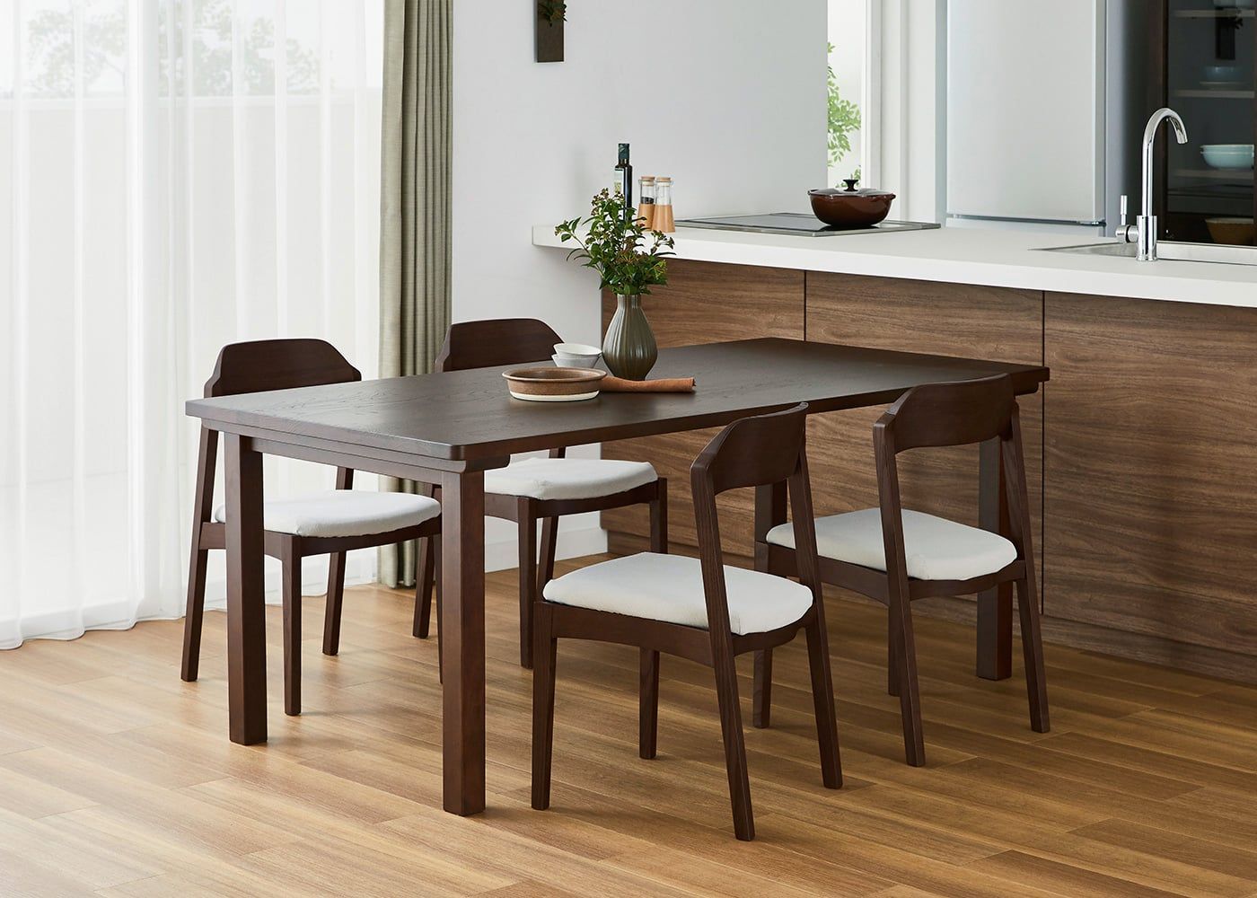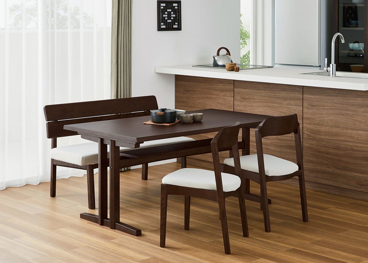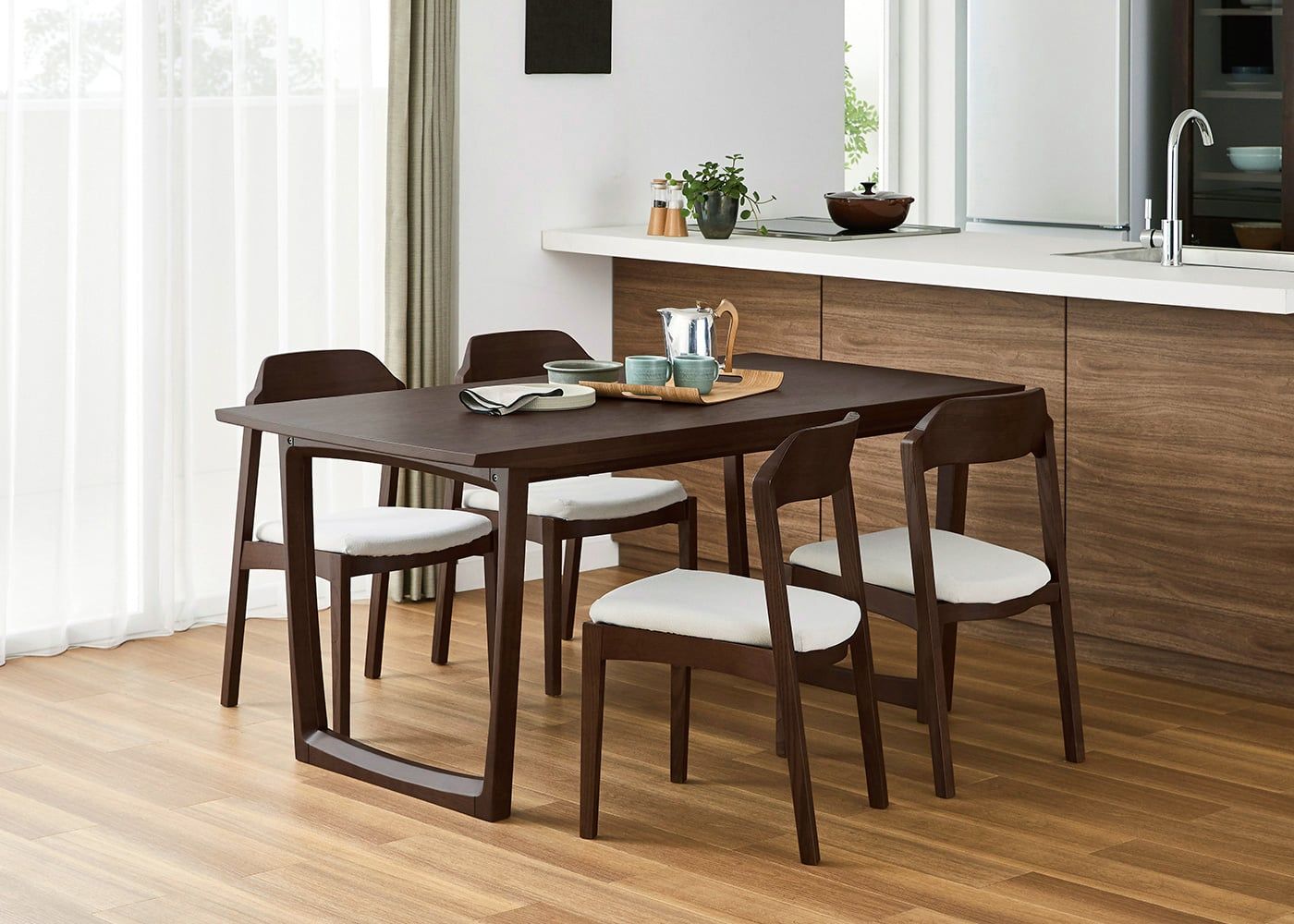 日々の暮らしでリビングからダイニングを見ることが多いため、背面のデザインにもこだわりました。潔い直線の後脚と背、座面や座枠の曲線が調和したコオウならではのディテールです。また、座面の後ろ側の抜けと脚に貫材のない構造が脚長効果をもたらし、すっきりとした佇まいに。