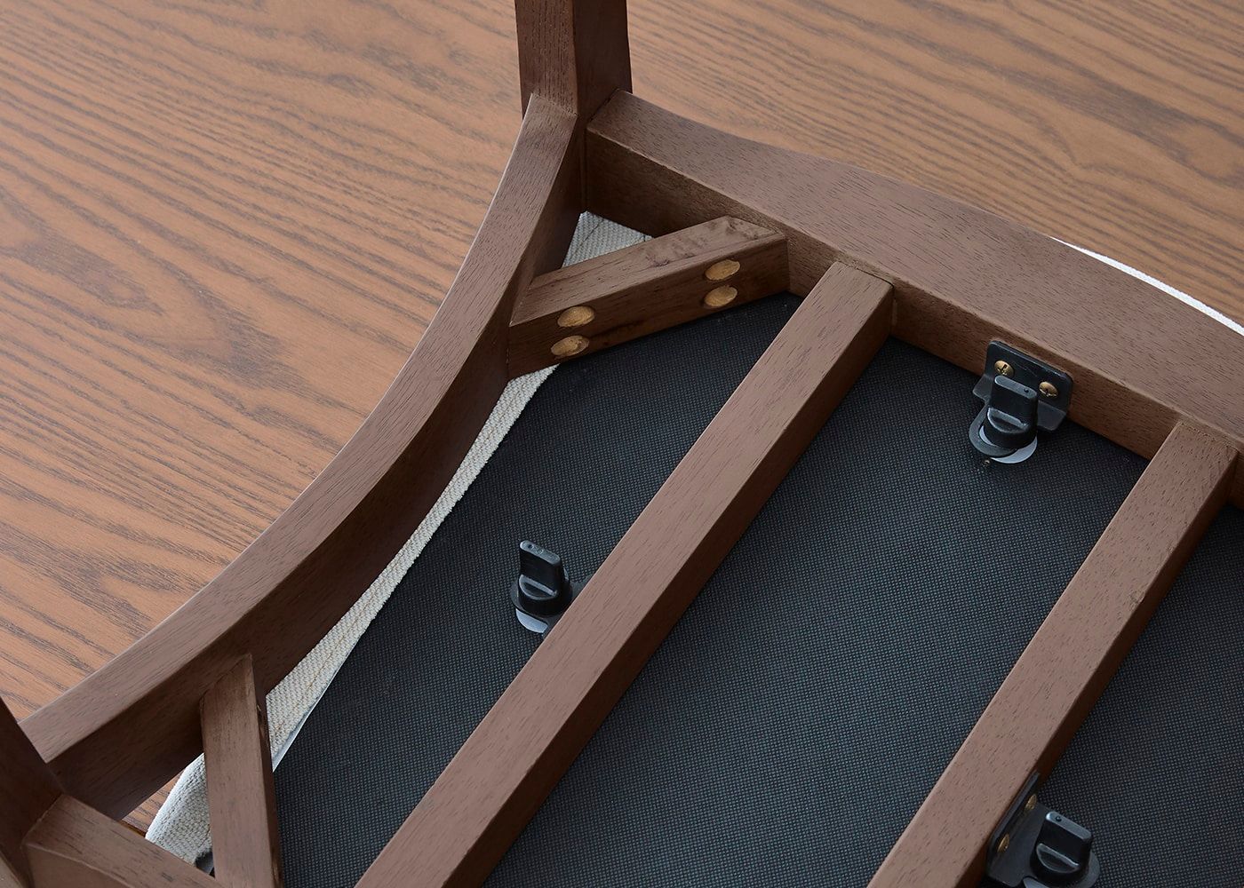 座面は本体フレームとネジで固定されたシンプルな設計です。チェアカバーを交換する時に、工具を使わずに指でネジを回すだけで簡単に座面を外すことができるのがa.flatチェアの特長です。