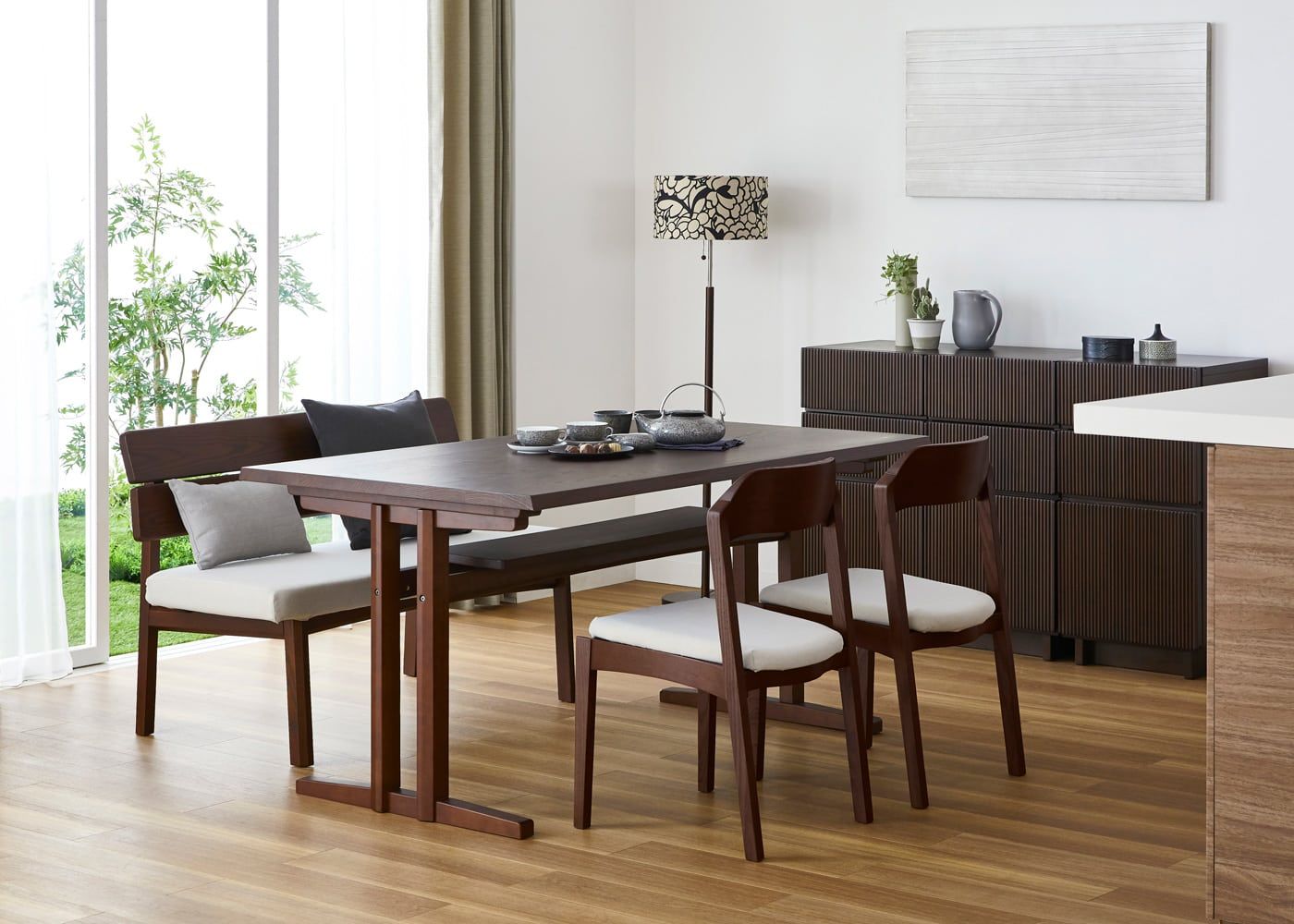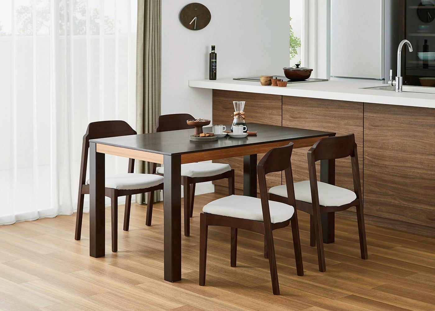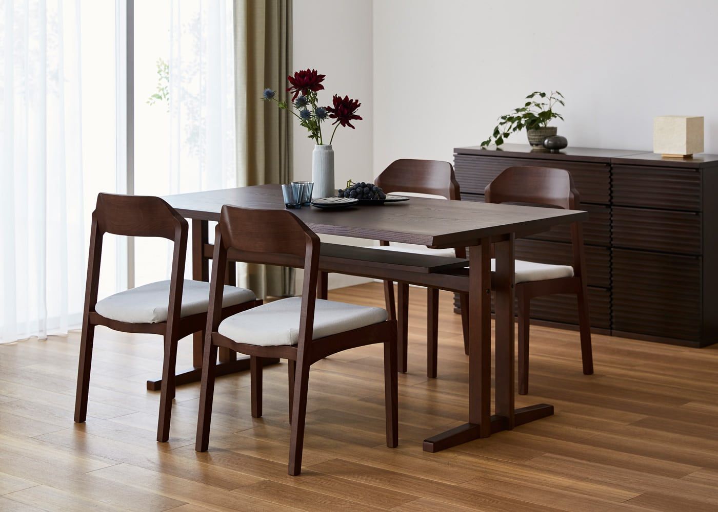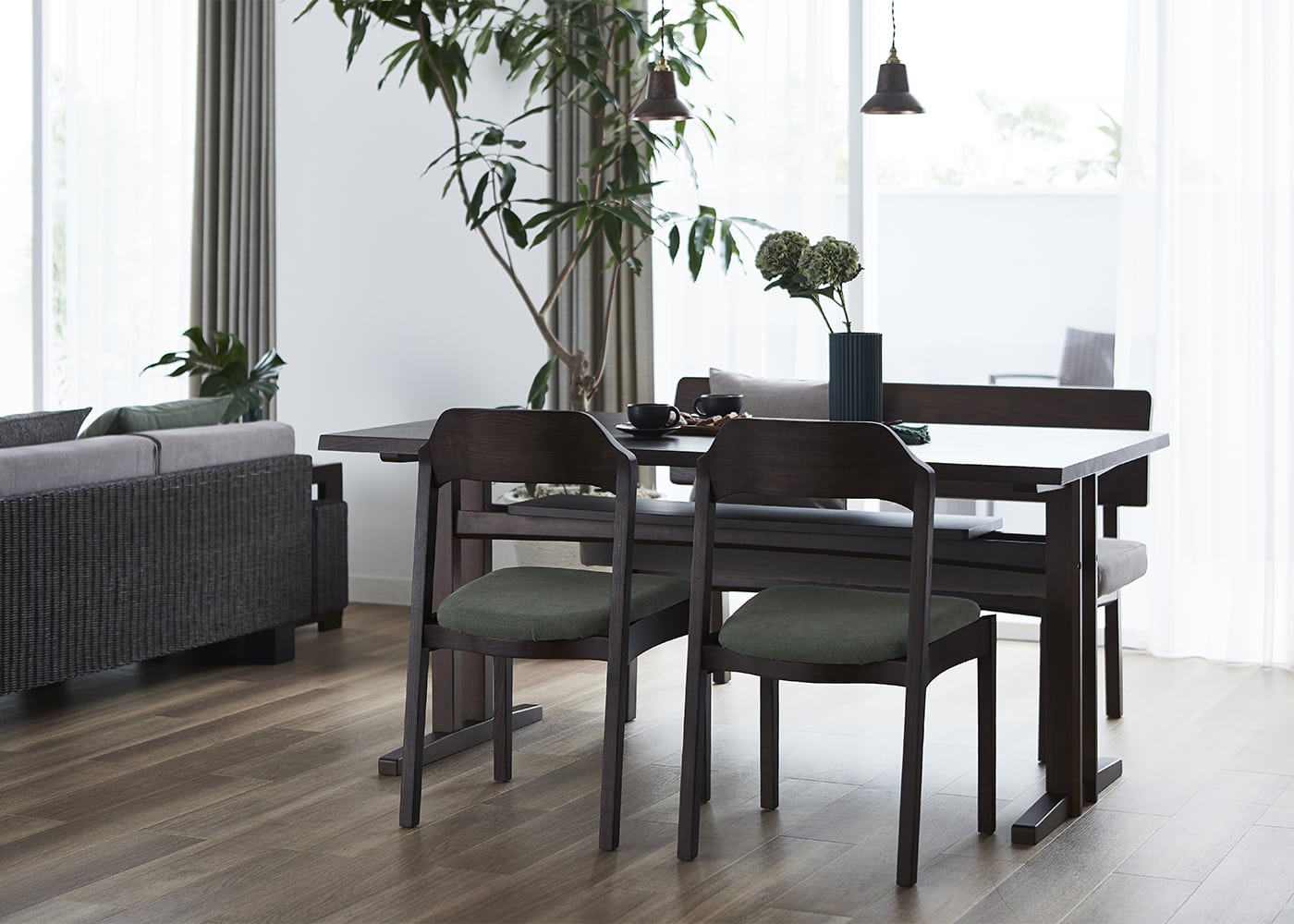 シックなグレーでコーディネートすれば、ダークブラウンの色合いや素材感が際立つ、モダンな印象のダイニングで食事を楽しむこともできます。(写真は