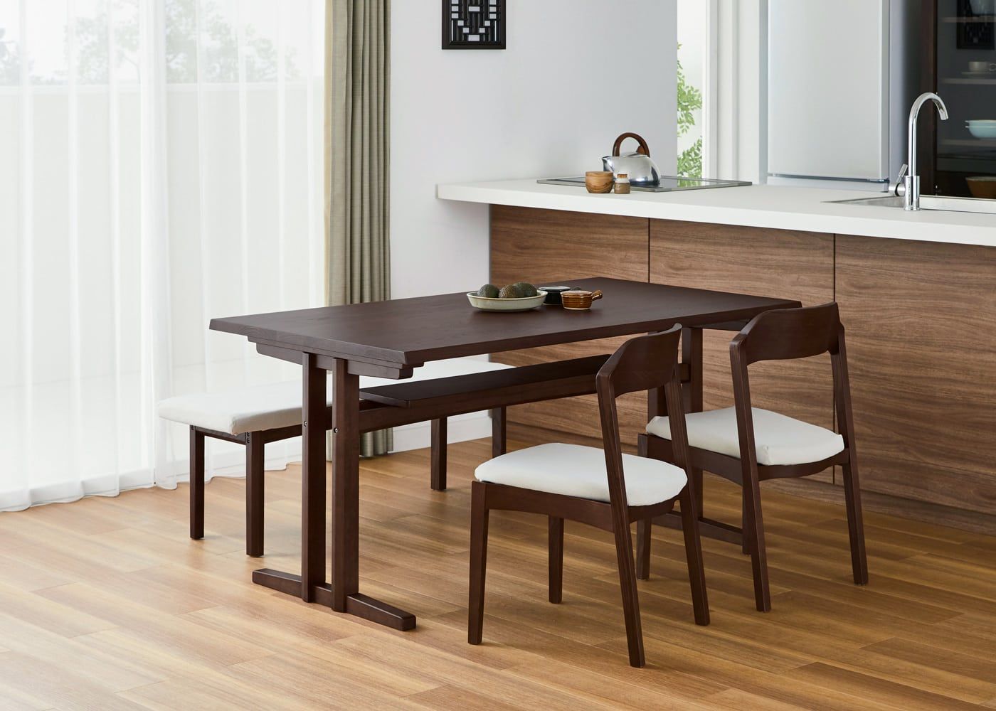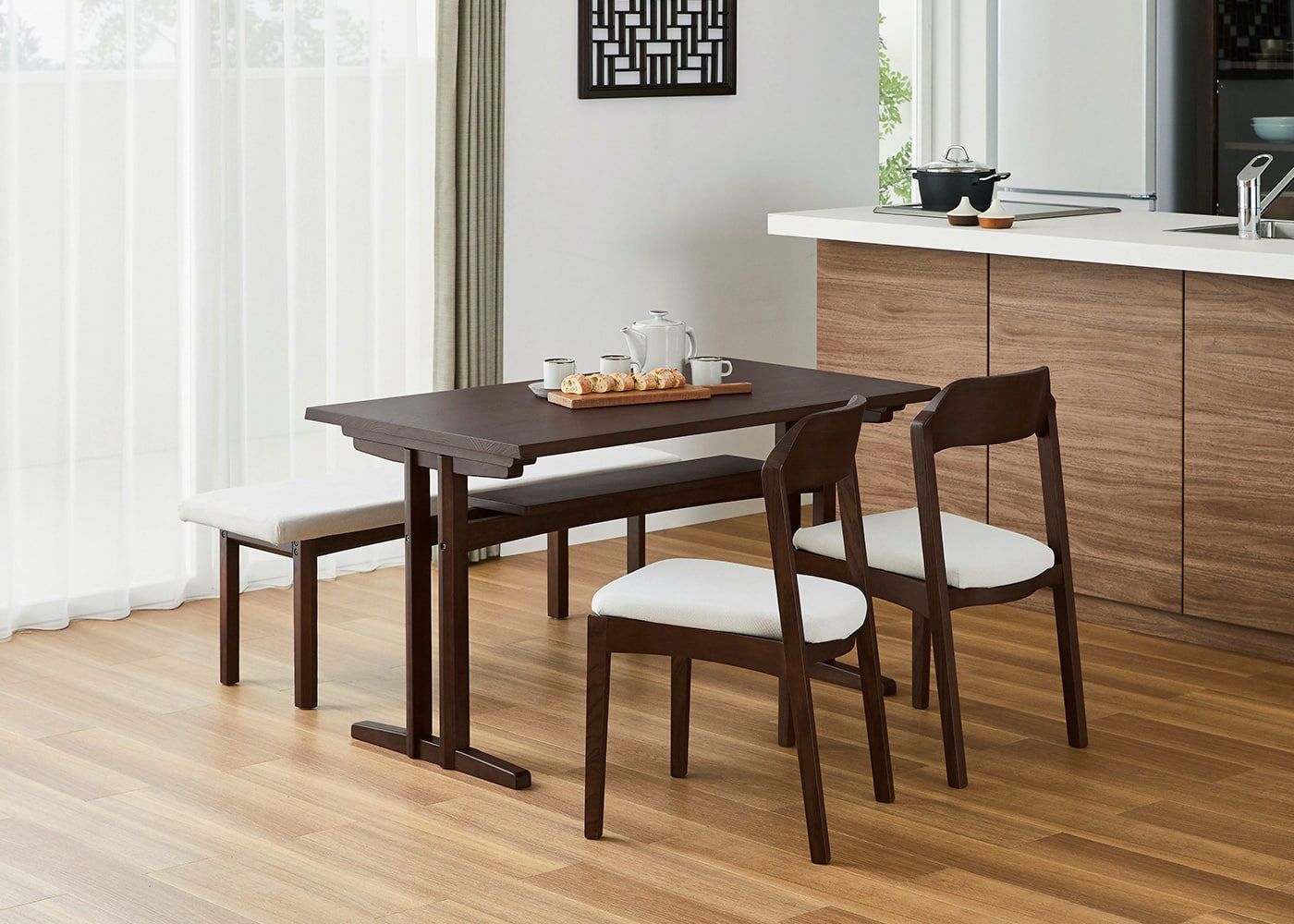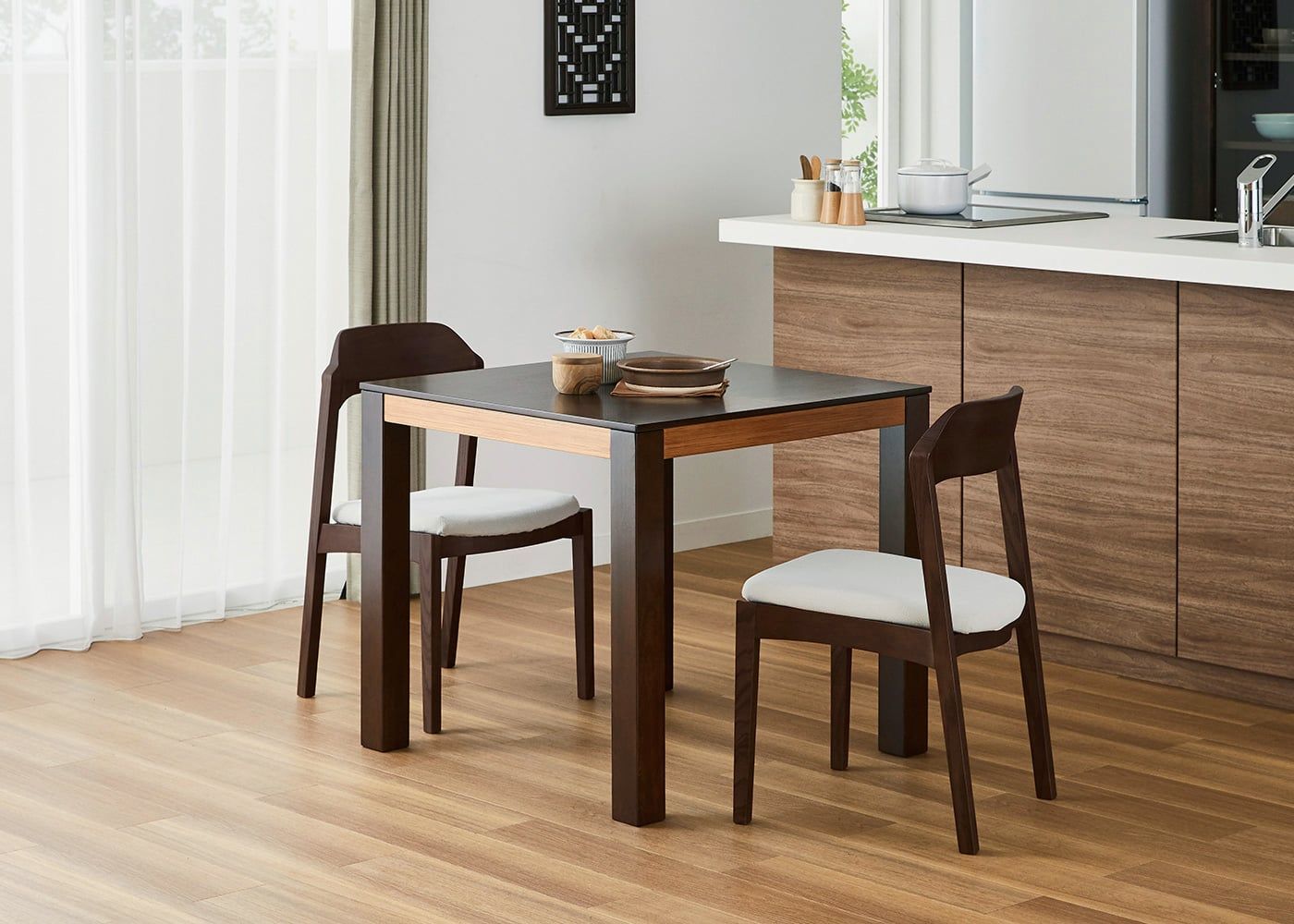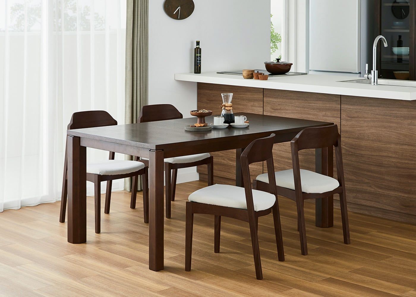シックなグレーでコーディネートすれば、ダークブラウンの色合いや素材感が際立つ、モダンな印象のダイニングで食事を楽しむこともできます。(写真は