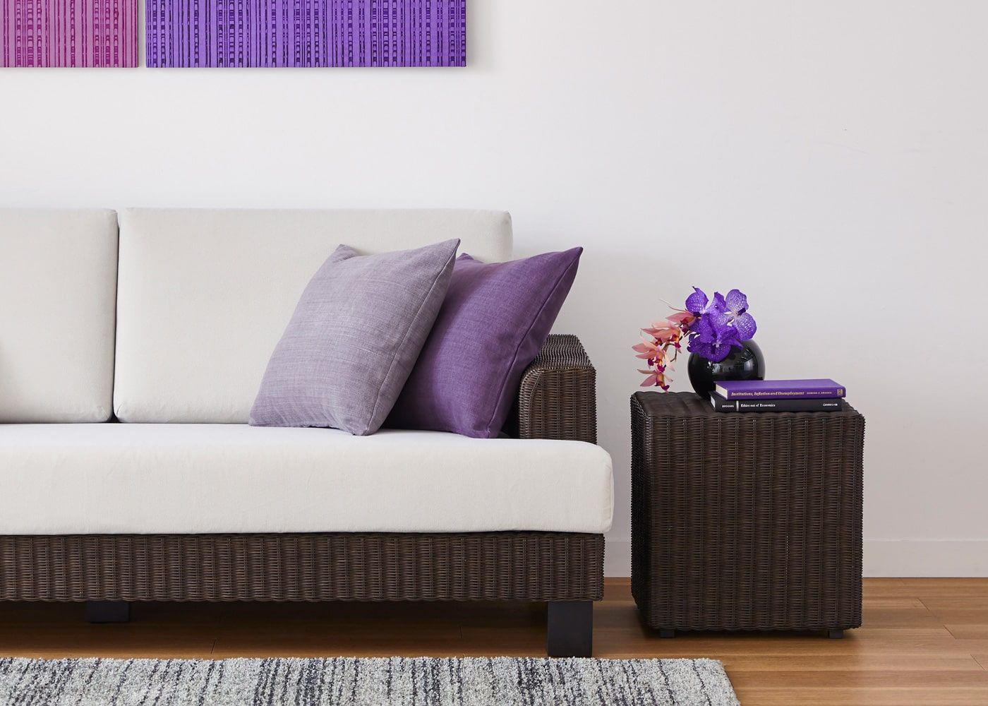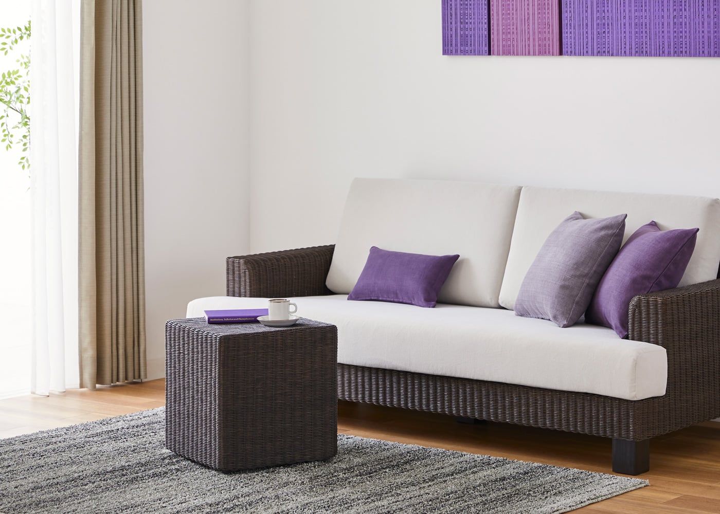 ソファ前に置けば簡易的なローテーブルとしても利用できる、マルチなスツールです。ラタンと相性の良いパープルでコーディネートすれば、大人っぽい空間のリビングを演出できます。(写真は